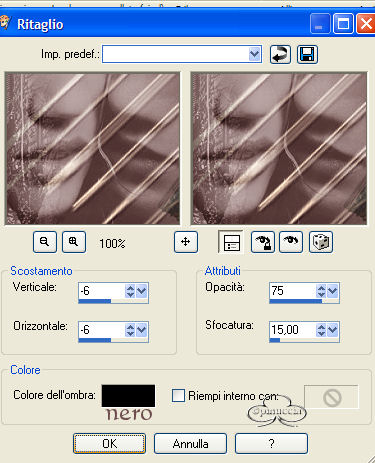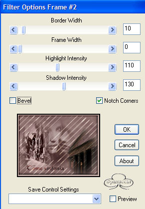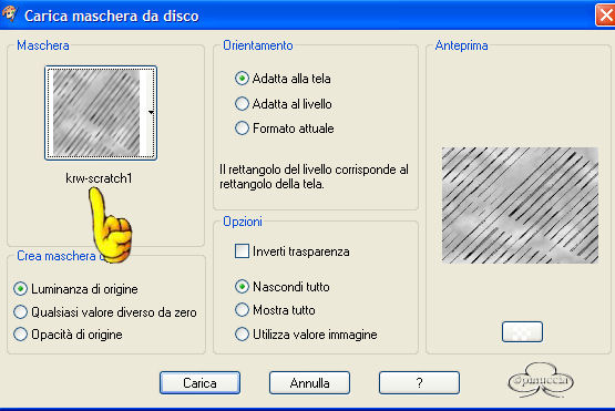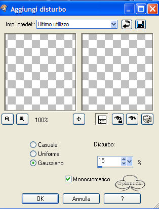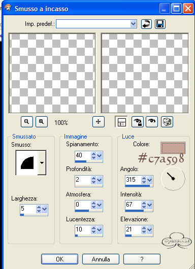 qui puoi trovare qualche risposta ai tuoi dubbi. Se l'argomento che ti interessa non è presente, ti prego di segnalarmelo. Questo tutorial è stato scritto con PSP 9. Occorrente: Filtro Bordemania qui Filtro Simple qui Filtro FM Tile Tools qui Materiale qui 1. Imposta il colore di primo piano con #f5e2d4 e il colore di sfondo con #6f4d4f. 2. Apri una nuova immagine trasparente 640 x 480. 3. Riempi l'immagine con il colore di primo piano.4. Livelli>Nuovo livello raster. 5. Riempi il livello con il colore di sfondo.6. Livelli>Carica/Salva maschera>Carica maschera da disco. Cerca e carica la maschera krw-scratches1. ![]() 7. Livelli>Unisci>Unisci tutto (appiattisci). 8. Effetti>Plugins>FM Tile Tools - Blend emboss, con i settaggi standard: ![]() 8a. Duplica questo sfondo premendo sulla tastiera Shift+D e mettilo da parte. 9. Apri il mist krw-pantheon e vai a Modifica>Copia. 10. Torna al tuo lavoro e vai a Modifica>Incolla>Incolla come nuovo livello. 11. Nella paletta dei livelli cambia la modalità di miscelatura in Moltiplica e spostalo sul lato destro.12. Apri il mist krw-assisi road e vai a Modifica>Copia. 13. Ritorna al tuo lavoro e vai a Modifica>Incolla>Incolla come nuovo livello. 14. Nella paletta dei livelli cambia la modalità di miscelatura in Luminanza (esistente) e spostalo sul lato sinistro.15. Apri il mist krw-couple5. Duplicalo premendo Shift+D e chiudi l'originale. 16. Immagine>Ridimensiona, del 75%, tutti i livelli non selezionato: ![]() 17. Modifica>Copia. Ritorna al tuo lavoro e vai a Modifica>Incolla>Incolla come nuovo livello. 18. Nella paletta dei livelli cambia la modalità di miscelatura in Luce diffusa. 19. Attiva lo strumento Testo , cerca il font Calligraph421BT, , con i seguenti settaggi:![]() 20. Scrivi: Come Sinfonia. 21. Posiziona il testo e Converti il livello vettore in livello raster. 22. Nella paletta dei livelli cambia la modalità di miscelatura in Rafforza. 23. Livelli>Unisci>Unisci tutto (appiattisci). 24. Selezione>Seleziona tutto. Selezione>Modifica>Contrai di 2 pixels. 25. Immagine>Ritaglia la selezione. 26. Selezione>Nessuna selezione. 27. Immagine>Aggiungi bordatura, 2 pixels, simmetriche, con il colore di sfondo. 28. Immagine>Aggiungi bordatura, 2 pixels, simmetriche, con il colore di primo piano. 29. Ripeti i passi 27 e 28 ancora due volte. 30. Selezione>Seleziona tutto. Selezione>Modifica>Contrai di 12 pixels. 31. Effetti>Effetti 3D>Ritaglio, con i seguenti settaggi: ![]() 32. Selezione>Inverti. 33. Effetti>Plugins>Bordermania/Frame #2. ![]() 34. Selezione>Nessuna selezione. 35. Immagine>Aggiungi bordatura, 25 pixels, simmetriche, con il colore bianco. 36. Seleziona il bordo con la bacchetta magica ![]() 37. Livelli>Nuovo livello raster. 38. Apri lo sfondo che hai duplicato prima. 39. Selezione>Seleziona tutto. Seleziona>Modifica>Contrai di 2 pixels. 40. Immagine>Ritaglia la selezione. 41. Seleziona>Nessuna selezione. 42. Modifica>Copia. Torna al tuo lavoro e vai a Modifica>Incolla>Incolla nella selezione. 43. Nella paletta dei livelli abbassa l'opacità al 50%. 44. Mantieni selezionato. 45. Livelli>Unisci>Unisci tutto (appiattisci). 46. Regola>Aggiungi/rimuovi disturbo>Aggiungi disturbo: ![]() 47. Effetti>Plugins>FM Tile Tools / Blend emboss, con i settaggi standard. ![]() 48. Effetti>Plugins>Simple - Zoom out and Flip. 49. Effetti>Effetti 3D>Smusso a incasso, con i seguenti settaggi: ![]() 50. Selezione>Nessuna selezione. 51. Aggiungi la firma, Unisci tutto e salva in formato jpg.