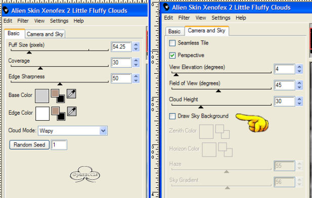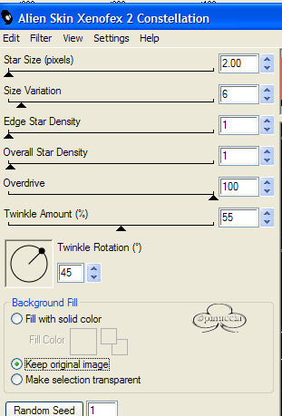 qui puoi trovare qualche risposta ai tuoi dubbi. Se l'argomento che ti interessa non è presente, ti prego di segnalarmelo. Questo tutorial è stato scritto con PSP 9. Occorrente: Filtro Alien Skin Xenofex 2 qui Animation Shop qui Materiale qui 1. Apri una nuova immagine trasparente 640 x 480. 2. Riempi l'immagine con il colore nero.3. Effetti>Plugins>Alien Skin Xenofex 2>Constellation: Starfield setting: ![]() 4. Livelli>Unisci>Unisci tutto (appiattisci). 5. Immagine>Aggiungi bordatura, 5 pixels, simmetriche, colore bianco. 6. Seleziona il bordo con la bacchetta magica ![]() 7. Imposta il colore di sfondo con un pattern argento e riempi il bordo con questo.8. Selezione>Nessuna selezione. 9. Immagine>Aggiungi bordatura, 1 pixel, simmetriche, con il colore nero. 10. Immagine>Aggiungi bordatura, 1 pixel, simmetriche, con il colore bianco. 11. Immagine>Aggiungi bordatura, 3 pixels, simmetriche, con il colore nero. 12. Livelli>Duplica. 13. Immagine>Rifletti. Immagine>Capovolgi. 14. Apri il mist krw-couple6 e vai a Modifica>Copia. 15. Torna al tuo lavoro e vai a Modifica>Incolla>Incolla come nuovo livello. 16. Apri il tube di testo drw-dream e vai a Modifica>Copia. 17. Torna al tuo lavoro e vai a Modifica>Incolla>Incolla come nuovo livello. 18. Nella paletta dei livelli cambia la modalità di miscelatura in Filtra. 19. Posiziona il testo vicino al bordo inferiore dell'immagine.20. Seleziona il livello di sfondo (il livello inferiore nella paletta dei livelli). 21. Effetti>Plugins>Alien Skin Xenofex 2/Little Puffy Clouds: ![]() 22. Seleziona la copia di sfondo (il secondo livello nella paletta dei livelli). 23. Ripeti il passo 21, con gli stessi settaggi: 24. Nella paletta dei livelli nascondi i due livelli inferiori. 25. Seleziona uno degli altri livelli, clicca con il tasto destro del mouse e scegli Unisci>Unisci visibile. 26. Apri Animation Shop. 27. Ritorna in PSP, apri il livello inferiore, lascia chiuso il livello della copia di sfondo. ![]() 28. Modifica>Copia Unione. 29. In Animation Shop clicca con il tasto destro del mouse sull'area di lavoro e scegli Incolla come nuova animazione. ![]() 30. Ritorna in PSP. 31. Chiudi il livello di sfondo e apri il duplicato del livello di sfondo. ![]() 32. Modifica>Copia Unione. 33. In Animation Shop: clicca sul fotogramma con il tasto destro del mouse e poi su "Incolla dopo il corrente fotogramma". 34. Ancora in Animation Shop: Modifica>Seleziona tutto. 35. Animazione>Proprietà fotogramma: imposta la velocità a 40. ![]() 36. File>Salva con nome, in formato gif. 37. Questo farà partire l'ottimizzazione guidata. 38. Alla finestra Qualità dell'animazione, imposta come nella schermata sotto: ![]()