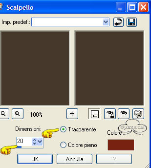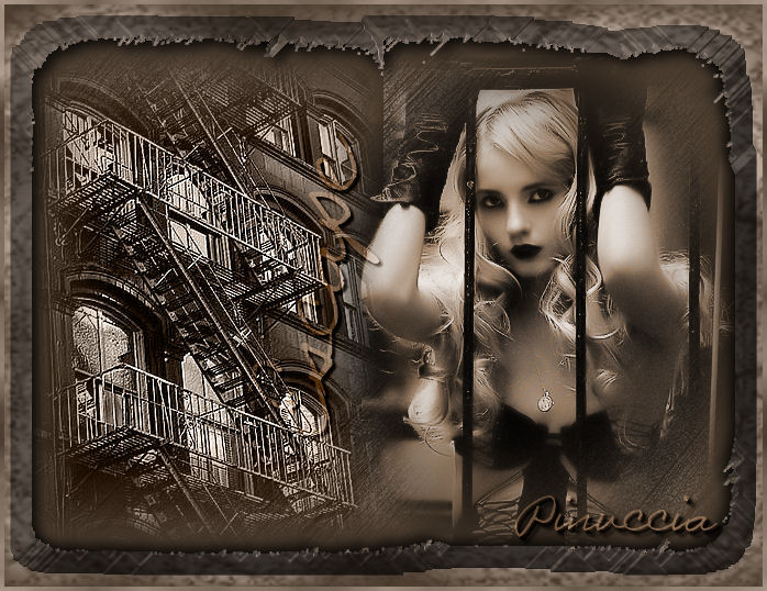 qui puoi trovare qualche risposta ai tuoi dubbi. Se l'argomento che ti interessa non è presente, ti prego di segnalarmelo. Questo tutorial è stato scritto con PSP 9. Occorrente: Filtro FM Tile Tools qui Materiale qui 1. Metti il gradiente nella cartella Gradienti di PSP. 2. Imposta il colore di primo piano con #c1aea0 e il colore di sfondo con #46382b. 3. Passa il colore di primo piano a gradiente di primo piano/sfondo con i seguenti settaggi: ![]() 4. Apri una nuova immagine trasparente 640 x 480 pixels. e riempila con il gradiente.5. Livelli>Nuovo livello raster. 6. Riempi questo livello con il colore di sfondo.7. Livelli>Carica/Salva maschera>Carica maschera da disco. Seleziona e carica la maschera Helank11, con i seguenti settaggi: ![]() 8. Livelli>Unisci>Unisci gruppo. 9. Apri il mist krw-female 10 e vai a Modifica>Copia. 10. Torna al tuo lavoro e vai a Modifica>Incolla>Incolla come nuovo livello. Spostalo sul lato destro dell'immagine.11. Nella paletta dei livelli cambia la modalità di miscelatura in Luminanza. 12. Apri il mist krw-fire escape e vai a Modifica>Copia. 13. Torna al tuo lavoro e vai a Modifica>Incolla>Incolla come nuovo livello. Spostalo sul lato sinistro dell'immagine.14. Nella paletta dei livelli cambia la modalità di miscelatura in Luminanza (esistente). 15. Effetti>Plugins>FM Tile Tools - Blend Emboss, con i settaggi standard: ![]() 16. Attiva lo strumento testo, scegli il font Galeforce BTN, con questi settaggi: ![]() 17. Imposta il colore di primo piano con il colore solido (#c1aea0) e inverti i colori di primo piano e sfondo cliccando sulla doppiafreccia nella paletta dei colori. ![]() 18. Scrivi "Escape". Ruotalo come nell'esempio della tag finale. 19. Nella paletta dei livelli converti il livello vettore in livello raster. 20. Cambia la modalità di miscelatura in Luce diffusa. 21. Effetti>Effetti 3D>Sfalsa ombra, con i seguenti settaggi, colore nero. ![]() 22. Livelli>Duplica. 23. Livelli>Unisci>Unisci tutto (appiattisci). 24. Immagine>Aggiungi bordatura, 25 pixels, simmetriche, con il colore di sfondo. 25. Seleziona il bordo con la bacchetta magica ![]() 26. Livelli>Aggiungi nuovo livello. Riempi questo livello con il colore di primo piano.27. Livelli>Carica/Salva maschera>Carica maschera da disco. Seleziona e carica la maschera Scratchedup2: ![]() 28. Livelli>Unisci>Unisci tutto (appiattisci). 29. Selezione>Inverti. 30. Effetti>Effetti 3D>Scalpello: ![]() 31. Effetti>Effetti 3D>Ritaglio, con i seguenti settaggi: ![]() 32. Ripeti l'effetto Ritaglio, ma cambiando verticale e orizzontale in -6. 33. Selezione>Nessuna selezione. 34. Aggiungi la firma. 35. Livelli>Unisci>Unisci tutto (appiattisci) e salva in formato jpg.