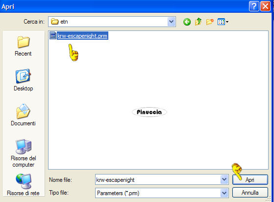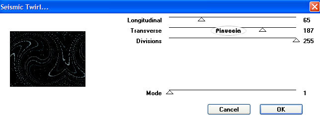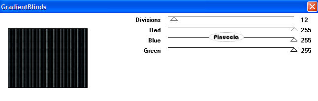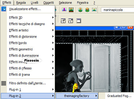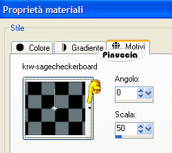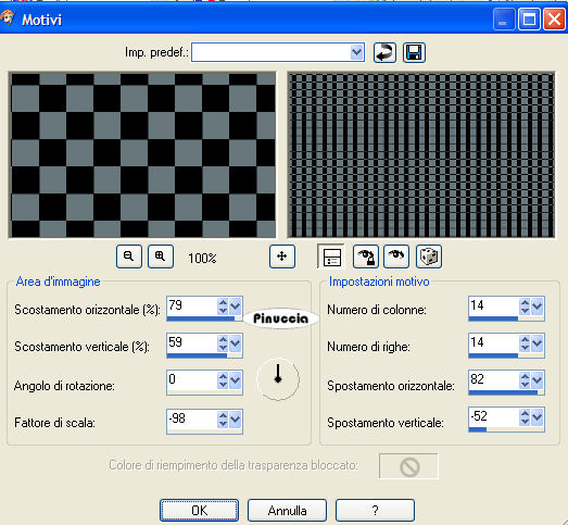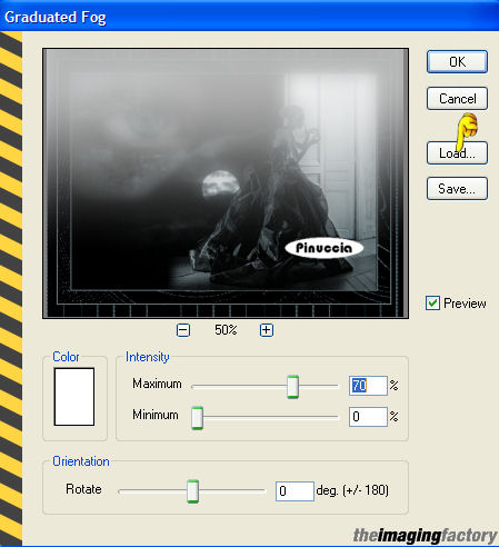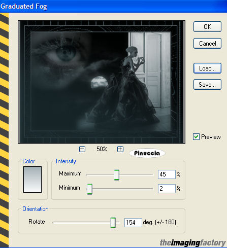 qui puoi trovare qualche risposta ai tuoi dubbi. Se l'argomento che ti interessa non è presente, ti prego di segnalarmelo. Questo tutorial è stato scritto e tradotto con PSP 9. Occorrente: Materiale qui Filtri: Filter Factory B qui Filter Factory G qui i filtri Factory Gallery per essere usati devono essere convertiti. Come fare vedi qui The imaging factory - Graduated Fog qui trovi la demo. se trovi delle difficoltà a scaricare la demo clicca qui Apri il motivo krw-sagecheckerboard e minimizzalo nella tua area di lavoro. Lo troverai nella lista dei motivi, quando ti servirà. Importa il pennello "Texture 5". Come fare vedi qui Il file krw-escapenight.prm è un preset per il filtro Graduated Fog. Mettilo in una cartella a tua scelta, dove potrai facilmente trovarlo quando ti servirà. 1. Apri una nuova immagine trasparente 640 x 480 pixels. 2. Imposta il colore di primo piano su Motivi. Apri il menu cliccando sulla freccia a fianco del box, e seleziona il motivo krw-sagecheckerboard, con i seguenti settaggi: ![]() 3. Riempi l'immagine trasparente con questo motivo.4. Effetti>Effetti di riflesso>Motivi: ![]() 5. Effetti>Plugins>Filter Factory Gallery G - Gradient blinds: ![]() 6. Selezione>Seleziona tutto. Selezione>Modifica>Contrai, di 18 pixels. Livelli>Nuovo livello raster. 7. Imposta il colore di sfondo con #68777c, e riempi la selezione con il colore di sfondo.per riempire con il colore di sfondo, devi cliccare con il tasto destro del mouse. 8. Selezione>Modifica>Contrai, di 2 pixel. 9. Premi sulla tastiera il tasto CANC ![]() Mantieni selezionato. 10. Livelli>Unisci>Unisci visibile. 11. Effetti>Plugins>Filter Factory B - Seismic Twirl: ![]() 12. Selezione>Modifica>Contrai, di 23 pixels. 13. Livelli>Nuovo livello raster. 14. Riempi la selezione con il colore di sfondo.15. Selezione>Modifica>Contrai, di 2 pixels. 16. Imposta il colore di primo piano con il nero, e riempi la selezione con il nero.17. Livelli>Nuovo livello raster. 18. Apri il mist krw-etnsky e vai a Modifica>Copia. 19. Torna al tuo lavoro e vai a Modifica>Incolla>Incolla nella selezione. 20. Regola>Saturazione e tonalità>Viraggio: ![]() 21. Mantieni selezionato. 22. Apri il mist krw-etnfemale2. **Per il secondo esempio: Apri il mist krw-etnfemale. Immagine>Ridimensiona, al 65%, tutti i livelli non selezionato, mantieni proporzioni selezionato, e prosegui con i rimanenti passaggi del tutorial.** 23. Regola>Saturazione e tonalità>Viraggio: ![]() 24. Modifica>Copia. 25. Torna al tuo lavoro e vai a Modifica>Incolla>Incolla come nuovo livello. Sposta il tube contro il bordo destro della selezione.26. Abbassa l'opacità di questo livello al 90%. 27. Apri il mist krw-etneye (l'occhio), e vai a Modifica>Copia. 28. Torna al tuo lavoro e vai a Modifica>Incolla>Incolla come nuovo livello. 29. Immagine>Ridimensiona, all'80%, mantieni proporzioni selezionato, tutti i livelli non selezionato. ![]() 30. Sposta il tube nell'angolo in alto a sinistra dell'area selezionata.31. Cambia la modalità di miscelatura di questo livello in Scharisci, e abbassa l'opacità al 50%. 32. Selezione>Inverti. 33. Premi sulla tastiera il tasto canc per rimuovere le tracce del tube all'esterno dell'area selezionata.34. Selezione>Inverti e mantieni selezionato. 35. Livelli>Unisci>Unisci visibile. 36. Effetti>Plugins>Theimaging factory - Graduated Fog. trovi il filtro alla lettera "T" di The imaging factory: ![]() Ti apparirà questa schermata: clicca su 30 Day Evaluation, e clicca ok. ![]() clicca su Agree. ![]() clicca su Load, per cercare il preset che hai trovato nello zip del materiale: ![]() Cerca il preset nella cartella dove lo hai salvato, selezionalo e clicca apri. ![]() Ritornerai alla schermata del filtro. Qui clicca ok. ![]() 37. Selezione>Nessuna selezione. 38. Livelli>Nuovo livello raster. 39. Attiva lo strumento Pennello ![]() Cerca e seleziona il pennello texture 5. 40. Imposta il colore di primo piano con #c0c0c0. 41. Applica il pennello con il colore di primo piano, nell'angolo in basso a destra dell'immagine interna. ![]() 42. Immagine>Rifletti. ![]() 43. Apri il mist krw-etnbook (il libro), e vai a Modifica>Copia. 44. Torna al tuo lavoro e vai a Modifica>Incolla>Incolla come nuovo livello. 45. Immagine>Ridimensiona, al 65%, mantieni proporzioni selezionato, tutti i livelli non selezionato. 46. Sposta il tube nell'angolo in basso a sinistra dell'immagine centrale.47. Apri il tube krw-etnText e vai a Modifica>Copia. 48. Torna al tuo lavoro e vai a Modifica>Incolla>Incolla come nuovo livello. 49. Spostalo , come mostrato nella schermata sotto.![]() 50. Aggiungi la tua firma, se vuoi. 51. Livelli>Unisci>Unisci tutto (appiattisci) e salva in formato jpg. ![]() ![]() Se hai problemi o dubbi, o trovi un link non funzionante, o anche soltanto per un saluto, scrivimi. 14 Luglio 2007 |