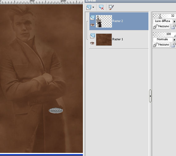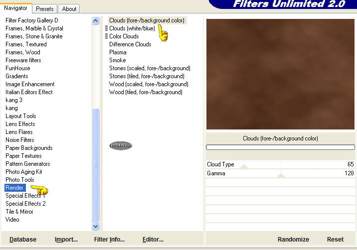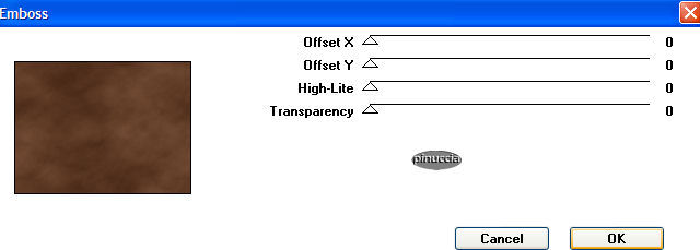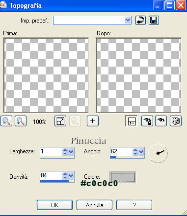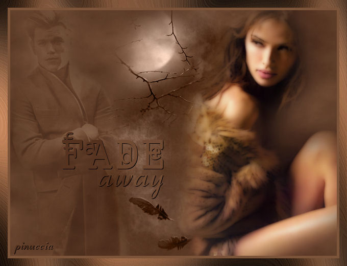 qui puoi trovare qualche risposta ai tuoi dubbi. Se l'argomento che ti interessa non è presente, ti prego di segnalarmelo. Questo tutorial è stato scritto in PSP 9. Occorrente: Materiale qui Lascia intatti i watermarks e non cambiare il nome dei files. Apri i font e minimizzali nella tua area di lavoro. Li troverai nella lista dei font disponibili. Filtri: Graphics Plus qui Filters Unlimited 2 qui 1. Imposta il colore di primo piano con #7c543a, e il colore di sfondo con #492817. 2. Apri una nuova immagine 640x480 pixels. 3. Riempi con il colore di sfondo.4. Effetti>Plugins>Filters Unlimited 2 / Render/Clouds (colore primo piano/sfondo). ![]() 5. Effetti>Plugins>Graphics Plus / Emboss, con i settaggi standard: ![]() 6. Apri il mist bsc~celeb~mattdamon001 e vai a Modifica>Copia. 7. Torna al tuo lavoro e vai a Modifica>Incolla>Incolla come nuovo livello. 8. Immagine>Rifletti. 9. Spostalo contro il lato sinistro dell'immagine.10. Cambia la modalità di miscelatura di questo livello in Luce diffusa, e abbassa l'opacità al 32%. ![]() 11. Apri il mist "isharimal_night" e vai a Modifica>copia. 12. Torna al tuo lavoro e vai a Modifica>Incolla>Incolla come nuovo livello. 13. Spostalo un po' sulla destra.14. Attiva lo strumento Gomma , dimensione 50,e cancella la linea visibile nel tube, ![]() 15. Apri il mist "PatryMists_06_Beauty_79" e vai a Modifica>Copia. 16. Torna al tuo lavoro e vai a Modifica>Incolla>Incolla come nuovolivello. 17. Spostalo a destra,come si vede nell'esempio finale. 18. Livelli>Unisci>Unisci tutto (appiattisci). 19. Immagine>Aggiungi bordatura, 20 pixels, simmetriche, con il colore bianco (#ffffff). 20. Seleziona il bordo con la bacchetta magica ![]() e riempilo con il colore di primo piano (#7c543a).21. Effetti>Plugins>Graphics Plus - Cross Shadow, settaggi standard. ![]() 22. Effetti>Effetti artistici>Topografia, colore #c0c0c0: ![]() 23. Selezoine>Seleziona tutto. 24. Selezione>Modifica>Contrai, di 15 pixels. 25. Livelli>Nuovo livello raster. 26. Riempi con il colore di primo piano.27. Selezione>Modifica>Contrai, di 5 pixels. 28. Premi sulla tastiera il tasto Shift (tasto della maiuscola). 29. Selezione>Nessuna selezione. 30. Imposta il colore di sfondo su gradiente di primo piano sfondo, radiale, ripetizioni 0. 31. Attiva lo strumento Testo , crea come vettore,font Fallen, dimensione 72, pennellata 0, allineamento centrale. 32. Scrivi "Fade", tutto maiuscolo. 33. Livelli>converti in livello raster. 34. Effetti>Effetti 3d>Sfalsa ombra, con i seguenti settaggi, colore nero: ![]() 35. Cambia font e scegli CoronetI, stessi settaggi del precedente. 36. Scrivi "away" in lettere minuscole. 37. Sposta il testo con la y sotto la e di Fade. 38. Livelli>Converti in livello raster. 39. Effetti>Effetti 3D>Sfalsa ombra, con gli stessi settaggi dell'altro testo. 40. Aggiungi la tua firma. 41. Livelli>Unisci>Unisci tutto (appiattisci) e salva in formato jpg. ![]() Se hai problemi o dubbi, o trovi un link non funzionante, o anche soltanto per un saluto, scrivimi. Gennaio 2007 |