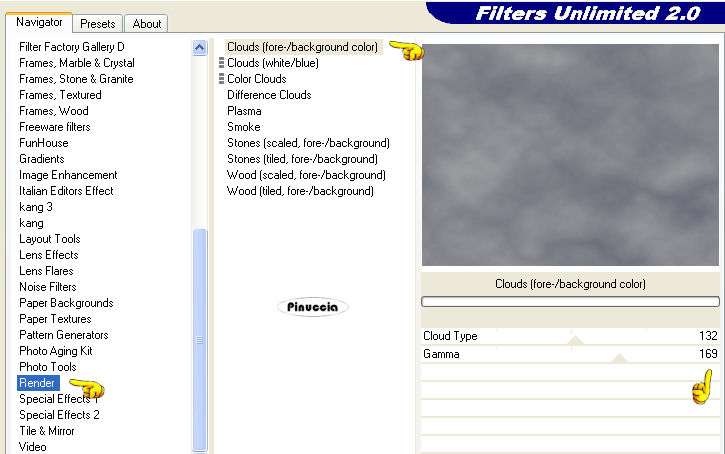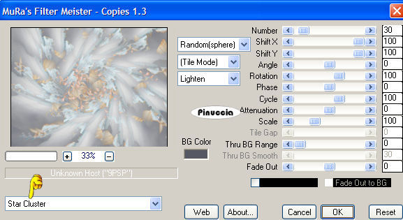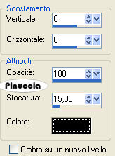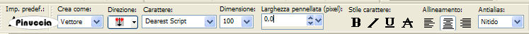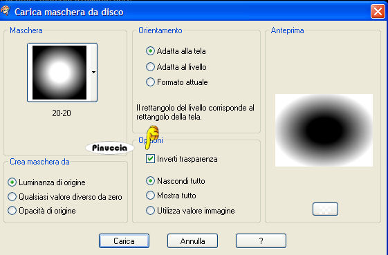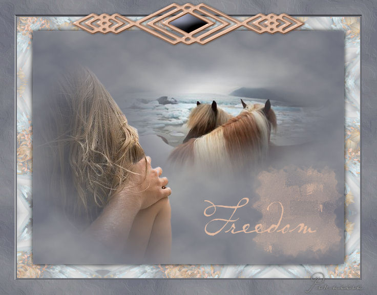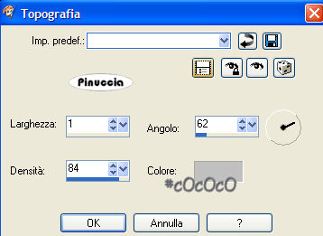 qui puoi trovare qualche risposta ai tuoi dubbi. Se l'argomento che ti interessa non è presente, ti prego di segnalarmelo. Questo tutorial è stato scritto e tradotto con PSP 9. Occorrente: Materiale qui Filtri: Filters Unlimited 2 qui Mura's Meister qui Metti la maschera nella cartella Maschere. Apri il font e minimizzalo nella tua area di lavoro. Lo troverai disponibile nella lista dei font, quando attiverai lo strumento Testo. Importa il pennello in PSP. Come fare vedi qui 1. Imposta il colore di primo piano con #90908e, e il colore di sfondo con #565864. 2. Apri una nuova immagine trasparente 640 x 480 pixels. 3. Riempi l'immagine con il colore di sfondo,(per riempire con il colore di sfondo devi cliccare con il tasto destro del mouse).4. Effetti>Plugins>Filters Unlimited 2 - Render - Clouds (fore-/background color) - 132-169: ![]() 5. Apri il mist krw-horses e vai a Modifica>Copia. 6. Torna al tuo lavoro e vai a Modifica>Incolla>Incolla come nuovo livello. 7. Spostalo leggermente in alto a destra.![]() 8. Apri il tube krw-couple21 e vai a Modifica>Copia. 9. Torna al tuo lavoro e vai a Modifica>Incolla>Incolla come nuovo livello. 10. Immagine>Rifletti. 11. Posiziona il tube contro il bordo sinistro dell'immagine.12. Nella paletta dei livelli attiva il livello Raster 1 (il livello delle nuvole). 13. Livelli>Duplica. 14. Trascina il livello duplicato in alto alla paletta dei livelli: ![]() 15. Livelli>Carica/Salva maschera>Carica maschera da disco: cerca e carica la maschera 20/20, inverti trasparenza selezionato: ![]() 16. Livelli>Unisci>Unisci gruppo. Livelli>Unisci>Unisci visibile. Modifica>Copia, e minimizza l'immagine. 17. Apri una nuova immagine trasparente 670 x 510 pixels. 18. Seleziona>Seleziona tutto. 19. Modifica>Incolla>Incolla nella selezione. 20. Selezione>Nessuna selezione. 21. Effetti>Plugins>Mura's Meister - Copies, con i seguenti settaggi: ![]() 22. Effetti>Plugins>Simple - Zoom out and flip. Questa è la tua immagine di sfondo. 23. Modifica>Incolla>Incolla come nuovo livello (la tua prima immagine dovrebbe essere ancora in memoria, se per qualche ragione non è così, attivala e vai a Modifica>Copia). 24. Effetti>Effetti 3D>Sfalsa ombra, con i seguenti settaggi, colore nero. ![]() 25. Immagine>Ridimensiona, al 95%, tutti i livelli NON selezionato. 26. Livelli>Unisci>Unisci tutto (appiattisci). 27. Immagine>Aggiungi bordatura, 1 pixel, simmetriche, con il colore di sfondo (#565864). 28. Immagine>Aggiungi bordatura, 1 pixel, simmetriche, con il colore di primo piano (#90908e). 29. Immagine>Aggiungi bordatura, 1 pixel, simmetriche, con il colore di sfondo. 30. Immagine>Aggiungi bordatura, 30 pixels, simmetriche, con il colore di primo piano. 31. Seleziona il bordo da 30 pixels con la bacchetta magica ![]() 32. Effetti>Plugins>Filters Unlimited 2 - Render - (fore-/background color), con i settaggi precedenti: (dovrai reimpostarli, perchè questo filtro non tiene i memoria i settaggi precedenti): 132, 169. ![]() 33. Effetti>Effetti artistici>Topografia, con i seguenti settaggi, colore #c0c0c0. ![]() 34. Selezione>Nessuna selezione. 35. Cambia il colore di sfondo con #e2bba4. 36. Attiva lo strumento Testo , con i seguenti settaggi:font Dearest Script, crea come vettore, dimensione 100, pennellata 0, allineamento centrale: ![]() 37. Scrivi "Freedom", o in italiano "Libertà", o quello che preferisci. questo font, dopo aver digitato la lettera "e" attacca la lettera successiva. Per ovviare all'inconveniente, ho scritto prima la parola "free". Livelli>Converti in livello raster. poi ho scritto "dom". Ho unito le due parole. ![]() Livelli>Converti in livello raster. Livelli>Unisci>Unisci giù. 38. Posiziona il testo come nell'esempio finale. 39. Apri il tube krw-deco2 e vai a Modifica>Copia. 40. Torna al tuo lavoro e vai a Modifica>Incolla>Incolla come nuovo livello. 41. Posiziona il tube al centro del bordo colorato.(vedi l'esempio finale). 42. Effetti>Effetti 3D>Sfalsa ombra, con i seguenti settaggi, colore nero: ![]() 43. Attiva lo strumento Pennello ![]() cerca e seleziona il pennello sr_texture_003, con i settaggi standard. 44. Clicca con il tasto destro del mouse (per applicarlo con il colore di sfondo), nell'angolo in basso a destra. 45. Aggiungi la tua firma. 46. Livelli>Unisci>Unisci tutto (appiattisci) e salva in formato jpg. ![]() ![]() Se hai problemi o dubbi, o trovi un link non funzionante, o anche soltanto per un saluto, scrivimi. 9 Marzo 2007 |