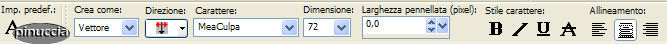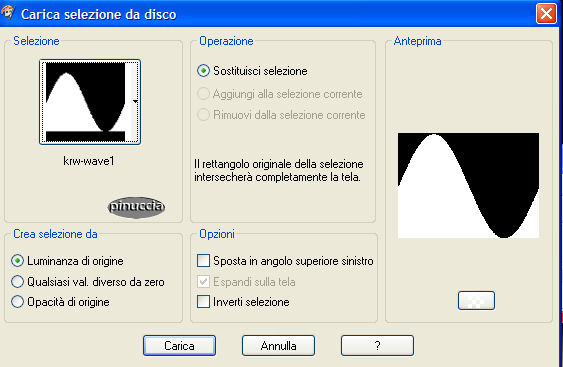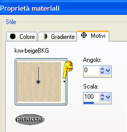 qui puoi trovare qualche risposta ai tuoi dubbi. Se l'argomento che ti interessa non è presente, ti prego di segnalarmelo. Questo tutorial è stato scritto con PSP 9. Occorrente: Materiale qui Filtro Adjust Variations qui 1. Imposta il colore di primo piano su Motivi: clicca sul piccolo triangolo del box per aprire il menu e cerca il Motivo: krw-beigeBKG. ![]() Imposta il colore di sfondo su #2f332d. 2. Apri una nuova immagine trasparente 640x480 pixels. 3. Selezione>Carica/Salva selezione>Carica selezione da disco: cerca e carica la selezione krw-wave1: ![]() 4. Apri il file krw-bkg6 e vai a Modifica>Copia. 5. Torna al tuo lavoro e vai a Modifica>Incolla>Incolla nella selezione. 6. Selezione>Inverti. 7. Apri il file krw-bkg7 e vai a Modifica>Copia. 8. Torna al tuo lavoro e vai a Modifica>Incolla>Incolla nella selezione. 9. Mantieni selezionato. 10. Livelli>Unisci>Unisci tutto (appiattisci). 11. Effetti>Effetti 3D>Ritaglio, con i seguenti settaggi: ![]() 12. Selezione>Nessuna selezione. 13. Apri il mist krw-gypsy e vai a Modifica>Copia. 14. Torna al tuo lavoro e vai a Modifica>Incolla>Incolla come nuovo livello. 15. Spostalo come mostrato nella schermata sotto:![]() 16. Selezione>Carica/Salva selezione>Carica selezione da disco cerca e carica nuovamente la selezione krw-wave1. 17. Premi sulla tastiera il tasto CANC, per tagliare la parte del tube che copre lo sfondo. 18. Selezione>Modifica>Espandi, di 5 pixels. 19. Livelli>Nuovo livello raster. 20. Riempi il livello con il Motivo impostato come colore di primo piano.21. Selezione>Modifica>Contrai, di 5 pixels. 22. Premi sulla tastiera il tasto CANC. 23. Selezione>Nessuna selezione. 24. Regola>Aggiungi/rimuovi disturbo>Aggiungi disturbo: gaussiano 30, monocromatico: ![]() 25. Effetti>Plugins>Adjust Variations: clicca su originale, clicca 2 volte su darker e poi ok. 26. Se necessario, spostalo un po' in basso,quanto basta per centrarlo tra i bordi. 27. Inverti i colori nella paletta dei materiali: il Motivo passerà così a colore di sfondo. ![]() 28. Attiva lo strumento Testo , font Mea Culpa, con i seguenti settaggi:![]() Scrivi Gipsy, invio, aggiungi 5 spazi vuoti e poi scrivi Queen. 30. Posiziona il testo come mostrato nella tag finale. 31. Livelli>converti in livello raster. 32. Regola>Aggiungi/rimuovi disturbo>Aggiungi disturbo, con i settaggi precedenti: ![]() 33. Effetti>Plugins>Adjust Variations: clicca su original, 2 volte su darker, quindi ok. 34. Attiva krw-sideaccent e vai a Modifica>Copia. 35. Torna al tuo lavoro e vai a Modifica>Incolla>Incolla come nuovo livello. 36. Immagine>Rifletti. 37. Spostala lungo il bordo destro. 38. Livelli>Unisci>Unisci tutto (appiattisci). 39. Immagine>Aggiungi bordatura, 5 pixels, simmetriche, con il colore #2f332d. 40. Immagine>Aggiungi bordatura, 1 pixel, simmetriche, con il colore bianco. 41. Selezione con la bacchetta magica ![]() e riempi con il Motivo, che adesso è impostato come colore di sfondo, quindi, per applicarlo, devi cliccare con il tasto destro del mouse. 42. Selezione>Nessuna selezione. 43. Immagine>Aggiungi bordatura, 5 pixels, simmetriche, con il colore #2f332d. 44. Immagine>Aggiungi bordtura, 40 pixels, simmetriche, con il colore #2f332d. 45. Selezione>Seleziona tutto. 46. Selezione>Modifica>Contrai di 40 pixels. 47. Selezione>Inverti. 48. Regola>Aggiungi/Rimuovi disturbo>Aggiungi disturbo, con i settaggi precedenti. 49. Effetti>Effetti 3D>Ritaglio, con i settaggi precedenti, colore nero: ![]() 50. Selezione>Nessuna selezione. 51. Apri krw-sideaccent e vai a Modifica>Copia. 52. Torna al tuo lavoro e vai a Modifica>Incolla>Incolla come nuovo livello. 53. Spostalo sul lato sinistro nel ritaglio che hai appena fatto.54. Immagine>Aggiungi bordatura, 5 pixels, simmetriche, con il colore #2f332d. 55. Immagine>Aggiungi bordatura, 1 pixel, simmetriche, con il colore bianco. 56. Seleziona il bordo con la bacchetta magica ![]() 57. Riempilo con il Motivo (clicca con il tasto destro del mouse).58. Selezione>Nessuna selezione. 59. Immagine>Aggiungi bordatura, 5 pixels, simmetriche, con il colore #2f332d. 60. Aggiungi la tua firma, se vuoi. 61. Livelli>Unisci>Unisci tutto (appiattisci) e salva in formato jpg. ![]() Se hai problemi o dubbi, o trovi un link non funzionante, o anche soltanto per un saluto, scrivimi. Novembre 2006 |