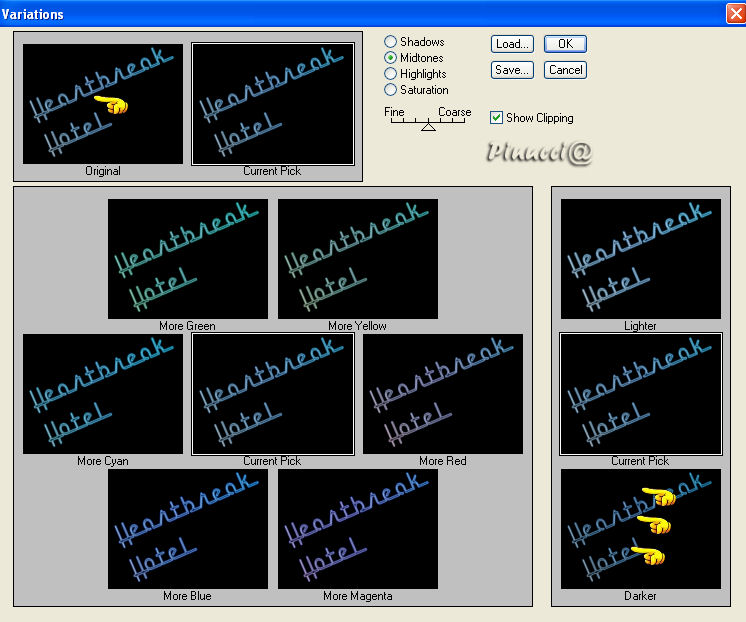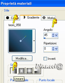 qui puoi trovare qualche risposta ai tuoi dubbi. Se l'argomento che ti interessa non è presente, ti prego di segnalarmelo. Questo tutorial è stato scritto con PSP 9. Occorrente: Materiale qui Filtro Adjust Variations qui Metti la selezione nella cartella Selezioni di PSP. Metti il gradiente nella cartella Gradienti di PSP. 1. Apri una nuova immagine NERA 640 x 480 pixels. 2. Livelli>Nuovo livello raster. 3. Selezione>Carica/salva selezione>Carica selezione da disco. Cerca e carica la selezione krw-heartbreak: ![]() 4. Imposta il colore di primo piano sul bianco (#ffffff). 5. Riempi la selezione con questo colore.6. Selezione>Modifica>Contrai, di 3 pixels. 7. Premi sulla tastiera il tasto CANC. 8. Selezione>Nessuna selezione. 9. Regola>Sfocatura>sfocatura gaussiana: 1,70. ![]() 10. Livelli>Nuovo livello raster. 11. Imposta il colore di sfondo su Gradiente. Apri il menu cliccando sulla freccia a fianco del box e cerca il gradiente teom_58, con i seguenti settaggi: ![]() 12. Riempi il livello con questo gradiente.(Ricorda, essendo impostato come colore di sfondo, devi cliccare con il tasto destro del mouse). 13. Imposta la modalità di miscelatura di questo livello in Colore (esistente). 14. Livelli>Unisci>Unisci visibile. 15. Rinomina questo livello: Fotogramma 1. 16. Livelli>Duplica. 16. Rinomina questo livello: Fotogramma 2. 18. Mantieni selezionato il livello Fotogramma 2. 19. Effetti>Plugins>Adjust / Variations: clicca una volta su Original e 3 volte su Darken. ![]() 20. Apri il tube krw-female65 e vai a Modifica>Copia. 21. Torna al tuo lavoro e vai a Modifica>Incolla>Incolla come nuovo livello. 22. Spostalo contro il bordo sinistro del tuo lavoro.23. Nella paletta dei livelli cambia la modalità di miscelatura di questo livello in Filtra e abbassa l'opacità al 28%. 24. Apri il tube krw-male18small e vai a Modifica>Copia. 25. Torna al tuo lavoro e vai a Modifica>Incolla>Incolla come nuovo livello. 26. Spostalo contro il bordo destro del tuo lavoro.27. Apri il tube krw-brokenheart e vai a Modifica>Copia. 28. Torna al tuo lavoro e vai a Modifica>Incolla>Incolla come nuovo livello. 29. Spostalo nell'angolo in alto a sinistra.30. Rinomina questo livello: Cuore 1. 31. Livelli>Duplica. 32. Rinomina questo livello: Cuore 2. 33. Effetti>Plugins>Adjust - Variations, con i settaggi precedenti. 34. Livelli>Nuovo livello raster. 35. Aggiungi la tua firma. 36. Nella paletta dei livelli chiudi Fotogramma 2 e Cuore 2. 37. Clicca su Fotogramma 1 per selezionarlo. 38. Modifica>Copia unione. 39. Apri Animation Shop. 40. Clicca con il tasto destro del mouse sullo spazio vuoto e "Incolla come nuova animazione". 41. Ritorna in PSP. 42. Nella paletta dei livelli apri i livelli fotogramma 2 e cuore 2. 43. Chiudi i livelli Fotogramma 1 e Cuore 1. 44. Posizionati per attivarlo sul livello Fotogramma 2. 45. Modifica>Copia unione. 46. Ritorna in Animation Shop. 47. Modifica>Incolla>Incolla dopo il fotogramma corrente. 48. Posizionati sul primo fotogramma per selezionarlo. 49. Modifica>Seleziona tutto. 50. Animazione>Proprietà fotogramma e imposta la velocità a 80. ![]() 51. Salva in formato gif. ![]() Se hai problemi o dubbi, o trovi un link non funzionante, o anche soltanto per un saluto, scrivimi. Dicembre 2006 |