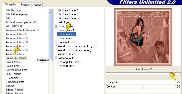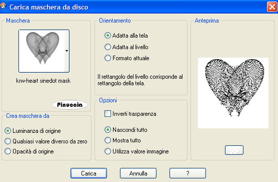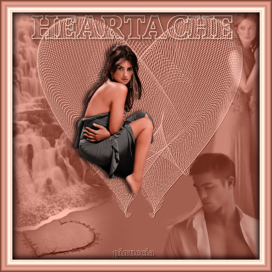 qui puoi trovare qualche risposta ai tuoi dubbi. Se l'argomento che ti interessa non è presente, ti prego di segnalarmelo. Questo tutorial è stato scritto e tradotto con PSP 9. Occorrente: Materiale qui Filtri: FM Tile Tools qui Filters Unlimited qui 1. Apri una nuova immagine trasparente 500 x 500 pixels. 2. Imposta il colore di primo piano con #e6a796, e il colore di sfondo con #a96251. 3. Riempi l'immagine trasparente con il colore di primo piano.4. Livelli>Nuovo livello raster. 5. Riempi con il colore di sfondo.per riempire con il colore di sfondo, devi cliccare con il tasto destro del mouse. 6. Livelli>Carica/Salva maschera>Carica maschera da disco. Cerca e carica la maschera krw-heart sinedot mask. ![]() 7. Livelli>Unisci>Unisci tutto (appiattisci). 8. Effetti>Plugins>FM Tile Tools - Blend Emboss, con i settaggi standard. ![]() 9. Apri il tube krw-SHayekSmall e vai a Modifica>Copia. 10. Torna al tuo lavoro e vai a Modifica>Incolla>Incolla come nuovo livello. 11. Immagine>Ridimensiona, al 75%, tutti i livelli non selezionato. 12. Immagine>Rifletti. 13. Sposta il tube in modo che la donna sia "seduta" in basso al centro,sul lato sinistro del cuore. 14. Con lo strumento Gomma , dimensione 20, durezza 50,cancella i piedi per "ammorbidire" un po' i contorni. 15. Effetti>Effetti 3D>Sfalsa ombra, con i seguenti settaggi, colore nero: ![]() 16. Apri il mist krw-waterfall small e vai a Modifica>Copia. 17. Torna al tuo lavoro e vai a Modifica>Incolla>Incolla come nuovo livello. 18. Spostalo a sinistra.Livelli>Disponi>Sposta giù. 19. Cambia la modalità di miscelatura di questo livello in Luminanza (esistente), e abbassa l'opacità al 50%. 20. Rimanendo su questo livello, cancella la parte che copre il cuore della maschera. ![]() 21. Apri il mist krw-heart sand small e vai a Modifica>Copia. 22. Torna al tuo lavoro e vai a Modifica>Incolla>Incolla come nuovo livello. 23. Spostalo nell'angolo in basso a sinistra.24. Cambia la modalità di miscelatura di questo livello in Luminanza (esistente). 25. Apri il tube krw-male heartacheSmall e vai a Modifica>Copia. 26. Torna al tuo lavoro e vai a Modifica>Incolla>Incolla come nuovo livello. 27. Immagine>Ridimensiona, al 55%, tutti i livelli non selezionato. 28. Immagine>Rifleti. Sposta il tube nell'angolo in basso a destra.![]() 29. Cambia la modalità di miscelatura di questo livello in luce diffusa. 30. Apri il mist krw-kknightleySmall e vai a Modifica>Copia. 31. Torna al tuo lavoro e vai a Modifica>Incolla>Incolla come nuovo livello. 32. Cambia la modalità di miscelatura di questo livello in Luminanza (esistente), e abbassa l'opacità al 50%. 33. Sposta il tube nell'angolo in alto a destra.34. Livelli>Disponi>Sposta sotto. 35. Tenendo attivo questo livello, cancella la parte del vestito che si vede sull'immagine dell'uomo. ![]() 36. Nella paletta dei livelli clicca con il tasto destro del mouse sul livello di sfondo e Duplica. Poi trascina questo livello in alto (puoi anche andare a Livelli>Disponi>Sposta in alto). 37. Cambia la modalità di miscelatura di questo livello in Tonalità (esistente). 38. Attiva lo strumento Testo ![]() Chiudi il colore di sfondo. 39. Seleziona il font Detente, crea come vettore, dimensione 48, pennellata 1: ![]() 40. Scrivi HEARTACHE in lettere maiuscole. (Se vuoi, in italiano, è "MAL DI CUORE", ma non ha lo stesso effetto). 41. Livelli>Converti in livello raster e posiziona il testo in alto, come nel mio esempio. 42. Effetti>Effetti 3D>Sfalsa ombra, con i seguenti settaggi, colore nero: ![]() 43. Livelli>Duplica. Cambia la modalità di miscelatura del livello duplicato in Filtra. 44. Aggiungi la tua firma. Livelli>Unisci>Unisci tutto (appiattisci). 45. Immagine>Aggiungi bordatura, 25 pixels, simmetriche, con il colore bianco. 46. Seleziona il bordo con la bacchetta magica ,e riempilo con il colore di primo piano.47. Effetti>Plugins>Filters Unlimited 2 - Buttons & Frames - Glass Frame 2: ![]() 48. Selezione>inverti. 49. Effetti>Effetti di ritaglio, con i seguenti settaggi, colore nero: ![]() 50. Ripeti l'Effetto Ritaglio, ma cambiando verticale e orizzontale a -6. 51. Selezione>Nessuna selezione. Salva in formato jpg. ![]() Se hai problemi o dubbi, o trovi un link non funzionante, o anche soltanto per un saluto, scrivimi. 1 Giugno 2007 |