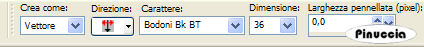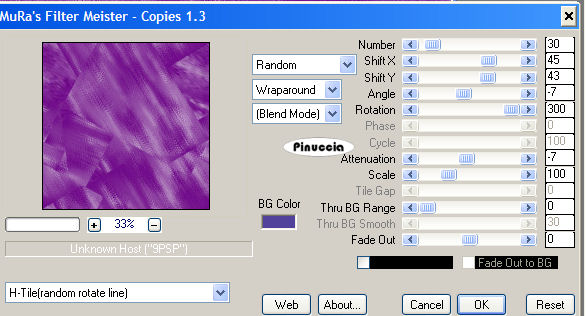 qui puoi trovare qualche risposta ai tuoi dubbi. Se l'argomento che ti interessa non è presente, ti prego di segnalarmelo. Questo tutorial è stato scritto e tradotto con PSP 9. Questo tutorial è stato scritto e tradotto con PSP 9. Occorrente: Materiale qui Filtro Mura's Meister - Copies qui 1. Apri il file di sfondo krw-lwfhBKG.jpg. Questa sarà la tua area di lavoro. 2. Effetti>Plugins>Mura's Meister - Copies: ![]() Random significa casuale, quindi il tuo risultato potrebbe essere diverso dal mio esempio. 3. Apri il mist krw-sunsetroad e vai a Modifica>Copia. Torna al tuo lavoro e vai a Modifica>Incolla>Incolla come nuovo livello. 5. Cambia la modalità di miscelatura di questo livello in Luminanza (esistente). Sposta il tube nell'angolo in alto a sinistra.![]() 6. Apri il mist krw-lantern e vai a Modifica>Copia. 7. Torna al tuo lavoro e vai a Modifica>Incolla>Incolla come nuovo livello. Spostalo sul lato destro, al centro.8. Cambia la modalità di miscelatura di questo livello in Luminanza (esistente). ![]() 9. Apri il mist krw-victdecor e vai a Modifica>Copia. 10. Torna al tuo lavoro e vai a Modifica>Incolla>Incolla come nuovo livello. 11. Spostalo nell'angolo in basso a sinistra.![]() 12. Imposta il colore di primo piano con #750890, e il colore di sfondo con #d1b3d9. 13. Apri i fonts e minimizzali nella tua area di lavoro. 14. Seleziona lo strumento Testo , crea come vettore,font Bodoni BkBT, dimensione 36, pennellata 0. ![]() 15. Scrivi "Long way". 16. Livelli>Converti in livello raster. Imposta la modalità di miscelatura di questo livello in Luce netta, e abbassa l'opacità al 50%. 17. Sposta in alto a destra, vedi il mio esempio.18. Effetti>Effetti 3D>Sfalsa ombra, con i seguenti settaggi, colore nero: ![]() 19. Cambio il font in Galeforce BTN, e mantieni gli stessi settaggi. 20. Scrivi "from home". 21. Livelli>Converti in livello raster. Cambia la modalità di miscelatura in Luce netta e abbassa l'opacità al 50%. 22. Posiziona il testo sotto il precedente.23. Effetti>Effetti 3D>Sfalsa ombra, con i settaggi precedenti. 23. Aggiungi la tua firma. 24. Livelli>Unisci>Unisci tutto (appiattisci). 25. Immagine>Aggiungi bordatura, 2 pixels, simmetriche, con il colore di primo piano. per aggiungere i bordi con i colori impostati nella paletta dei materiali vedi qui 26. Immagine>Aggiungi bordatura, 2 pixels, simmetriche, con il colore di sfondo. 27. Immagine>Aggiungi bordatura, 2 pixels, simmetriche, con il colore di primo piano. 29. Salva in formato jpg. ![]() Se hai problemi o dubbi, o trovi un link non funzionante, o anche soltanto per un saluto, scrivimi. 30 Maggio 2007 |