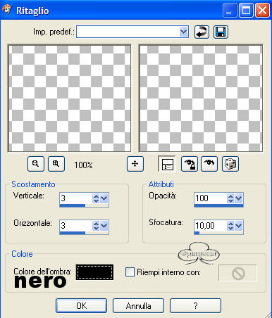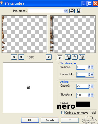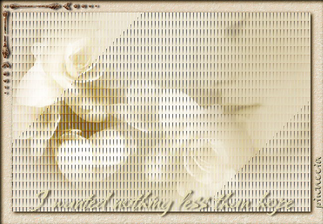 qui puoi trovare qualche risposta ai tuoi dubbi. Se l'argomento che ti interessa non è presente, ti prego di segnalarmelo. Questo tutorial è stato scritto in PSP X. Per tradurlo, l'ho eseguito con PSP 9. Occorrente: Filtri: Andrew 8/Tow the Line qui FM Tile Tools qui EyeCandy 5 Textures qui Materiale qui 1. Apri una nuova immagine trasparente 600 x 400 pixels. 2. Imposta il colore di primo piano con #f4dabe. 3. Imposta il colore di sfondo con #f7f6db. 4. Passa il colore di primo piano a gradiente di primo piano/sfondo: ![]() 5. Riempi l'immagine con il gradiente.6. Effetti>Plugins>Andrews 8 / Tow the Line, con i settaggi standard: ![]() 7. Livelli>Nuovo livello raster. 8. Riempi il livello con il colore di sfondo.9. Livelli>Carica/Salva maschera>Carica maschera da disco, scegli la maschera "blinds horizontal" ![]() 10. Livelli>Unisci>Unisci tutto. 11. Effetti>Plugins>FM Tile Tools - Blend Emboss, con i settaggi standard. ![]() 12. Apri il tube krw-floral1 e vai a Modifica>Copia. 13. Torna al tuo lavoro e vai a Modifica>Incolla>Incolla come nuovo livello. 14. Nella paletta dei livelli cambia la modalità di miscelatura in Sovrapponi. 15. Apri il tube krw-floral2 e vai a Modifica>Copia. 16. Torna al tuo lavoro e vai a Modifica>Incolla>Incolla come nuovo livello. 17. Spostalo contro il lato sinistro dell'immagine.18. Nella paletta dei livelli cambia la modalità di miscelatura in Sovrapponi; clicca con il tasto destro del mouse sul livello e scegli Duplica. ![]() 19. Apri il tube krw-floralwoman e vai a Modifica>copia. 20. Torna al tuo lavoro e vai a Modifica>Incolla>Incolla come nuovo livello. 21. Posizionalo in alto nell'angolo destro.22. Nella paletta dei livelli abbassa l'opacità al 51%. 23. Livelli>Unisci>Unisci tutto. 24. Immagine>Aggiungi bordatura, 25 pixels, simmetriche, con il colore di sfondo. 25. Seleziona>Seleziona tutto. Seleziona>Modifica>contrai di 25 pixels. 26. Selezione>Inverti. 27. Effetti>Plugins>Eye Candy 5 Textures /Swirl - Features, preset Tiny Spirals. ![]() 28. Attiva lo strumento ,cambia l'opacità al 50& e applica con il colore di primo piano. 29. Effetti>Plugins>FM Tile Tools, Blend Emboss, con i settaggi standard. ![]() 30. Effetti>Effetti 3D>Ritaglio, con i seguenti settaggi: ![]() 31. Selezione>Nessuna selezione. 32. Livelli>Nuovo livello raster. 33. Riempi il livello con il colore #dfd068.34. Nella paletta dei livelli cambia la modalità di miscelatura in Colore e abbassa l'opacità al 51%. 35. Livelli>Unisci>Unisci tutto. 36. Apri il file krw-bronzecorner e vai a Modifica>Copia. 37. Torna al tuo lavoro e vai a Modifica>Incolla>Incolla come nuovo livello. 38. Spostalo ![]() 39. Effetti>Effetti 3D>Sfalsa ombra, con i seguenti settaggi: ![]() 40. Apri il tube krw-hopetext e vai a Modifica>Copia. 41. Torna al tuo lavoro e vai a Modifica>Incolla>Incolla come nuovo livello. 42. Muovilo in basso.43. Aggiungi il tuo nome. 44. Livelli>Unisci>Unisci tutto. 45. Salva in formato jpg.