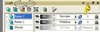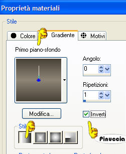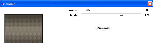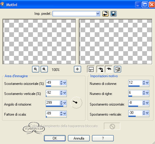 qui puoi trovare qualche risposta ai tuoi dubbi. Se l'argomento che ti interessa non è presente, ti prego di segnalarmelo. Questo tutorial è stato scritto in PSP 9. Occorrente: Materiale qui Filtri: VM Toolbox qui VM Instant Art qui Xero / Tekstya qui FM Tile Tools qui 1. Apri una nuova immagine trasparente 640x480 pixels. 2. Imposta il colore di primo piano con #8e8576, e il colore di sfondo con #484137. 3. Passa il colore di primo piano a gradiente di primo piano/sfondo, con i seguenti settaggi: ![]() 4. Riempi l'immagine con questo gradiente.5. Effetti>Plugins>VM Toolbox/Trimosaik: ![]() Ripeti l'Effetto. 6. Effetti>Effetti Artistici>Topografia: ![]() 7. Effetti>Plugins>Xero>Tekstya: ![]() 8. Livelli>Unisci>Unisci tutto (appiattisci). 9. Attiva lo strumento Selezione , rettangolo.10. Posiziona il cursore su x:0, y:73, ![]() e trascina il mouse fino all'angolo superiore destro, quindi rilascia il tasto del mouse. ![]() 11. Effetti>Effetti 3D>Ritaglio, con i seguenti settaggi, colore nero: ![]() 12. Selezione>Nessuna selezione. 13. Premi shift+D per duplicare questo sfondo e minimizza la copia perchè ti servirà più avanti. 14. Apri il tube female45 e premi shift+d per duplicarlo. 15. Cancella il livello del watermark sulla copia del tube. 16. Regola>Sfocatura>Sfocatura gaussiana: raggio 30. ![]() 17. Modifica>Copia. Torna al tuo lavoro e vai a Modifica>Incolla>Incolla come nuovo livello. 18. Nella paletta dei livelli cambia la modalità di miscelatura in Moltiplica. 19. Attiva il tube originale e vai a Modifica>Copia. Torna al tuo lavoro e vai a Modifica>Incolla>Incolla come nuovo livello. 20. Nella paletta dei livelli collega questi due livelli (vedi la schermata). ![]() Questo ti permetterà di muovere entrambi i livelli contemporaneamente. 21. Con lo strumento spostamento spostali sul lato sinistro.22. Apri il tube krw-bars e vai a Modifica>Copia. 23. Torna al tuo lavoro e vai a Modifica>Incolla>Incolla come nuovo livello. 24. Spostalo contro i bordi superiore e destro.25. Posiziona il tube della donna in modo che sembri che la mano sia appoggiata alla barra. ![]() 25. Nella paletta dei livelli assicurati che sia attivo il livello raster 3. 26. Apri il grafico krw-femalesketch e vai a Modifica>Copia. 27. Torna al tuo lavoro e vai a Modifica>Incolla>Incolla come nuovo livello. 28. Cambia la modalità di miscelatura in Moltiplica. 29. Spostalo contro il lato destro,adatta i bordi alla tag: vedi l'esempio sotto: ![]() 30. Cancella la parte di barra che nasconde il pollice della donna.(eventualmente per facilitare il lavoro usa lo zoom ![]() e abbassa l'opacità del livello; ricordati poi di riportare l'opacità al livello normale): ![]() 31. Livelli>Unisci>Unisci tutto (appiattisci). 32. Immagine>Aggiungi bordatura, 50 pixels, simmetriche, con il colore bianco. 33. Seleziona il bordo con la bacchetta magica ![]() 34. Apri il livello di sfondo che hai duplicato prima e vai a Modifica>Copia. 35. Torna al tuo lavoro e vai a Modifica>Incolla>Incolla nella selezione. 36. Effetti>Effetti di riflesso>Motivi: ![]() 37. Selezione>Inverti. 38. Effetti>Effetti 3D>Sfalsa ombra, con i seguenti settaggi, colore nero: ![]() 39. Selezione>Nessuna selezione. 40. Immagine>Aggiungi bordatura, 10 pixels, simmetriche, con il colore #954e4a. 41. Selezione il bordo con la bacchetta magica ![]() 42. Effetti>Plugins>VM Instant Art / Spider Web: ![]() 43. Selezione>Nessuna selezione. 44. Immagine>Aggiungi bordatura, 10 pixels, simmetriche, con il colore di sfondo. 45. Seleziona il bordo con la bacchetta magica