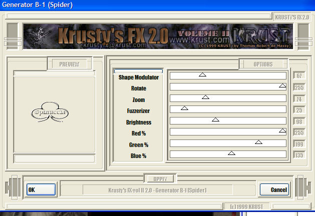 46. Effetti>Plugins>Krusty FX vol 2/Generator B1: (Spider): con i settaggi standard: ![]() 47. Effetti>Plugins>FM Tile tools/Blend emboss, con i settaggi standard. ![]() 48. Selezione>Nessuna selezione. 49. Apri il tube krw-introspect e vai a Modifica>copia. 50. Torna al tuo lavoro e vai a Modifica>Incolla>Incolla come nuovo livello. 51. Cambia la modalità di miscelatura in Moltiplica. 52. Posizionalo sotto il bordo più largo.53. Apri krw-introSwirl e vai a Modifica>Copia. 54. Torna al tuo lavoro e vai a Modifica>Incolla>Incolla come nuovo livello. Spostalo nell'angolo in alto a sinistra.55. Aggiungi la tua firma, se vuoi. 56. Livelli>Unisci>Unisci tutto (appiattisci) e salva in formato jpg.