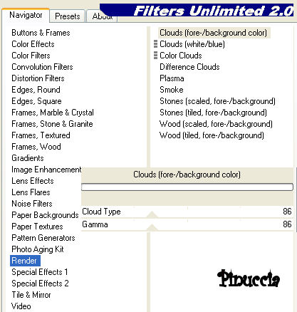 4. Effetti>Plugins>Filters Unlimited 2 - Render - Clouds (fore-background):