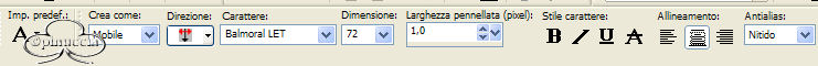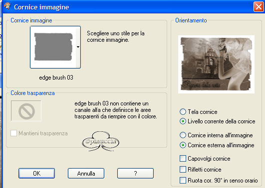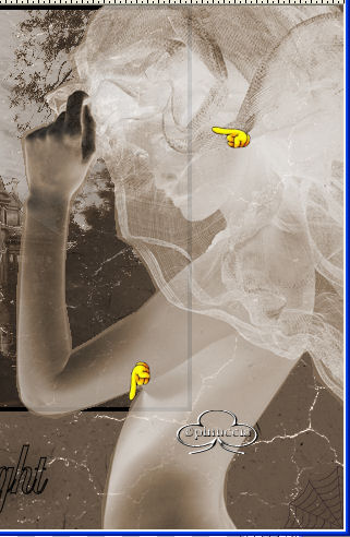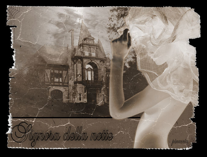 qui puoi trovare qualche risposta ai tuoi dubbi. Se l'argomento che ti interessa non è presente, ti prego di segnalarmelo. Questo tutorial è stato creato con PSP 9. Occorrente: Materiale qui Filtro Unlimited 2 qui Photo Aging Kit qui Su Photo Aging vedi qui Metti la cornice nella cartella Cornici. Apri il font e minimizzalo nella tua area di lavoro. 1. Apri una nuova immagine trasparente 640x480 pixels. 2. Imposta il colore di primo piano con #6a5848. 3. Riempi l'immagine con il colore di primo piano.4. Effetto>Plugins>Filters Unlimited 2/Photo Aging Kit/Cracked paper: con i settaggi standard. ![]() 5. Effetti>Plugins>Filters Unlimited 2/Photo Aging Kit/Hair & Dust: settaggi standard. ![]() 6. Apri il mist krw-oldberinger e vai a Modifica>Copia. 7. Torna al tuo lavoro e vai a Modifica>Incolla>Incolla come nuovo livello. 8. Posizionalo nell'angolo in alto a sinistra.9. Con la bacchetta magica seleziona l'area vuota intorno al mist.10. Selezione>Inverti. 11. Livelli>Nuovo livello raster. 12. Riempi il nuovo livello con il nero.13. Selezione>Modifica>Contrai di 4 pixels. 14. Premi sulla tastiera il tasto CANC. 15. Selezione>Nessuna selezione. 16. Apri il mist krw-veiledfemale. 17. Regola>Bilanciamento colore>Immagine negativa. 18. Regola>Saturazione e tonalità>Viraggio: ![]() 19. Modifica>Copia. Torna al tuo lavoro e vai a Modifica>Incolla>Incolla come nuovo livello. 20. Immagine>Rifletti. 21. Spostala sul lato destro, vedi l'esempio della tag finale.22. Abbassa l'opacità di questo livello all'80%. 23. Imposta il colore di primo piano sul nero e chiudi il colore di sfondo. 24. Attiva lo strumento Testo , con questi settaggi:mobile, Balmoral LET, dimensione 72, pennellata 1, allineamento centrale: ![]() 25. Scrivi "Mistress of the night" e posiziona il testo come nell'esempio. 26. Effetti>Effetti 3D>Sfalsa ombra, con i seguenti settaggi: ![]() 27. Livelli>Innalza selezione a livello. 28. Selezione>Nessuna selezione. 29. Apri il tube "web" e vai a Modifica>Copia. 30. Torna al tuo lavoro e vai a Modifica>Incolla>Incolla come nuovo livello. 31. Posizionalo nell'angolo in alto a sinistra.32. Livelli>Duplica. 33. Immagine>Capovolgi. Immagine>Rifletti. 34. Attiva lo strumento Gomma , dimensione 5, e cancella il filo della ragnatelanell'angolo in basso a destra. ![]() 35. Effetti>Effetti 3D>Sfalsa ombra, con i settaggi del passo 26. 35. Nella paletta dei livelli attiva il livello raster 3 (la cornice nera). 36. Cancella i segni della cornice che si vedono sotto la donna. ![]() 37. Livelli>Unisci>Unisci visibile. 38. Immagine>Cornice-immagine: seleziona edge brush 03, con i seguenti settaggi: ![]() 39. Seleziona il bordo bianco con la bacchetta magica , sfumatura e tolleranza 0.40. Riempi la selezione con il nero.41. Selezione>Nessuna selezione. 42. Aggiungi la tua firma e salva in formato jpg. ![]()