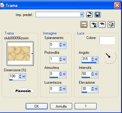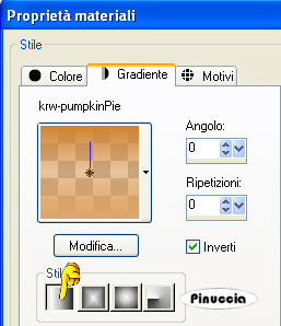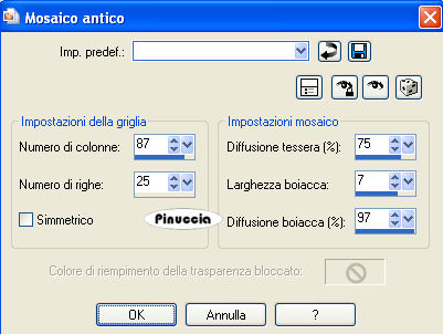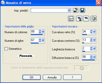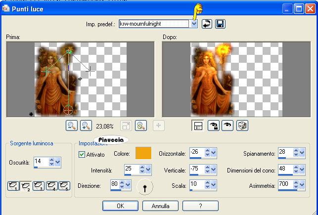 qui puoi trovare qualche risposta ai tuoi dubbi. Se l'argomento che ti interessa non è presente, ti prego di segnalarmelo. Questo tutorial è stato creato con PSP 9, ma può essere eseguito anche con le altre versioni di PSP. Per tradurlo, ho usato PSP X. Occorrente: Materiale qui Filtri: FM Tile Tools qui DSB Flux qui Metti la trama "club000056zoom" nella cartella Trame. Metti il preset nella cartella Impostazioni predefinite. Metti il gradiente "krw-pumpkinPie" nella cartella Gradienti. Apri i fonts e minimizzali nella tua area di lavoro. Li troverai nella lista dei fonts disponibili quando ti serviranno. 1. Imposta il colore di primo piano con #bb621e, e il colore di sfondo con #143840. 2. Apri una nuova immagine trasparente 800 x 600 pixels, e riempila con il colore di sfondo.3. Effetti>Effetti di trama>Trama - seleziona la trama club000056zoom, con i seguenti settaggi: ![]() 4. Ripeti l'Effetto Trama. 5. Livelli>Nuovo livello raster. 6. Passa il colore di primo piano a Gradiente e seleziona il gradiente krw-pumpkinPie, con i seguenti settaggi: ![]() 7. Effetti>Effetti di trama>Mosaico di vetro: ![]() 8. Effetti>Effetti di trama>Trama, con i settaggi precedenti. ![]() 9. Apri il tube Ametista_beyond_the_horizon_0109 mist, e vai a Modifica>Copia. Torna al tuo lavoro e vai a Modifica>Incolla come nuovo livello. Immagine>Rifletti. 10. Spostalo nell'angolo in basso a destra.11. Cambia la modalità di miscelatura di questo livello in Luce diffusa, e abbassa l'opacità all'80%. 12. Livelli>Nuovo livello raster. 13. Riempi il livello con il colore di primo piano.14. Cambia la modalità di miscelatura di questo livello in Colore (esistente). 15. Apri krw-mournfulclouds.jpg e vai a Modifica>Copia. Torna al tuo lavoro e vai a Modifica>Incolla come nuovo livello. 16. Cambia la modalità di miscelatura di questo livello in Luce netta. 17. Livelli>Nuovo livello raster. 18. Riempi con il colore di primo piano.19. Cambia la modalità di miscelatura di questo livello in Colore (esistente). 20. Apri Amber Fantasy Challenge mist, e vai a Modifica>copia. Torna al tuo lavoro e vai a Modifica>Incolla come nuovo livello. 21. Sposta il tube contro il bordo sinistro.22. Abbassa l'opacità di questo livello al 72%. 23. Effetti>Effetti di illuminazione>Punti luce: apri il menu delle impostazioni predefinite, seleziona il preset krw-mournfulnight e clicca ok. ![]() 24. Apri krw-floral16 mist, e vai a Modifica>Copia. Torna al tuo lavoro e vai a Modifica>Incolla come nuovo livello. Immagine>Rifletti. Sposta il tube nell'angolo in basso a destra.25. Regola>Tonalità e saturazione>Viraggio: ![]() 26. Effetti>Plugins>FM Tile Tools - Blend Emboss, con i settaggi standard - 2 volte: ![]() 27. Abbassa l'opacità di questo livello al 56%. 28. Imposta il colore di sfondo con il nero. 29. Attiva lo strumento Testo , font Ancestory SF, crea come vettore,dimensione 72 per PSP9, da regolare se stai usando PSP X (nel mio esempio ho impostato a 100): ![]() Scrivi Mournful e posiziona il testo a destra, contro il bordo superiore (vedi il mio esempio). 30. Livelli>Converti in livello raster. 31. Livelli>Duplica. 32. Effetti>Plugins>DSB Flux - Blast: ![]() 33. Cambia la modalità di miscelatura di questo livello in Luce diffusa, e abbassa l'opacità al 36%. 34. Imposta il font Budoken SF, dimensione 48 per PSP 9, da regolare per PSP X (il mio 72): ![]() Scrivi "night" e posizionalo sotto la lettera M di Mournful. 35. Livelli>Converti in livello raster. 36. Livelli>Duplica. 37. Immagine>Capovolgi. 38. Sposta questo sotto sotto l'originale in modo che il fondo delle lettere si tocchino, tranne la lettera g che si sovrapporrà.![]() 39. Effetti>Plugins>DSB Flux - Blast, con i settaggi precedenti. ![]() 40. Cambia la modalità di miscelatura di questo livello in Luce diffusa, e abbassa l'opacità al 36%. 41. Aggiungi, se vuoi, la tua firma, applicando l'Effetto DSB Flux, come per il testo principale. 42. Livelli>Unisci>Unisci tutto (appiattisci). 43. Immagine>Aggiungi bordatura, 2 pixels, simmetriche, con il colore nero. Immagine>Aggiungi bordatura, 2 pixels, simmetriche, con il colore di primo piano. Immagine>Aggiungi bordatura, 25 pixels, simmetriche, con il colore nero. 44. Selezione>Seleziona tutto. Selezione>Modifica>Contrai - 29 pixels. Selezione>Inverti. 45. Effetti>Effetti di trama>Mosaico antico: ![]() 46. Regola>Sfocatura>Sfocatura gaussiana - raggio 8: ![]() 47. Effetti>Effetti 3D>Ritaglio: ![]() 48. Livelli>Nuovo livello raster. Riempi con il colore nero.49. Selezione>Inverti. Selezione>Modifica>Espandi - 5 pixels. Selezione>inverti. Premi sulla tastiera il tasto CANC ![]() Selezione>Deseleziona. 50. Livelli>Unisci>Unisci tutto (appiattisci). 51. Immagine>Aggiungi bordatura, 5 pixels, simmetriche, con il colore nero. 52. Apri il tube krw-mournfulCorner e vai a Modifica>Copia. Torna al tuo lavoro e vai a Modifica>incolla come nuovo livello. 53. Spostalo nell'angolo in alto a sinistra.54. Livelli>Duplica. Immagine>Rifletti. 55. Livelli>Duplica. Immagine>Capovolgi. Immagine>Ruota per gradi - 25 gradi a sinistra. ![]() 56. Livelli>Unisci>Unisci tutto (appiattisci) e salva in formato jpg. Se hai problemi o dubbi, o trovi un link non funzionante, o anche soltanto per un saluto, scrivimi. 11 Febbraio 2009 |