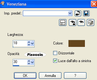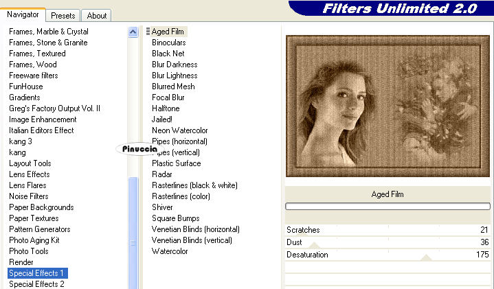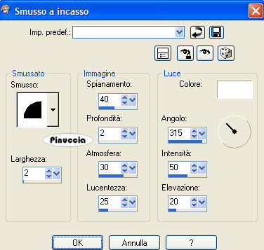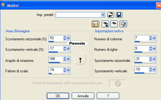 qui puoi trovare qualche risposta ai tuoi dubbi. Se l'argomento che ti interessa non è presente, ti prego di segnalarmelo. Questo tutorial è stato scritto e tradotto con PSP 9. Questo tutorial è stato scritto e tratto con PSP 9. Occorrente: Materiale qui Filtri: Filters Unlimited qui FM Tile Tools qui 1. Apri una nuova immagine trasparente 600 x 400 pixels. 2. Imposta il colore di primo piano con #c5a77b e il colore di sfondo con #65451c. 3. Riempi l'immagine trasparente con il colore di primo piano.4. Livelli>Unisci>Unisci tutto (appiattisci). 5. Effetti>Effetti di trama>Veneziana: ![]() 6. Effetti>Effetti di riflesso>Motivi: ![]() 7. Effetti>Plugins>FM Tile Tools - Blend Emboss, con i settaggi standard. ![]() 8. Ripeti l'Effetto Veneziana. 9. Shift + D per duplicare la tua immagine di sfondo e minimizzala. Continua sull'originale. 10. Immagine>Aggiungi bordatura, 5 pixels, simmetriche, con il colore di sfondo. 11. Seleziona il bordo con la bacchetta magica ![]() 12. Effetti>Effetti 3D>Smusso a incasso: ![]() 13. Selezione>Nessuna selezione. 14. Immagine>Aggiungi bordatura, 25 pixels, simmetriche, con il colore bianco. 15. Seleziona il bordo con la bacchetta magica ![]() 16. Apri il duplicato del tuo sfondo che hai minimizzato al passo 9 e vai a Modifica>Copia. 17. Torna al tuo lavoro e vai a Modifica>Incolla>Incolla nella selezione. 18. Effetti>Effetti 3D>Smusso a incasso, con i settaggi precedenti. 19. Selezione>Nessuna selezione. 20. Immagine>Aggiungi bordatura, 5 pixels, simmetriche, con il colore di sfondo. 21. Seleziona il bordo con la bacchetta magica ![]() 22. Effetti>Effetti 3D>Smusso a incasso, con i settaggi precedenti. 23. Selezione>Nessuna selezione. 24. Apri il mist krw-fogFemale e vai a Modifica>Copia. 25. Torna al tuo lavoro e vai a Modifica>Incolla>Incolla come nuovo livello. 26. Spostalo nell'angolo in basso a sinistra,assicurandoti che non copra il bordo. 27. Cambia la modalità di miscelatura in Luminanza (esistente). 28. Apri il mist krw-fogCouple e vai a Modifica>Copia. 29. Torna al tuo lavoro e vai a Modifica>Incolla>Incolla come nuovo livello. 30. Sposta il tube a destra, contro il bordo.31. Cambia la modalità di miscelatura in Luminanza (esistente) e abbassa l'opacità al 50%, 32. Livelli>Unisci>Unisci tutto (appiattisci). 33. Effetti>Plugins>Filters Unlimited 2 - Special Effects 1 - Aged Film, con i settaggi standard. ![]() 34. Apri il tube krw-bemyloveText e vai a Modifica>Copia. Torna al tuo lavoro e vai a Modifica>Incolla>Incolla come nuovo livello. 36. Sposta il testo in basso, come nel mio esempio.47. Cambia la modalità di miscelatura in Filtra. 38. Aggiungi la tua firma. Livelli>Unisci>Unisci tutto (appiattisci). Salva in formato jpg. ![]() Se hai problemi o dubbi, o trovi un link non funzionante, o anche soltanto per un saluto, scrivimi. 30 Maggio 2007 |