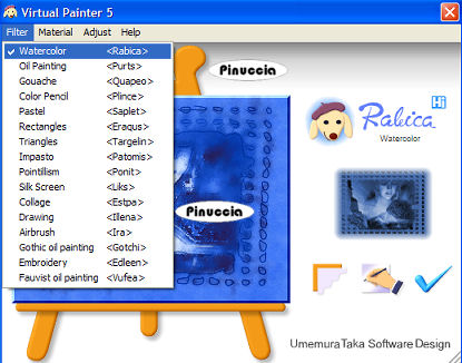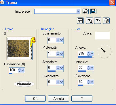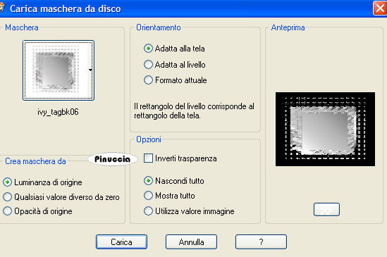 qui puoi trovare qualche risposta ai tuoi dubbi. Se l'argomento che ti interessa non è presente, ti prego di segnalarmelo. Questo tutorial è stato scritto con PSP 9. Occorrente: Materiale qui Filtro Virtual Painter 5 Metti la trama nella cartella Trame di PSP e la maschera nella cartella Maschere di PSP. 1. Apri una nuova immagine trasparente 640 x 480 pixels. 2. Riempi l'immagine con il colore #2272a4.3. Effetti>Effetti di trama>Trama: apri il menu cliccando sulla freccia a fianco del box e seleziona la trama 8, fornita con il tutorial: ![]() 4. Livelli>Nuovo livello raster. 5. Riempi il nuovo livello con #09588a.6. Livelli>Carica/Salva maschera>Carica maschera da disco: cerca e carica la maschera ivy_tagbk06: ![]() 7. Livelli>Unisci>Unisci gruppo. 8. Effetti>Effetti 3D>Sfalsa ombra, con i seguenti settaggi, colore #021928. ![]() 9. Selezione>Seleziona tutto. 10. Selezione>Mobile. 11. Selezione>Immobilizza. 12. Livelli>Nuovo livello raster. 13. Apri l'immagine 23.jpg e vai a Modifica>Copia. 14. Torna al tuo lavoro e vai a Modifica>Incolla>Incolla nella selezione. 15. Selezione>Nessuna selezione. 16. Apri il mist Pandora e vai a Modifica>Copia. 17. Torna al tuo lavoro e vai a Modifica>Incolla>Incolla come nuovo livello. 18. Immagine>Rifletti. 19. Posiziona il tube come mostrato nell'esempio.![]() 20. Cambia la modalità di miscelatura di questo livello in Luminanza (esistente). 21. Attiva lo strumento Gomma , con i seguenti settaggi:![]() 22. Cancella la parte del tube che esce dai bordi della maschera. ![]() 23. Livelli>Unisci>Unisci visibile. 24. Regola>Saturazione e tonalità>Viraggio: ![]() 25. Livelli>Duplica. 26. Effetti>Plugins>Virtual Painter: Apri il menu filter e seleziona "Watercolor: ![]() Quindi, imposta il settaggio Material: Wood (rough): ![]() e infine imposta i settaggi del menu Adjust: scale normal; material normal; rendering subtle; color normal; deformation subtle; focus intense: ![]() Quando hai finito clicca sul segno di spunta per applicare il filtro. Avrai questo: ![]() 27. Cambia la modalità di miscelatura di questo livello in Luminanza (esistente) e abbassa l'opacità al 65%. 28. Attiva nuovamente lo strumento Gomma ![]() e cancella l'area mostrata nella schermata sotto: per mostrare meglio l'esempio, ho nascosto il livello inferiore. ![]() 29. Aggiungi la tua firma o il tuo watermark. 30. Livelli>Unisci>Unisci tutto (appiattisci), e salva in formato jpg. ![]() Se hai problemi o dubbi, o trovi un link non funzionante, o anche soltanto per un saluto, scrivimi. 26 Febbraio 2007 |