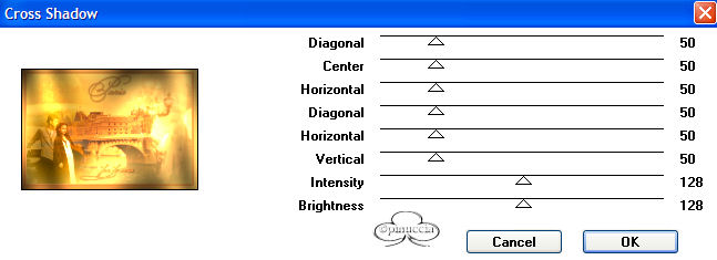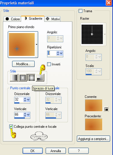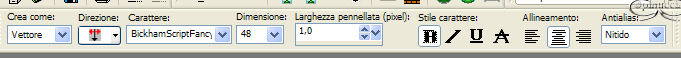 qui puoi trovare qualche risposta ai tuoi dubbi. Se l'argomento che ti interessa non è presente, ti prego di segnalarmelo. Questo tutorial è stato scritto in PSP. Occorrente: Filtro Bordermania qui Materiale qui 1. Apri una nuova immagine trasparente 600 x 400 pixels. 2. Imposta il colore di primo piano con #c36120. 3. Imposta il colore di sfondo con #eac262. 4. Riempi l'immagine con il colore di sfondo.5. Apri il tube krw-paris bridge. 6. Modifica>Copia. Torna al tuo lavoro (l'immagine 600x400) e vai a Modifica>Incolla>Incolla come nuovo livello. 7. Nella paletta dei livelli abbassa l'opacità di questo livello al 78%. 8. Apri il tube krw-paris fountain. 9. Modifica>Copia. Torna al tuo lavoro e vai a Modifica>Incolla>Incolla come nuovo livello. 10. Nella paletta dei livelli cambia la modalità di miscelatura in Luce diffusa e abbassa l'opacità all'80%. 11. Spostalo in alto nell'angolo sinistro.12. Apri il tube krw-paris collage. 13. Modifica>Copia. Torna al tuo lavoro e vai a Modifica>Incolla>Incolla come nuovo livello. 14. Nella paletta dei livelli abbassa l'opacità al 50%. 15. Spostalo sul bordo destro dell'immagine.16. Nella paletta dei livelli posizionati sul livello del ponte per selezionarlo. 17. Attiva lo strumento Gomma , con i seguenti settaggi:![]() 18. Cancella nel livello del ponte soltanto la parte che si vede sotto i visi. ![]() 19. Attiva lo strumento Attenua con i settaggi standard.20. Posizionati sul livello del tube "Paris collage" e applicalo intorno al bordo sinistro del tube. 21. Apri il tube krw-paris couple. 22. Modifica>Copia. Torna al tuo lavoro e vai a Modifica>Incolla>Incolla come nuovo livello. 23. Nella paletta dei livelli cambia la modalità di miscelatura in Luminanza (esistente) e abbassa l'opacità all'80%. 24. Spostalo in basso nell'angolo sinistro dell'immagine.25. Apri il font e minimizzalo. 26. Attiva lo strumento testo ![]() 27. Seleziona il font con i seguenti settaggi: ![]() Scrivi "Paris" o il testo che preferisci e clicca Applica. 28. Centralo nel cielo in alto nell'immagine. 29. Nella paletta dei livelli clicca con il tasto destro del mouse e converti il livello vettore in livello raster. 30. Effetti>Effetti 3D>Sfalsa ombra, con i seguenti settaggi: ![]() 31. Lo strumento testo è ancora selezionato. Cambia soltanto la dimensione in 36. 32. Clicca sull'immagine e scrivi "for lovers" o il testo che preferisci, clicca applica. 33. Posizionalo in basso nel centro dell'immagine e converti il livello vettore in livello raster. 34. Effetti>Effetti 3D>Sfalsa ombra, con i settaggi precedenti. 35. Livelli>Unisci>Unisci tutto (appiattisci). 36. Immagine>Aggiungi bordatura, 2 pixels, simmetriche, con il colore di primo piano. 37. Immagine>Aggiungi bordatura, 2 pixels, simmetriche, con il colore di sfondo. 38. Immagine>Aggiungi bordatura, 2 pixels, simmetriche, con il colore di primo piano. 39. Immagine>Aggiungi bordatura, 10 pixels, simmetriche, con il colore BIANCO. 40. Seleziona il bordo bianco con la bacchetta magica ![]() assicurati che la sfumatura sia a 0. 41. Cambia il colore di primo piano in gradiente. 42. Seleziona il gradiente di primo piano/sfondo, con i seguenti settaggi: ![]() 43. Riempi la selezione con il gradiente.Mantieni selezionato. 44. Effetti>Plugins>GraphicsPlus/Cross Shadow, con i settaggi standard. ![]() clicca ok. Mantieni selezionato. 45. Effetti>Plugins>Bordermania>Frame 2, con i seguenti settaggi: ![]() 46. Selezione>Inverti. 47. Effetti>Effetti 3D>Ritaglio, con i seguenti settaggi: ![]() clicca ok. 48. Ripeti l'Effetto Ritaglio, ma cambiando verticale e orizzontale a -6. 49. Selezione>Nessuna selezione. 50. Firma, se vuoi, e salva in formato jpg.