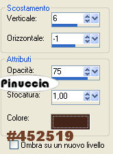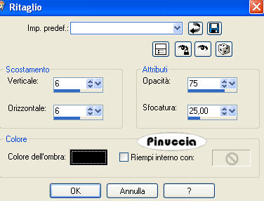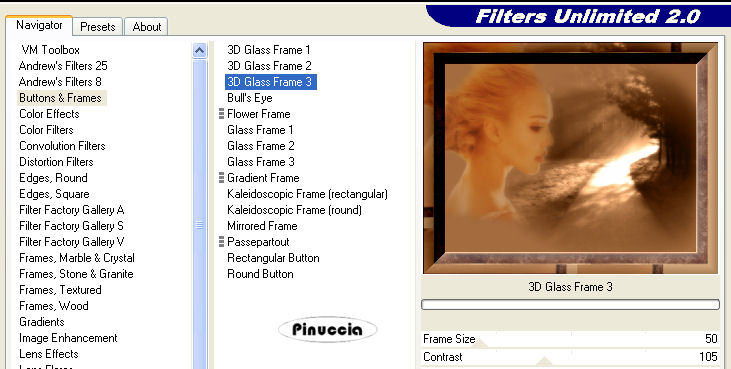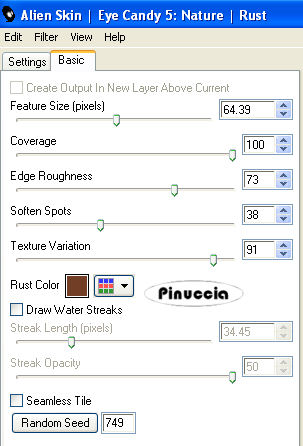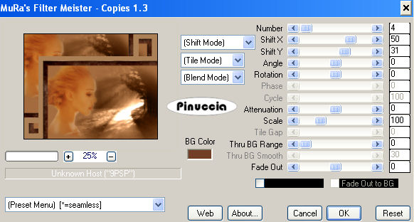 ![]() 22. Livelli>Unisci>Unisci visibile. 23. Effetti>Plugins>Xero - Soft Mood, con i seguenti settaggi. ![]() nota: alcune versioni di questo filtro non hanno la parte inferiore con le voci "Contrast" e "Brightness". Va bene lo stesso. 24. Effetti>Plugins>Adjust/Variations: clicca una volta su Original e una volta su Lighter. 25. Immagine>Aggiungi bordatura, 2. pixels, simmetriche, con il colore di sfondo (#723e26). 26. Immagine>Aggiungi bordatura, 25 pixels, simmetriche, con il colore di primo piano (#ac8056). 27. Seleziona il bordo da 25 pixels con la bacchetta magica ![]() 28. Effetti>Plugins>Alien Skin Eye Candy Nature - Rust, con i seguenti settaggi, con il colore di sfondo. ![]() 29. Effetti>Effetti 3D>Ritaglio, con i seguenti settaggi, colore nero: ![]() 30. Selezione>Nessuna selezione. 31. Apri il pattern Circlelayer che hai trovato nello zip e minimizzalo nella tua area di lavoro. Imposta il colore di primo piano su Motivi e lo troverai nella lista dei motivi disponibili, cliccando sulla freccia a destra del box. Seleziona il motivo con questi settaggi: ![]() 32. Immagine>Aggiungi bordatura, 2 pixels, simmetriche, con il colore bianco. 33. Seleziona il bordo bianco con la bacchetta magica ![]() 34. Riempi la selezione con il Motivo.35. Selezione>Nessuna selezione. 36. Riporta il colore di primo piano al colore #ac8056. 37. Immagine>Aggiungi bordatura, 25 pixels, simmetriche, con il colore di primo piano. 38. Seleziona il bordo con la bacchetta magica ![]() 39. Effetti>Plugins>Mura's Meister - Copies, con i seguenti settaggi: ![]() 40. Effetti>Plugins>Filters Unlimited 2 - Buttons & Frames - 3D Glass Frame: ![]() 41. Selezione>Nessuna selezione. 42. Apri il mist krw-floral12 e vai a Modifica>Copia. 43. Torna al tuo lavoro e vai a Modifica>Incolla>Incolla come nuovo livello. 44. Spostalo nell'angolo in basso a sinistra.45. Cambia la modalità di miscelatura di questo livello in Luce Diffusa. 46. Attiva lo strumento Testo , e seleziona il font Vivaldi, con i seguenti settaggi:![]() 47. Scrivi "Where the path", premi Invio e vai alla seconda linea, e scrivi "leads me" clicca applica. la traduzione in italiano di questo testo è: Dove il sentiero mi conduce. 48. Sposta il testo nell'angolo in basso a destra. 49. Livelli>Converti in livello raster. 50. Effetti>Effetti 3D>Sfalsa ombra, con i seguenti settaggi, colore #452519. ![]() 51. Se vuoi, aggiungi la tua firma o il tuo watermark. 52. Livelli>Unisci>Unisci tutto (appiattisci) e salva in formato jpg. ![]() ![]() Se hai problemi o dubbi, o trovi un link non funzionante, o anche soltanto per un saluto, scrivimi. 7 Marzo 2007 |