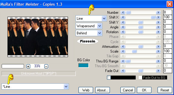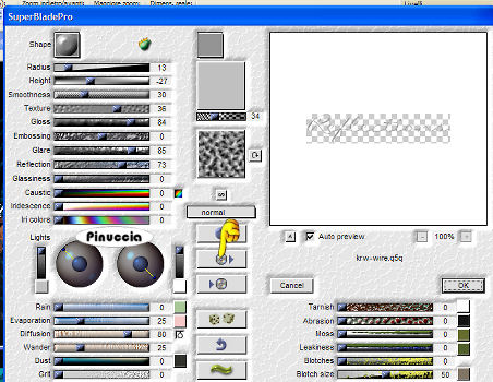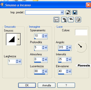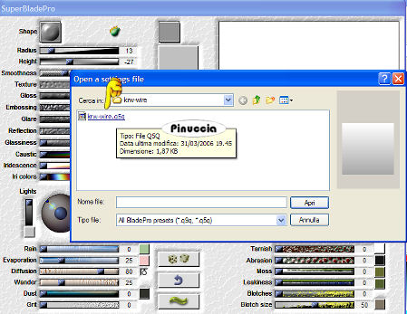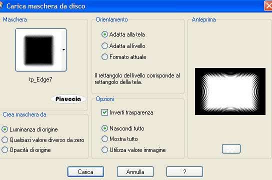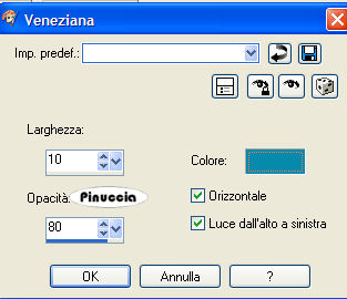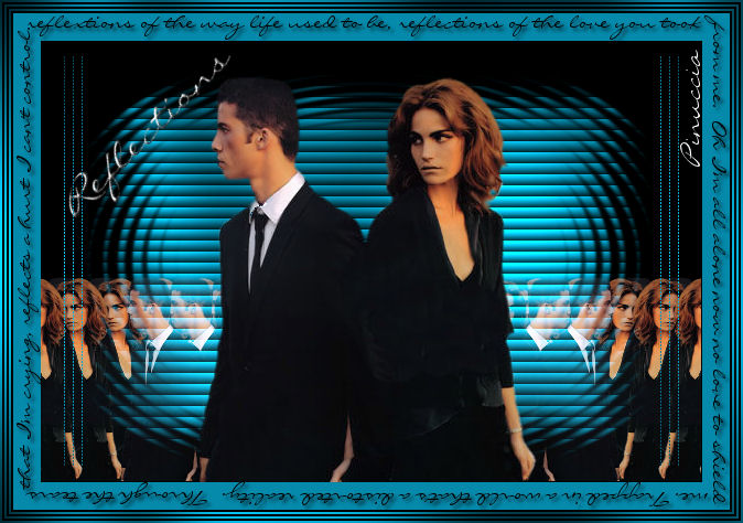 qui puoi trovare qualche risposta ai tuoi dubbi. Se l'argomento che ti interessa non è presente, ti prego di segnalarmelo. Questo tutorial è stato scritto e tradotto con PSP 9. Occorrente: Materiale qui Filtro Mura's Meister - Copies qui Greg's Factory Output qui Superblade Pro qui Metti il preset krw-wire nella cartella Environment and textures di SuperBlade Pro. 1. Apri una nuova immagine NERA 600 x 400 pixels. 2. Imposta il colore di primo piano con #058aab. 3. Imposta il colore di sfondo con il nero #000000. 4. Livelli>Nuovo livello raster. Riempi con il colore di primo piano.5. Effetti>Effetti di trama>Veneziana, con i seguenti settaggi. ![]() 6. Livelli>Carica/Salva maschera>Carica maschera da disco. Cerca e carica la maschera tp_Edge7, inverti trasparenza selezionato: ![]() 7. Livelli>Unisci>Unisci gruppo. 8. Effetti>Plugins>Greg's Factory Output 2 - Pool Shadow, con i seguenti settaggi: ![]() 9. Apri il tube krw-coupleBlue e vai a Modifica>Copia. 10. Torna al tuo lavoro e vai a Modifica>Incolla>Incolla come nuovo livello. 11. Livelli>Duplica. 12. Effetti>Plugins>Mura's Meister - Copies: ![]() 13. Immagine>Ridimensiona, al 50%, tutti i livelli non selezionato. 14. Sposta l'immagine nell'angolo in basso a sinistra.15. Livelli>Duplica. 16. Immagine>Rifletti, e sposta le immagini in modo che non ci siano spazi al centro.![]() 17. Nella paletta dei livelli, trascina questi due livelli sotto il livello del tube originale. 18. Cambia la modalità di miscelatura di entrambi i livelli in Filtra. ![]() 19. Nella paletta dei livelli attiva il livello superiore, e sistema il tube sul bordo inferiore.![]() 20. Cambia il colore di sfondo con il bianco: #ffffff. 21. Apri il font che hai trovato con il materiale e minimizzalo nella tua area di lavoro. 22. Attiva lo strumento Testo ,seleziona il font Liorah, dimensione 24, pennellata 0. ![]() 23. Scrivi: Reflections, e mantieni selezionato. 24. Effetti>Plugins>Flaming Pear - SuperBlade Pro: clicca sull'icona indicata dalla manina, per cercare il preset krw-wire. ![]() Cerca il preset nella cartella dove lo hai salvato: ![]() 25. Effetti>Effetti 3D>Smusso a incasso, con i seguenti settaggi. ![]() 26. Selezione>Innalza selezione a livello. Selezione>Nessuna selezione. 27. Immagine>Ruota>Ruota per gradi, 45 gradi a sinistra, tutti i livelli non selezionato. ![]() 28. Posiziona il testo come nel mio esempio.29. Apri il tube krw-3bluelines e vai a Modifica>Copia. 30. Torna al tuo lavoro e vai a Modifica>Incolla>Incolla come nuovo livello. 31. Livelli>Unisci>Unisci tutto (appiattisci). 32. Immagine>Aggiungi bordatura, 25 pixels, simmetriche, con il colore di primo piano. 33. Apri krw-lyricFrame e vai a Modifica>Copia. Torna al tuo lavoro e vai a Modifica>Incolla>Incolla come nuovo livello. 34. Effetti>Effetti 3D>Sfalsa ombra, con i seguenti settaggi, colore nero: ![]() 35. Immagine>Aggiungi bordatura, 2 pixels, simmetriche, con il colore di sfondo. Immagine>Aggiungi bordatura, 2 pixels, simmetriche, con il colore di primo piano. 36. Ripeti il passo 35 due volte. 37. Selezione>Seleziona tutto. Selezione>Modifica>Contrai, di 12 pixels. 38. Selezione>Inverti. 39. Effetti>Plugins>Greg's Factory Output 2 - Pool Shadow, con i settaggi precedenti. 40. Selezione>Nessuna selezione. 41. Aggiungi la tua firma, se vuoi. Livelli>Unisci>Unisci tutto (appiattisci) e salva in formato jpg. ![]() Se hai problemi o dubbi, o trovi un link non funzionante, o anche soltanto per un saluto, scrivimi. 1 Giugno 2007 |