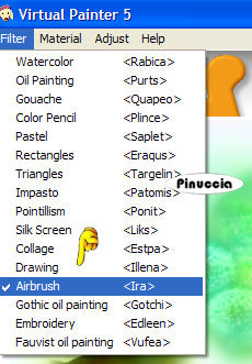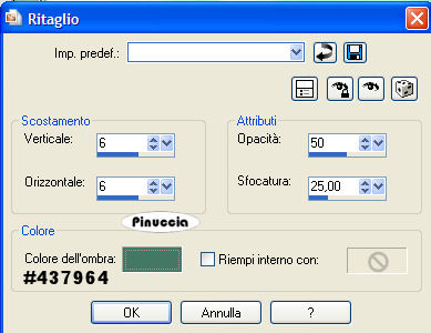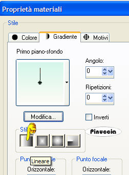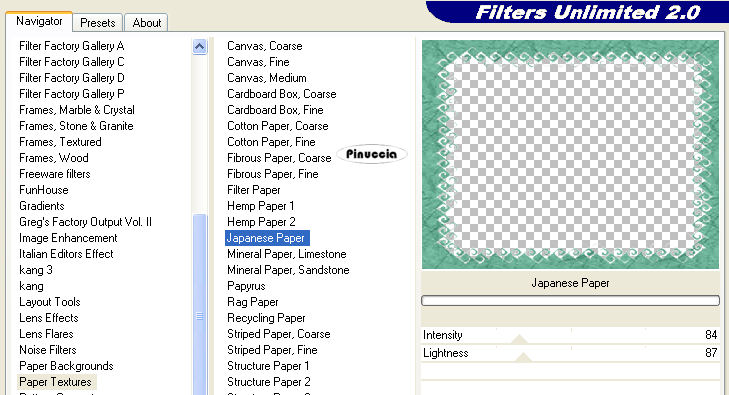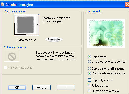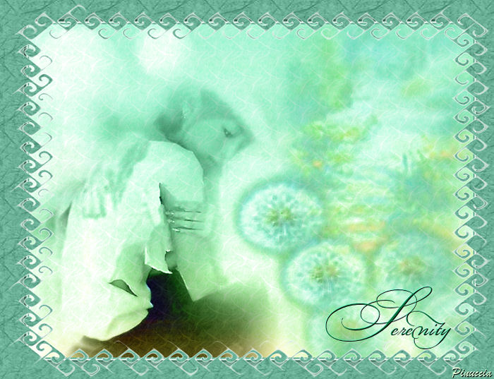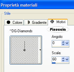 qui puoi trovare qualche risposta ai tuoi dubbi. Se l'argomento che ti interessa non è presente, ti prego di segnalarmelo. Questo tutorial è stato scritto e tradotto con PSP 9. Occorrente: Materiale qui Filtri: Filters Unlimited 2 - Render qui Virtual Painter 5 qui. I tubes usati sono di Inspiration Mists, Gwyn Mists e Cdw. Per favore, rispetta il loro lavoro: non cambiare il nome del file e non rimuovere il watermark. Metti il file Edge design02 nella cartella Cornici immagine di PSP. Apri il Motivo DG-Diamonds, e minimizzalo nella tua area di lavoro. Lo troverai nella lista dei motivi disponibili, quando ti servirà. Apri il font e minimizzalo nella tua area di lavoro. Lo troverai tra i font disponibili, quando ti servirà. 1. Imposta il colore di primo piano con il bianco e il colore di sfondo con #d5f6ea. 2. Passa il colore di primo piano a Gradiente di primo piano/sfondo, stile lineare: ![]() 3. Apri una nuova immagine trasparente 640 x 480 pixels. 4. Riempi l'immagine trasparente con il gradiente.5. Apri il tube krw-white sphere e vai a Modifica>Copia. 6. Torna al tuo lavoro e vai a Modifica>Incolla>Incolla come nuovo livello. 7. Attiva lo strumento Bacchetta magica e seleziona l'area esterna alla sfera.8. Selezione>Modifica>Espandi, 2 pixels. 9. Premi sulla tastiera il tasto canc ![]() 10. Selezione>Nessuna selezione. 11. Livelli>Duplica. 12. Immagine>Ridimensiona, al 75%, mantieni proporzioni selezionato e tutti i livelli non selezionato. ![]() 13. Ripeti i passi 11 e 12. 14. Posiziona le sfere nell'angolo in alto a sinistra, come mostrato nella schermata sotto: ![]() 15. Cambia la modalità di miscelatura di ogni livello della sfera in Luce diffusa. 16. Livelli>Duplica, tutti e tre i livelli delle sfere. ![]() 17. Livelli>Unisci>Unisci tutto (appiattisci). 18. Apri il tube gwyn_mist_a_breath_of_wind e vai a Modifica>Copia. 19. Torna al tuo lavoro e vai a Modifica>Incolla>Incolla come nuovo livello. 20. Sposta il tube nell'angolo in basso a destra,e abbassa l'opacità di questo livello al 60%. ![]() 21. Livelli>Duplica, e posiziona il tube come mostrato nella schermata:![]() 22. Apri il tube Misted_Brick_Path_RM e vai a Modifica>Copia. 23. Torna al tuo lavoro e vai a Modifica>Incolla>Incolla come nuovo livello. 24. Sposta il tube nell'angolo in alto a destra,e abbassa l'opacità di questo livello al 22%. ![]() 25. Livelli>Disponi>Sposta giù, due volte. ![]() 26. Nella paletta dei livelli attiva il livello superiore. 27. Apri il tube CdW-EndlessSorrow e vai a Modifica>Copia. 28. Torna al tuo lavoro e vai a Modifica>Incolla>Incolla come nuovo livello. 29. Immagine>Rifletti. 30. Sposta il tube nell'angolo in basso a sinistra.Cambia la modalità di miscelatura di questo livello in Luminanza (esistente). 31. Livelli>Unisci>Unisci tutto (appiattisci). 32. Effetti>Plugins>Virtual Painter 5: sotto la linguetta Filter, seleziona Airbrush: ![]() Sotto la linguetta Material, seleziona Washi: ![]() Sotto la linguetta Adjust, seleziona, una alla volta, tutte le voci del menu: Scale - normal; Material - intense; Rendering - subtle; Color - subtle; Deformation - subtle; Focus - subtle: ![]() 33. Shift + D per duplicare l'immagine e minimizzala per usarla più tardi. 34. Immagine>Aggiungi bordatura, 2 pixels, simmetriche, con il colore #6fb69c. 35. Immagine>Aggiungi bordatura, 2 pixels, simmetriche, con il colore bianco. 36. Seleziona il bordo bianco con la bacchetta magica ![]() 37. Imposta il colore di primo piano su Motivi e seleziona DG-Diamonds, angolo 0, scala 60. ![]() 38. Riempi la selezione con questo motivo.Mantieni selezionato. 39. Livelli>Nuovo livello raster. 40. Imposta il colore di sfondo con #6fb69c. 41. Riempi la selezione,e imposta la modalità di miscelatura di questo livello in Sovrapponi. 42. Selezione>Nessuna selezione. 43. Livelli>Unisci>Unisci tutto (appiattisci). 44. Immagine>Aggiungi bordatura, 2 pixels, simmetriche, con il colore #437964. 45. Immagine>Aggiungi bordatura, 25 pixels, simmetriche, con il colore bianco. 46. Seleziona il bordo bianco con la bacchetta magica ![]() 47. Attiva l'immagine che hai duplicato al passo 32 e vai a Modifica>Copia. 48. Torna al tuo lavoro e vai a Modifica>Incolla>Incolla nella selezione. Mantieni selezionato. 49. Effetti>Effetti di bordo>Trova bordi. 50. Livelli>Nuovo livello raster. 51. Riempi con il colore di sfondo.per riempire con il colore di sfondo devi cliccare con il tasto destro del mouse. 52. Cambia la modalità di miscelatura di questo livello in Moltiplica, e abbassa l'opacità al 70%. 53. Mantieni selezionato. 54. Livelli>Unisci>Unisci tutto (appiattisci). 55. Effetti>Effetti 3D>Ritaglio, con i seguenti settaggi, colore #437964. ![]() 56. Ripeti l'Effetto Ritaglio, ma cambiando orizzontale e verticale a -6. 57. Selezione>Nessuna selezione. 58. Immagine>Cornice immagine, seleziona Edge design 02, con i seguenti settaggi: ![]() 59. Selezione>Seleziona tutto. Selezione>Mobile Selezione>Immobilizza. 60. Riempi con il colore di sfondo.61. Effetti>Plugins>Filters Unlimited 2 - Paper Textures - Japanese paper, con i settaggi standard. ![]() 62. Selezione>Seleziona tutto. Selezione>modifica>Contrai, di 10 pixels. 63. Immagine>Ritaglia la selezione. 64. Attiva lo strumento Testo , crea come vettore,font BickhamScriptFancy 2, dimensione 72, pennellata 0. 65. Scrivi la lettera "S", ma non cliccare ancora su Applica. 66. Cambia la dimensione in 48 e scrivi "erenity", quindi clicca Applica. 67. Posiziona il testo nell'angolo in basso a destra. 68. Livelli>Converti in livello raster. 69. Effetti>Effetti 3D>Sfalsa ombra, con i seguenti settaggi, ombra su nuovo livello selezionato. ![]() 70. Nella paletta dei livelli attiva il livello del testo (è quello superiore), e cambia la modalità di miscelatura in Luce netta. 71. Aggiungi la tua firma, se vuoi. 72. Livelli>Unisci>Unisci tutto (appiattisci) e salva in formato jpg. ![]() Se hai problemi o dubbi, o trovi un link non funzionante, o anche soltanto per un saluto, scrivimi. 14 Maggi