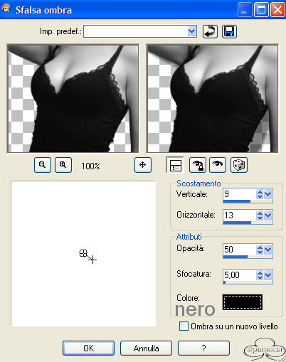 qui puoi trovare qualche risposta ai tuoi dubbi. Se l'argomento che ti interessa non è presente, ti prego di segnalarmelo. Questo tutorial è stato scritto con PSP 9. Occorrente: Filtro Alien Skin Eye Candy 5 Nature qui Materiale qui 1. Metti la maschera nella cartella maschere di PSP. 2. Apri una nuova immagine trasparente 600 x 600 pixels. 3. Imposta il colore di primo piano con #477547. e il colore di sfondo con il nero #000000. 4. Riempi l'immagine con il colore di primo piano.5. Livelli>Unisci>Unisci tutto (appiattisci). 6. Effetti>Plugins>Alien Skin Eye Candy 5 Nature/Rust. Seleziona il Preset Medium, Patina High Coverage: ![]() Nella sezione Basic cambia il "Rust color" con il colore di primo piano. ![]() Nella paletta dei livelli clicca con il tasto destro del mouse sul livello Sfondo e scegli Innalza livello di sfondo. ![]() 7. Livelli>Nuovo livello raster. 8. Riempi questo livello con il colore nero.Cambia il colore di sfondo con #808080. 9. Livelli>Disponi>Sposta sotto. 10. Nella paletta dei livelli seleziona il livello superiore. 11. Livelli>Carica/Salva maschera/Carica maschera da disco. Seleziona e carica la maschera "Splendidtemplatemask91". ![]() 12. Livelli>Unisci>Unisci gruppo. 13. Apri il tube krw-femaleDrama e vai a Modifica>Copia. 14. Torna al tuo lavoro e vai a Modifica>Incolla>Incolla come nuovo livello. 15. Immagine>Ridimensiona, del 75%, tutti i livelli NON selezionato. ![]() 16. Posiziona l'immagine nell'angolo in basso a destra.17. Nella paletta dei livelli cambia la modalità di miscelatura in Rafforza. 18. Immagine>Rifletti. 19. Modifica>Incolla>Incolla come nuovo livello (il tube è ancora in memoria). 20. Immagine>Ridimensiona, dell'85%, tutti i livelli NON selezionato. 21. Posiziona il tube nell'angolo in basso a destra.22. Effetti>Effetti 3D>Sfalsa ombra, con i seguenti settaggi, colore nero: ![]() 23. Apri il tube krw-brokenChain e vai a Modifica>Copia. 24. Torna al tuo lavoro e vai a Modifica>Incolla>Incolla come nuovo livello. 25. Spostalo sul bordo sinistro dell'immagine.26. Livelli>Duplica. 27. Sposta il tube duplicato in basso e allinealo con la prima catena.![]() 28. Nella paletta dei livelli cambia la modalità di miscelatura in Luminanza (esistente) e abbassa l'opacità al 50%. ![]() 29. Apri il font Uncletypewriter e minimizzalo nella tua area di lavoro. 30. Attiva lo strumento Testo , così settato:![]() 31. Scrivi "set me free" in lettere minuscole. 32. Posiziona il testo come nell'esempio della mia tag finale. 33. Nella paletta dei livelli clicca con il tasto destro del mouse sul livello vettore e scegli Converti in livello raster e cambia la modalità di miscelatura in Filtra. 34. Livelli>Unisci>Unisci tutto (appiattisci). 35. Aggiungi la tua firma e salva in formato jpg. ![]() ![]()