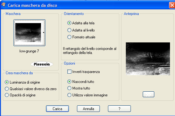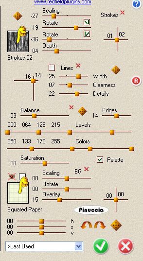 qui puoi trovare qualche risposta ai tuoi dubbi. Se l'argomento che ti interessa non è presente, ti prego di segnalarmelo. Questo tutorial è stato scritto e tradotto con PSP 9. Questo tutorial è stato scritto e tradotto con PSP 9. Occorrente: Materiale qui Filtro: Redfield Sketchmaster qui Scompatta il materiale. Metti la maschera nella cartella Maschere di PSP. Apri i font e minimizzali nella tua area di lavoro. Li troverai tra i font disponibili, quando ti serviranno. 1. Imposta il colore di primo piano con #750011 e il colore di sfondo con #211310. 2. Apri una nuova immagine trasparente 640 x 480 pixels. 3. Riempi l'immagine trasparente con il colore di primo piano.4. Livelli>Nuovo livello raster. 5. Riempi il nuovo livello con il colore di sfondo.per riempire con il colore di sfondo, devi cliccare con il tasto destro del mouse. 6. Livelli>Carica/Salva maschera>Carica maschera da disco. Cerca e carica la maschera krw-grunge7. ![]() 7. Livelli>Unisci>Unisci gruppo. 8. Apri il tube krw-female150 e vai a Modifica>Copia. 9. Torna al tuo lavoro e vai a Modifica>Incolla>Incolla come nuovo livello. 10. Spostalo nell'angolo in alto a sinistra.11. Apri il tube krw-male14SMALL. 12. Regola>Saturazione e tonalità>Viraggio: ![]() 13. Effetti>Plugins>Redfield - Sketchmaster, con i seguenti settaggi: ![]() per impostare le trame, clicca sulle palette indicate dalle manine gialle, e avrai la lista delle trame da selezionare: ![]() 14. Modifica>Copia. Torna al tuo lavoro e vai a Modifica>Incolla>Incolla come nuovo livello. 15. Immagine>Rifletti. 16. Sposta il tube contro il bordo destro.17. Attiva lo strumento Deformazione ![]() 18. Adatta il tube all'immagine in modo che non sovrasti l'immagine a sinistra. 19. Attiva lo strumento Selezione a mano libera ![]() e fai una selezione sul bordo netto a sinistra del tube, per arrotondare le spalle. Premi sulla tastiera il tasto Canc ![]() 20. Selezione>Nessuna selezione. 21. Cambia la modalità di miscelatura di questo livello in Moltiplica, e abbassa l'opacità al 50%. 22. Attiva lo strumento Testo , crea come vettore,font Distress, dimensione 48, pennellata 0. ![]() 23. Scrivi in lettera maiuscole "SOLEMN" (se vuoi, in italiano, "solenne"). 24. Sposta il testo in basso a sinistra. 25. Livelli>Converti in livello raster. 26. Effetti>Effetti 3D>Sfalsa ombra, con i seguenti settaggi, colore #750011 (colore di primo piano). ![]() 27. Inverti i colori nella paletta dei materiali, cliccando sulla freccia tra le due palette. ![]() 28. Attiva lo strumento Testo , crea come vettore,font Mascara, dimensione 48, pennellata 0. 29. Scrivi "VoW" (se vuoi, in italiano "Promessa"). 30. Livelli>Converti in livello raster. 31. Sposta appena un po' sopra la parola Solemn.32. Livelli>Unisci>Unisci tutto (appiattisci). 33. Immagine>Aggiungi bordatura, 1 pixel, simmetriche, con il colore di sfondo. per aggiungere i bordi con i colori impostati nella paletta dei colori, vedi qui Se usi questo sistema, ricordati di invertire nuovamente i colori nella paletta per riportarli all'impostazione iniziale. Immagine>Aggiungi bordatura, 1 pixel, simmetriche, con il colore di primo piano. 34. Immagine>Aggiungi bordatura, 1 pixel, simmetriche, con il colore di sfondo. Immagine>Aggiungi bordatura, 1 pixel, simmetriche, con il colore di primo piano. 35. Immagine>Aggiungi bordatura, 1 pixels, simmetriche, con il colore di sfondo. 36. Immagine>Aggiungi bordatura, 50 pixels, simmetriche, con il colore di primo piano. 37. Selezione>Seleziona tutto. Selezione>Modifica>Contrai, di 50 pixels. 38. Selezione>Inverti. 39. Livelli>Nuovo livello raster. 40. Apri il tube krw-repeat vow e vai a Modifica>Copia. 41. Torna al tuo lavoro e vai a Modifica>Incolla>Incolla nella selezione. 42. Selezione>Nessuna selezione. 43. Abbassa l'opacità di questo livello al 50%. 44. Aggiungi la tua firma, se vuoi. 45. Livelli>Unisci>Unisci tutto e salva in formato jpg. ![]() ![]() Se hai problemi o dubbi, o trovi un link non funzionante, o anche soltanto per un saluto, scrivimi. 16 Maggio 2007 |