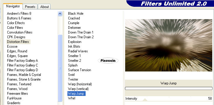 qui puoi trovare qualche risposta ai tuoi dubbi. Se l'argomento che ti interessa non è presente, ti prego di segnalarmelo. Questo tutorial è stato scritto con PSP 9. Occorrente: Materiale qui Filtri: Filters Unlimited qui 1. Apri l'immagine "Stormyroad". 2. Shift + D per duplicarlo e chiudi l'originale. 3. Livelli>Duplica. 4. Attiva il livello "sfondo". 5. Regola>Sfocatura>Sfocatura gaussiana, raggio 10. 6. Effetti>Plugins>Filters Unlimited 2 - Distortion filters - Warp Jump: 58. ![]() 7. Attiva la copia del livello di sfondo. 8. Livelli>Carica/Salva maschera>Carica maschera da disco: cerca e carica la maschera dbmuted: ![]() 9. Livelli>Unisci>Unisci gruppo. 10. Apri il mist krw-female91 e vai a Modifica>Copia. 11. Torna al tuo lavoro e vai a Modifica>Incolla>Incolla come nuovo livello. 12. Spostalo nell'angolo in alto a destra.13. Cambia la modalità di miscelatura di questo livello in Luminanza (esistente) e abbassa l'opacità al 38%. 14. Apri il mist krw-female92 e vai a Modifica>Copia. 15. Torna al tuo lavoro e vai a Modifica>Incolla>Incolla come nuovo livello. 16. Spostalo nell'angolo in basso a sinistra:![]() 17. Attiva il livello Gruppo-Copia di sfondo. 18. Cambia la modalità di miscelatura di questo livello in Luce netta. ![]() 19. Livelli>Unisci>Unisci tutto (appiattisci). ![]() 20. Immagine>Aggiungi bordatura, 2 pixels, simmetriche, con il colore nero. 21. Immagine>Aggiungi bordatura, 5 pixels, simmetriche, con il colore #7d776a. 22. Immagine>Aggiungi bordatura, 2 pixels, simmetriche, con il colore nero. 23. Attiva nuovamente l'immagine "Stormyroad". Shift+D per duplicarlo e chiudi l'originale. 24. Attiva lo strumento Testo , crea come selezione,font Impact, dimensione 72, pennellata 0, allineamento centrale. Se stai usando PSP X, dovrai regolare la dimensione perchè i pixels di questa versione non corrispondono a quelli delle versioni precedenti. vedi alcuni appunti qui 25. Clicca sulle nuvole per scrivere il tuo testo (vedi la schermata sotto). ![]() 26. Scrivi "STORMY" in lettere maiuscole. Se devi spostarlo , tieni premuto sul testo il tasto destro del mouse.27. Modifica>Copia. 28. Torna al tuo lavoro. 29. Modifica>Incolla>Incolla come nuovo livello. 30. Spostalo nell'angolo in basso a destra.31. Effetti>Effetti 3D>Sfalsa ombra, con i seguenti settaggi, colore nero: ![]() 32. Ripeti l'Effetto Sfalsa ombra, cambiando verticale e orizzontale a -1. 33. Cambia la modalità di miscelatura di questo livello in Luce netta. 34. Aggiungi la tua firma, se vuoi. 35. Livelli>Unisci>Unisci tutto (appiattisci) e salva in formato jpg. ![]() ![]() Se hai problemi o dubbi, o trovi un link non funzionante, o anche soltanto per un saluto, scrivimi. 6 Febbraio 2007 |
