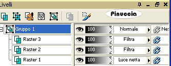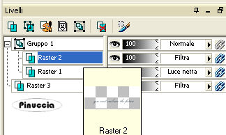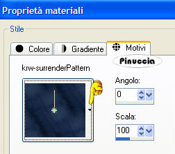 qui puoi trovare qualche risposta ai tuoi dubbi. Se l'argomento che ti interessa non è presente, ti prego di segnalarmelo. Questo tutorial è stato creato con PSP, ma può essere eseguito anche con le altre versioni di PSP. Occorrente: Materiale qui Apri il motivo Krw-surrenderPattern e minimizzalo nella tua area di lavoro. Lo troverai nella lista dei motivi disponibili quando ti servirà. Filtro: Filter Factory Gallery G - Exaggerate qui i filtri Factory Gallery per essere usati devono essere prima convertiti. Come fare vedi qui Si usano importati nel Filtro Unlimited 2.0, ma funzionano anche da soli. Come importare i filtri in Unlimited vedi qui 1. Apri una nuova immagine trasparente 640 x 480 pixels. 2. Imposta il colore di primo piano su Motivi. Apri il menu cliccando sulla freccia a fianco del box e seleziona il motivo krw-surrender Pattern, con i seguenti settaggi: ![]() 3. Imposta il colore di sfondo con #233448. 4. Riempi l'immagine trasparente con il colore di sfondo.ricorda che per riempire con il colore di sfondo devi cliccare con il tasto destro del mouse 5. Apri il tube "krw-architecture24 mist" e vai a Modifica>Copia. 6. Torna al tuo lavoro e vai a Modifica>Incolla>Incolla come nuovo livello. 7. Immagine>Rifletti. 8. Sposta il tube contro il bordo a sinistra, come nel mio esempio.9. Livelli>Duplica. 10. Nella paletta dei livelli attiva il livello originale (raster 2). 11. Effetti>Plugins>Filter Factory G - Exaggerate, con i settaggi standard. ![]() se usi il filtro in Unlimited, per essere certo di impostare i settaggi standard, clicca sul tasto reset). 12. Cambia la modalità di miscelatura di questo livello in Luce diffusa. 13. Attiva il livello Copia di Raster 2 e cambia la modalità di miscelatura in Luce diffusa. ![]() 14. Apri il tube "krw-female243 mist" e vai a Modifica>Copia. 15. Torna al tuo lavoro e vai a Modifica>Incolla>Incolla come nuovo livello. 16. Posiziona il tube nell'angolo in alto a destra.17. Cambia la modalità di miscelatura di questo livello in Luminanza (esistente), e abbassa l'opacità al 70%. 18. Apri il tube "krw-male38" e vai a Modifica>Copia. 19. Torna al tuo lavoro e vai a Modifica>Incolla>Incolla come nuovo livello. 20. Spostalo a sinistra, contro il bordo, come nel mio esempio.21. Apri il tube "krw-surrenderText" e vai a Modifica>Copia. 22. Livelli>Nuovo gruppo di livelli. ![]() 23. Nella paletta dei livelli trascina i livelli Raster 2 e Raster 3 sopra il livello Raster 1, per includerli nel gruppo. ![]() ![]() 24. Attiva il livello Gruppo 1. ![]() 25. Modifica>Copia. Torna al tuo lavoro e vai a Modifica>Incolla>Incolla come nuovo livello. 26. Sposta il testo nell'angolo in basso a destra.27. Attiva il livello Gruppo 1. 28. Livelli>Separa i livelli. ![]() 29. Se necessario, con lo strumento Spostamento sistema il testo.30. Livelli>Unisci>Unisci tutto (appiattisci). 31. Immagine>Aggiungi bordatura, 2 pixels, simmetriche, con il colore nero. 32. Immagine>Aggiungi bordatura, 2 pixels, simmetriche, con il colore di sfondo. 33. Immagine>Aggiungi bordatura, 2 pixels, simmetriche, con il colore nero. 34. Immagine>Aggiungi bordatura, 25 pixels, simmetriche, con il colore bianco. 35. Seleziona il bordo bianco con la bacchetta magica ![]() ![]() 36. Riempi la selezione con il Motivo impostato come colore di primo piano.37. Effetti>Effetti 3D>Ritaglio, con i seguenti settaggi, colore nero. ![]() 38. Selezione>Nessuna selezione. 39. Immagine>Aggiungi bordatura, 2 pixels, simmetriche, con il colore nero. 40. Aggiungi il tuo nome e/o il tuo watermark. Livelli>Unisci>Unisci tutto (appiattisci) e salva in formato jpg. ![]() Se hai problemi o dubbi, o trovi un link non funzionante, o anche soltanto per un saluto, scrivimi. 29 Agosto 2007 |