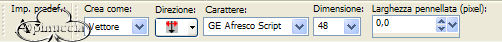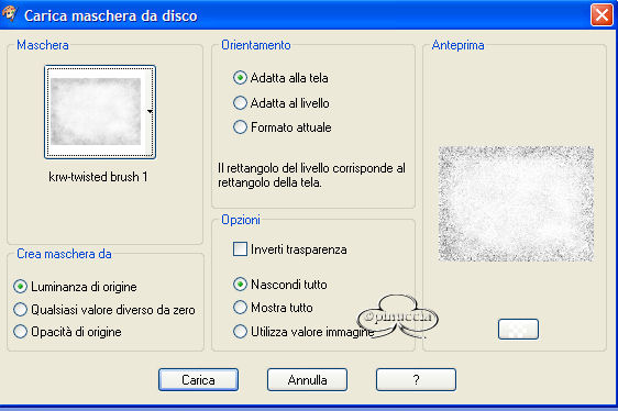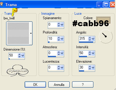 qui puoi trovare qualche risposta ai tuoi dubbi. Se l'argomento che ti interessa non è presente, ti prego di segnalarmelo. Questo tutorial è stato scritto in PSP 9. Occorrente: Materiale qui Filtro FM Tile Tools qui Metti la maschera nella cartella Maschere. Apri il font e minimizzalo nella tua area di lavoro. 1. Imposta il colore di primo piano su #cabb96. 2. Imposta il colore di sfondo su #aa8513. 3. Apri una nuova immagine trasparente 640x480. 4. Riempila con il colore di sfondo.5. Livelli>Nuovo livello raster. 6. Riempi il nuovo livello con il colore di primo piano.7. Livelli>Carica/Salva maschera>Carica maschera da disco. Cerca e carica la maschera: krw-twistedbrush1 mask. ![]() 8. Livelli>Unisci>Unisci gruppo. 9. Effetti>Plugins>FM Tile tools/Blend emboss: settaggi standard. ![]() 10. Selezione>Seleziona tutto. 11. Livelli>Nuovo livello raster. 12. Apri il mist krw-time e vai a Modifica>Copia. 13. Torna al tuo lavoro e vai a Modifica>Incolla>Incolla nella selezione. 14. Nella paletta dei livelli cambia la modalità di miscelatura in Luminanza (esistente) e abbassa l'opacità al 25%. 15. Selezione>Nessuna selezione. 16. Livelli>Unisci>Unisci visibile. 17. Apri il tube krw-female42 e vai a Modifica>copia. 18. Torna al tuo lavoro e vai a Modifica>Incolla>Incolla come nuovo livello. 19. Spostalo contro il lato sinistro dell'immagine.20. Nella paletta dei livelli cambia la modalità di miscelatura in Luminanza (esistente). 21. Effetti>Effetti 3D>Sfalsa ombra, con i seguenti settaggi, colore nero: ![]() 22. Apri il tube krw-male6 e vai a Modifica>Copia. 23. Torna al tuo lavoro e vai a Modifica>Incolla>Incolla come nuovo livello. 24. Immagine>Ridimensiona, del 75%, tutti i livelli non selezionato. ![]() 25. Posizionalo in basso nell'angolo a destra.26. Nella paletta dei livelli cambia la modalità di miscelatura in Luminanza (esistente) e abbassa l'opacità al 20%. 27. Livelli>Unisci>Unisci tutto (appiattisci). 28. Immagine>Aggiungi bordatura, 2 pixels, simmetriche, con il colore di sfondo. 29. Immagine>Aggiungi bordatura, 10 pixels, simmetriche, con il colore di primo piano. 30. Immagine>Aggiungi bordatura, 2 pixels, simmetriche, con il colore di sfondo. . 31. Seleziona il bordo da 10 pixels con la bacchetta magica .32. Effetti>Effetti di trama>Trama: seleziona la trama bw_twill, con i seguenti settaggi, colore #cabb96 ![]() 33. Selezione>Nessuna selezione. 34. Cambia il colore di sfondo con #a2936f. 35. Attiva lo strumento Testo , crea come vettore, font GE Afresco Script, dimensione 48,
