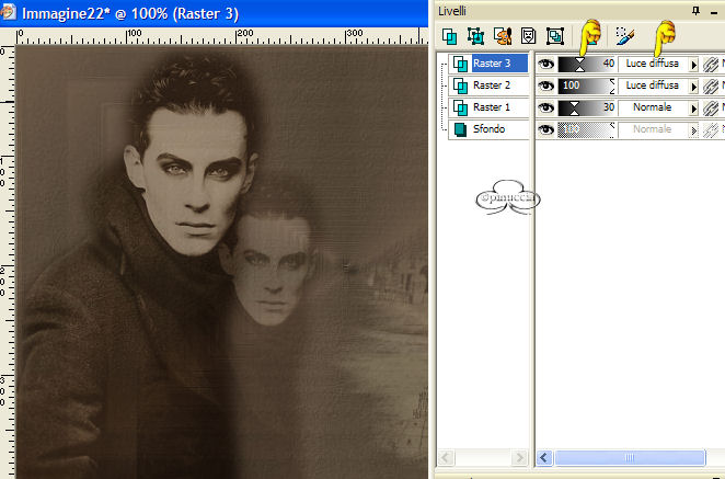 qui puoi trovare qualche risposta ai tuoi dubbi. Se l'argomento che ti interessa non è presente, ti prego di segnalarmelo. Questo tutorial è stato creato con PSP 9. Materiale: qui 1. Apri il file krw-brownBKG. 2. Imposta il colore di primo piano con #735f49 e il colore di sfondo con il nero (#000000). 3. Apri il mist krw-watch e vai a Modifica>Copia. 4. Torna al tuo lavoro e vai a Modifica>Incolla>Incolla come nuovo livello. 5. Spostalo nell'angolo in basso a destra.6. Nella paletta dei livelli abbassa l'opacità al 30%. ![]() 7. Apri il mist krw-watcher e vai a Modifica>copia. 8. Torna al tuo lavoro e vai a Modifica>Incolla>Incolla come nuovo livello. 9. Spostalo nell'angolo in basso a sinistra.10. Nella paletta dei livelli cambia la modalità di miscelatura in Luce diffusa. 11. Apri il mist krw-watcher2 e vai a Modifica>Copia. 12. Torna al tuo lavoro e vai a Modifica>Incolla>Incolla come nuovo livello. 13. Nella paletta dei livelli cambia la modalità di miscelatura in Luce diffusa e abbassa l'opacità al 40%. 14. Spostalo a destra del primo krw-watcher.![]() 15. Livelli>Disponi>sposta giù. 16. Apri il testo krw-watcher e vai a Modifica>Copia. 17. Torna al tuo lavoro e vai a Modifica>Incolla>incolla come nuovo livello. 18. Posizionalo come nel mio esempio.19. Aggiungi la tua firma. Livelli>Unisci>Unisci tutto (appiattisci). 20. Immagine>Aggiungi bordatura, 2 pixels, simmetriche, con il colore di background. Immagine>Aggiungi bordatura, 2 pixels, simmetriche, con il colore di primo piano. 21. Ripeti e salva in formato jpg.