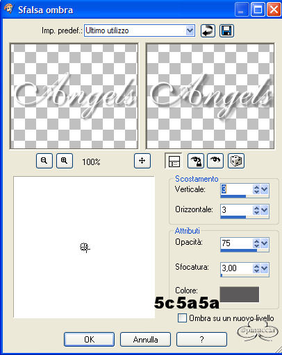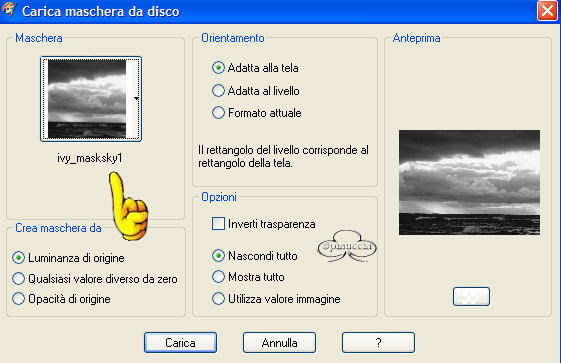 qui puoi trovare qualche risposta ai tuoi dubbi. Se l'argomento che ti interessa non è presente, ti prego di segnalarmelo. Questo tutorial è stato scritto con PSP 9 e Dream lo ha dedicato a Jo. Occorrente: Filtro Flaming Pear Flood qui Tube di un Angelo e di un uomo. Materiale qui 1. Imposta il colore di primo piano con #b5f5f5 e il colore di sfondo con il bianco (#ffffff). 2. Apri una nuova immagine trasparente 640 x 480 pixels. 3. Riempi l'immagine con il colore di sfondo.4. Livelli>Nuovo livello raster. 5. Riempi il livello con il colore di primo piano.6. Livelli>Carica/Salva maschera>Carica maschera da disco. Seleziona e carica la maschera ivi_masksky1. ![]() 7. Livelli>Unisci>Unisci tutto appiattisci. 8. Apri il tube dell'uomo e vai a Modifica>Copia. 9. Torna al tuo lavoro e vai a Modifica>Incolla>Incolla come nuovo livello. 10. Posizionalo nell'angolo in basso a destra.11. Nella paletta dei livelli cambia la modalità di miscelatura in Luminanza (esistente) e abbassa l'opacità al 50%. 12. Apri il tube krw-cloud formation e vai a Modifica>Copia. 13. Torna al tuo lavoro e vai a Modifica>Incolla>Incolla come nuovo livello. 14. Posizionalo tra le nuvole di sfondo in alto ee l'"acqua" (vedi come esempio la mia tag finale). 15. Apri il tube dell'angelo e vai a Modifica>Copia. 16. Torna al tuo lavoro e vai a Modifica>Incolla>Incolla come nuovo livello. 17. Posizionalo sulle nuvole.18. Nella paletta dei livelli cambia la modalità di miscelatura in Luminanza (esistente). 19. Nella paletta dei livelli posizionati sul livello di sfondo. 20. Effetti>Plugins>Flaming Pear>Flood e imposta l'orizzonte a 75. 21. Ritorna sul livello superiore. 22. Attiva lo strumento testo e scegli un font.Io ho scelto English111 PrestoBT, con i seguenti settaggi: ![]() 23. Scrivi: When angels dream. 24. Posiziona il testo, come preferisci. 25. Livelli>Converti in livello raster. 26. Effetti>Effetti 3D>Sfalsa ombra, con i seguenti settaggi, colore 5c5a5a. ![]() 27. Aggiungi la tua firma. Livelli>Unisci>Unisci tutto (appiattisci). 28. Immagine>Aggiungi bordatura, 1 pixel, simmetriche, con il colore di primo piano. 29. Immagine>Aggiungi bordatura, 1 pixel, simmetriche, con il colore bianco. 30. Ripeti i passi 28 e 29 ancora tre volte. 31. Selezione>Seleziona tutto. Selezione>Modifica>Contrai di 8 pixels. 32. Effetti>Effetti 3D>Sfalsa ombra, con i settaggi precedenti, ma con il colore nero. 33. Ripeti l'Effetto Sfalsa ombra, ma cambiando verticale e orizzonale in -3. 34. Selezione>Nessuna selezione. Salva in formato jpg. Un altro esempio, con un diverso settaggio del filtro Flood. ![]()