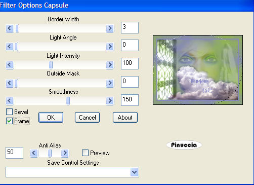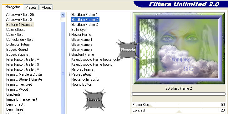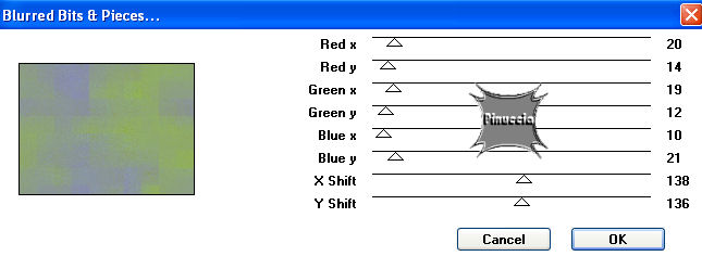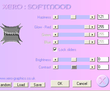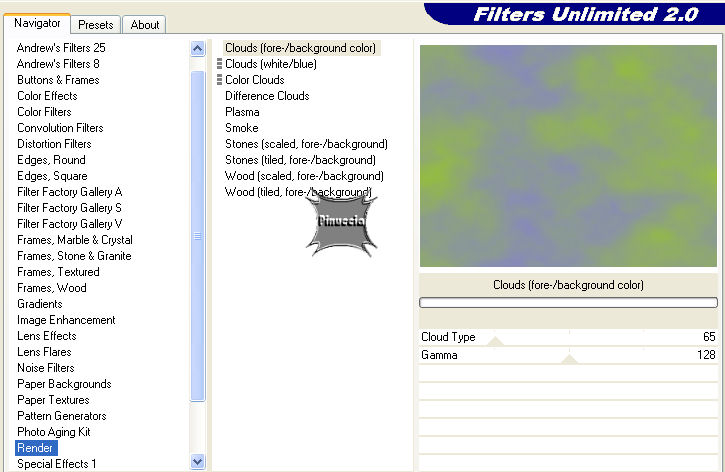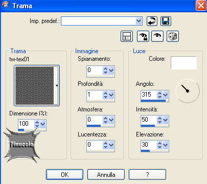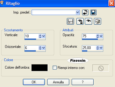 qui puoi trovare qualche risposta ai tuoi dubbi. Se l'argomento che ti interessa non è presente, ti prego di segnalarmelo. Questo tutorial è stato scritto e tradotto con PSP 9. Occorrente: Materiale qui Filtri: Filters Unlimited qui Andrews Filter Collection 56 qui Per essere usati, i filtri Andrews vanno prima convertiti e poi importati nel Filtro Unlimited. Funzionano però anche da soli. come convertire i filtri vedi qui come importarli in Unlimited qui Metti la trama Tw-text01 nella cartella Trame di PSP. Apri il font e minimizzalo nella tua area di lavoro. Lo troverai nella lista dei font disponibili, quando attiverai lo strumento Testo. 1. Imposta il colore di primo piano con #97c52d, e il colore di sfondo con #8686c4. 2. Apri una nuova immagine trasparente 640 x 480 pixels. 3. Riempi l'immagine trasparente con il colore di sfondo.Tasto destro del mouse, per riempire con il colore di sfondo 4. Effetti>Plugins>Filters Unlimited 2 - Render - Cloud /fore-background color). ![]() 5. Effetti>Plugins>Andrews Filter collection 56 - Blurred bits & pieces: ![]() se la tua versione non riconosce il filtro, importarlo in Unlimited 6. Duplica questo sfondo con Shift+D e minimizza la copia, che ti servirà più tardi. Continua sull'originale. 7. Apri il mist krw-female11 e vai a Modifica>Copia. 8. Torna al tuo lavoro e vai a Modifica>Incolla>Incolla come nuovo livello. 9. Cambia la modalità di miscelatura di questo livello in Luce diffusa. 10. Apri il mist krw-clouds4 e vai a Modifica>Copia. 11. Torna al tuo lavoro e vai a Modifica>Incolla>Incolla come nuovo livello. 12. Spostalo nell'angolo in basso a destra.13. Apri il mist krw-window2 e vai a Modifica>Copia. 14. Torna al tuo lavoro e vai a Modifica>Incolla>Incolla come nuovo livello. 15. Spostalo contro il bordo sinistro del tuo lavoro.16. Cambia la modalità di miscelatura di questo livello in Luminanza (esistente). 17. Effetti>Plugins>Xero - Soft mood: 121,255. ![]() 18. Attiva lo strumento Selezione , sfumatura 20.19. Traccia un rettangolo, seguendo la linea del muro sulla destra della finestra. Vedi nella prima schermata la selezione e nella seconda schermata la selezione che, dopo aver cliccato con il tasto sinistro del mouse per chiuderla, si allargherà per effetto della sfumatura di 20 pixels. ![]() 20. Premi sulla tastiera il tasto CANC tre volte.21. Selezione>Nessuna selezione. 22. Apri il tube krw-windowstext e vai a Modifica>Copia. 23. Torna al tuo lavoro e vai a Modifica>Incolla>Incolla come nuovo livello. 24. Attiva lo strumento Gomma , rotondo, dimensione 10, durezza 42.25. Cancella alcune aree del testo per dare l'idea che siano immerse nella neve (vedi la tag finale). Non devi cancellare aree troppo uniformi. Usa le linee dei cumuli delle nuvole come guida 26. Effetti>Effetti 3D>Sfalsa ombra, con i seguenti settaggi, colore bianco. ![]() 27. Apri il mist krw-female112 e vai a Modifica>Copia. 28. Torna al tuo lavoro e vai a Modifica>Incolla>Incolla come nuovo livello. 29. Cambia la modalità di miscelatura di questo livello in Luminanza (esistente), e abbassa l'opacità al 50%. 30. Sposta l'immagine sulla destra.31. Livelli>Unisci>Unisci tutto (appiattisci). 32. Immagine>Aggiungi bordatura, 7 pixels, simmetriche, con il colore di sfondo. 33. Immagine>Aggiungi bordatura, 25 pixels, simmetriche, con il colore bianco. 34. Seleziona il bordo bianco con la bacchetta magica ![]() ricordati di riportare la sfumatura a 0 35. Attiva l'immagine di sfondo che hai messa da parte prima e vai a Modifica>Copia. 36. Torna al tuo lavoro e vai a Modifica>Incolla>Incolla nella selezione. Mantieni selezionato. 37. Effetti>Effetti di trama>Trama, cerca e seleziona la trama tw-tex01, con i seguenti settaggi: ![]() 38. Effetti>Plugins>Bordermania>Capsule: ![]() 39. Effetti>Plugins>Filters Unlimited 2 - Buttons & Frames - 3D Glass frame 2, con i settaggi standard. ![]() 40. Selezione>Inverti. 41. Effetti>Effetti 3D>Ritaglio, con i seguenti settaggi, colore nero. ![]() 42. Selezione>Nessuna selezione. 43. Aggiungi la tua firma e salva in formato jpg. ![]() Se hai problemi o dubbi, o trovi un link non funzionante, o anche soltanto per un saluto, scrivimi. 7 Aprile 2007 |