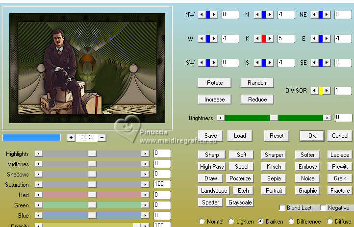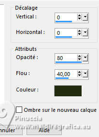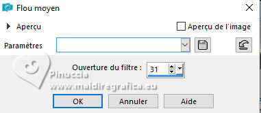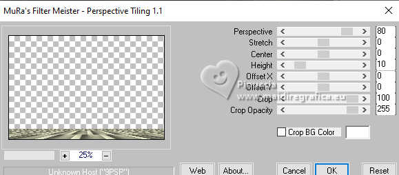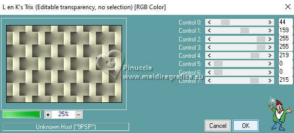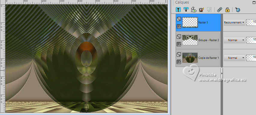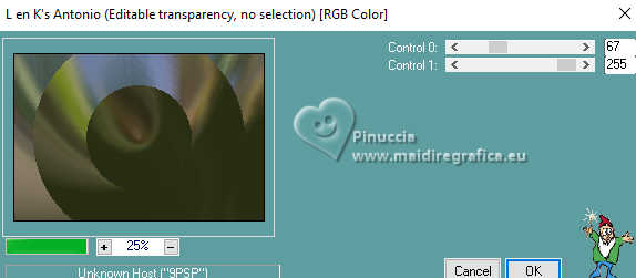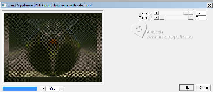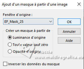 Pour traduire ce tutoriel, créé avec PSP2020, j'ai utilisé PSPX7, mais il peut également être exécuté avec les autres versions. Suivant la version utilisée, vous pouvez obtenir des résultats différents. Depuis la version X4, la fonction Image>Miroir a été remplacée par Image>Renverser horizontalement, et Image>Renverser avec Image>Renverser verticalement . Dans les versions X5 et X6, les fonctions ont été améliorées par la mise à disposition du menu Objets. Avec la nouvelle version X7, nous avons encore Image>Miroir et Image>Renverser/Retourner, mais avec nouvelles différences. Voir les détails à ce sujet ici Certaines dénominations ont changées entre les versions de PSP. Les plus frequentes dénominations utilisées: ![]() traduction italienne ici Vos versions iciNécessaire pour réaliser ce tutoriel: Un tube à choix Le reste du matériel: ![]() Merci pour le tube du paysage Annytubes et pour le masque Estela Fonseca. Pour le tube non fourni merci Franie Margot (ici les liens vers les sites des créateurs de tubes) ![]() consulter, si nécessaire, ma section des filtres ici Filters Unlimited 2.0 ici L&K's - L&K's Trix ici L&K's - L&K's Palmyre ici L&K's - L&K's Antonio ici Mura's Meister - Perspective Tiling ici AAA Filters - Custom ici ![]() en fonction des couleurs utilisées, vous pouvez changer le mode mélange et l'opacité des calques. Dans les plus récentes versions de PSP, vous ne trouvez pas le dégradé d'avant plan/arrière plan ou Corel_06_029. Vous pouvez utiliser le dégradé des versions antérieures. Ici le dossier Dégradés de CorelX. ![]() Placer le preset dans le dossier Paramètres par défaut. Ouvrir le masque dans PSP et le minimiser avec le reste du matériel. 1. Ouvrir une nouvelle image transparente 900 x 600 pixels. Placer en avant plan la couleur #242b10, et en arrière plan la couleur #a79380. ![]() Préparer en avant plan un dégradé de premier plan/arrière plan, style Linéaire. ![]() Remplir l'image transparente du dégradé.2. Sélections>Sélectionner tout. Ouvrir le misted Annytubes_paisajes 1222_30_11_20116 ![]() Édition>Copier. Revenir sur votre travail et Édition>Coller dans la sélection. Sélections>Désélectionner tout. 3. Réglage>Flou>Moyen. ![]() 4. Calques>Dupliquer. 5. Effets>Modules Externes>L&K's - L&K's Antonio, par défaut. ![]() 6. Effets>Effets de réflexion>Miroir rotatif. ![]() 7. Effets>Effets géométriques>Cercle. ![]() 8. Effets>Effets de bords>Accentuer. 9. Calques>Nouveau calque raster. Placer en avant plan la Couleur. Remplir le calque avec la couleur foncée d'avant plan #242b10.10. Calques>Nouveau calque de masque>A partir d'une image. Ouvrir le menu deroulant sous la fenêtre d'origine et vous verrez la liste des images ouvertes. Sélectionner le masque EF_Mask_25 ![]() Calques>Fusionner>Fusionner le groupe. 11. Effets>Effets de bords>Accentuer davantage. 12. Effets>Effets 3D>Ombre portée, couleur noire #000000. ![]() 13. Vous positionner sur le calque Raster 1. Effets>Modules Externes>L&K's - L&K's Trix, par défaut ![]() 14. Effets>Modules Externes>Mura's Meister - Perspective Tiling. ![]() 15. Calques>Agencer>Placer en haut de la pile. 16. Réglage>Netteté>Netteté. 17. Effets>Effets 3D>Ombre portée, couleur foncée d'avant plan #242b10. ![]() 18. Placer le calque en mode Recouvrement. ![]() 19. Image>Ajouter des bordures, 2 pixels, symétrique, couleur foncée. 20. Sélections>Sélectionner tout. Image>Ajouter des bordures, 50 pixels, symétrique, couleur #ffffff. Sélections>Inverser. 21. Placer en avant plan le dégradé. Remplir la sélection du dégradé.22. Effets>Modules Externes>L&K's - L&K's Palmyre, par défaut. ![]() 23. Effets>Filtre personnalisé - Sélectionner le preset Emboss 3 et ok. ![]() 24. Sélections>Inverser. Effets>Effets 3D>Ombre portée, couleur noire. ![]() Sélections>Désélectionner tout. 25. Ouvrir le déco deco_edith ![]() Édition>Copier. Revenir sur votre travail et Édition>Coller comme nouveau calque. Coloriser si nécessaire. 26. Ouvrir le tube principal et Édition>Copier. Revenir sur votre travail et Édition>Coller comme nouveau calque. Déplacer le tube à gauche, ou à votre goût.Effets>Effets 3D>Ombre portée, à choix. Réglage>Netteté>Netteté. 27. Image>Ajouter des bordures, 3 pixels, symétrique, couleur foncée #242b10. 28. Calques>Fusionner>Tous. Image>Redimensionner, 950 pixels de largeur, redimensionner tous les calques coché. 29. Effets>Modules Externes>AAA Filters - Custom - preset Laplace. ![]() 30. Signer votre travail et enregistrer en jpg. Pour les tubes de cette version merci Beatriz et Franie Margot ![]() ![]() Si vous avez des problèmes, ou des doutes, ou vous trouvez un link modifié, ou antonioment pour me dire que ce tutoriel vous a plu, vous pouvez m'écrire. |