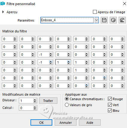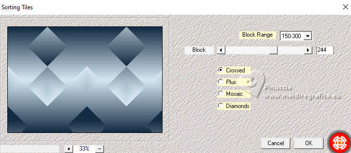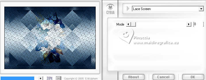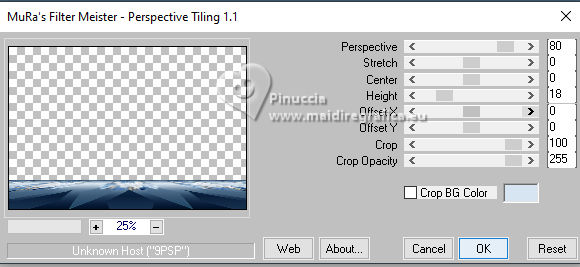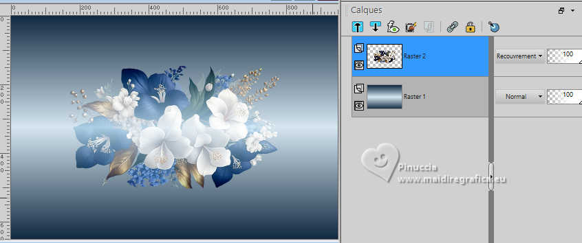 Pour traduire ce tutoriel, créé avec PSP2020, j'ai utilisé PSPX7, mais il peut également être exécuté avec les autres versions. Suivant la version utilisée, vous pouvez obtenir des résultats différents. Depuis la version X4, la fonction Image>Miroir a été remplacée par Image>Renverser horizontalement, et Image>Renverser avec Image>Renverser verticalement . Dans les versions X5 et X6, les fonctions ont été améliorées par la mise à disposition du menu Objets. Avec la nouvelle version X7, nous avons encore Image>Miroir et Image>Renverser/Retourner, mais avec nouvelles différences. Voir les détails à ce sujet ici Certaines dénominations ont changées entre les versions de PSP. Les plus frequentes dénominations utilisées: ![]() traduction italienne ici Vos versions iciNécessaire pour réaliser ce tutoriel: ![]() (ici les liens vers les sites des créateurs de tubes) ![]() en fonction des couleurs utilisées, vous pouvez changer le mode mélange et l'opacité des calques. Dans les plus récentes versions de PSP, vous ne trouvez pas le dégradé d'avant plan/arrière plan ou Corel_06_029. Vous pouvez utiliser le dégradés des versions antérieures. Ici le dossier Dégradés de CorelX. ![]() 1. Ouvrir une nouvelle image transparente 950 x 650 pixels. et en arrière plan la couleur #d5e6f0. ![]() Préparer en avant plan un dégradé de premier plan/arrière plan, style Linéaire. ![]() Remplir l'image transparente du dégradé.2. Effets>Modules Externes>Mehdi - Sorting Tiles. ![]() 3. Calques>Dupliquer. Image>Miroir>Miroir vertical (Image>Renverser). Placer le calque en mode Lumière douce. 4. Calques>Fusionner>Fusionner le calque de dessous. Effets>Effets de bords>Accentuer davantage. 5. Ouvrir le tube floral288_ESpigai ![]() Édition>Copier. Revenir sur votre travail et Édition>Coller comme nouveau calque. Image>Rotation libre - 90 degrés à droite. ![]() Placer le calque en mode Recouvrement. ![]() 6. Calques>Fusionner>Fusionner le calque de dessous. 7. Calques>Dupliquer. Effets>Modules Externes>Mura's Meister - Perspective Tiling. ![]() Réglage>Netteté>Netteté. 8. Activer l'outil Baguette Magique ; progressivité 15.![]() Presser 7 fois CANC sur le clavier ![]() Sélections>Désélectionner tout. 9. Édition>Copie Spéciale>Copier avec fusion. 10. Vous positionner sur le calque Raster 1. Image>Redimensionner, à 90%, redimensionner tous les calques décoché. 11. Sélectionner la partie transparente avec la baguette magique , progressivité 0,![]() Édition>Coller dans la sélection 12. Réglage>Flou>Flou gaussien - rayon 15. ![]() 13. Effets>Modules Externes>Screenwark - Lace Screen. ![]() si vous utilisez la version sans fenêtre de ce filtre: Effets>Modules Externes>Screenworks - Lace Screen. ![]() 14. Effets>Filtre personnalisé - sélectionner le preset Emboss 4. ![]() Réglage>Netteté>Netteté. 15. Sélections>Inverser. Effets>Effets 3D>Ombre portée, couleur foncée #122a42 ![]() Édition>Répéter Ombre portée. Sélections>Désélectionner tout. 16. Vous positionner sur le calque du haut de la pile. Ouvrir le tube Deco_edith ![]() Édition>Copier. Revenir sur votre travail et Édition>Coller comme nouveau calque. 17. Outil Sélecteur ![]() Position horiz.: 54,00 - Position vert.: 70,00. ![]() 18. Ouvrir le tube principal Woman_ESpigai ![]() Édition>Copier. Revenir sur votre travail et Édition>Coller comme nouveau calque. Image>Miroir>Miroir horizontal. Déplacer le tube à gauche, ou à votre goût.Effets>Effets 3D>Ombre portée, à choix. 19. Ouvrir Texto_Blue ![]() Édition>Copier. Revenir sur votre travail et Édition>Coller comme nouveau calque. Position horiz.: 761,00 - Position vert.: 103,00. ![]() 20. Image>Ajouter des bordures, 2 pixels, symétrique, couleur foncée #122a42. Image>Ajouter des bordures, 2 pixels, symétrique. couleur claire #d5e6f0. Image>Ajouter des bordures, 2 pixels, symétrique, couleur foncée #122a42. 21. Signer votre travail et enregistrer en jpg. Pour les tubes de ces versions merci Edith Spigai ![]() ![]() ![]() Si vous avez des problèmes, ou des doutes, ou vous trouvez un link modifié, ou bluement pour me dire que ce tutoriel vous a plu, vous pouvez m'écrire. |