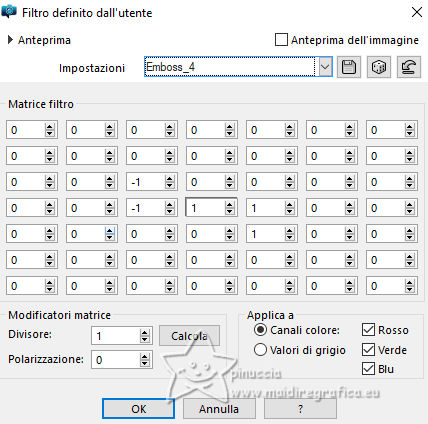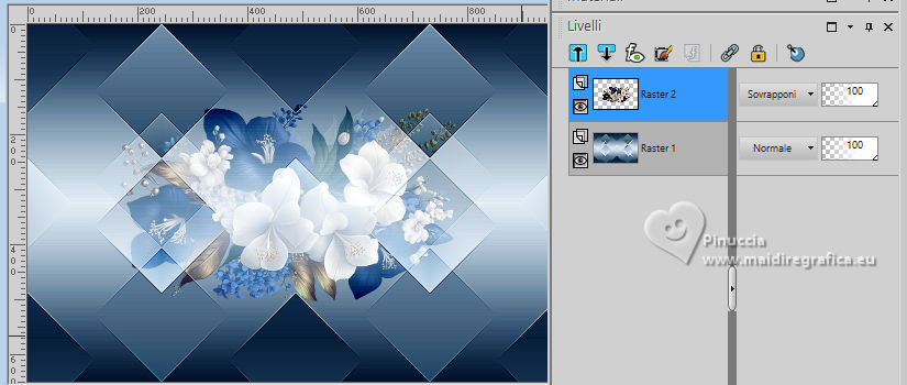 qui puoi trovare qualche risposta ai tuoi dubbi. Se l'argomento che ti interessa non è presente, ti prego di segnalarmelo. Questo tutorial è stato creato e tradotto con PSP2020, ma può essere eseguito anche con le altre versioni di PSP. Dalla versione X4, il comando Immagine>Rifletti è stato sostituito con Immagine>Capovolgi in orizzontale, e il comando Immagine>Capovolgi con Immagine>Capovolgi in verticale. Nelle versioni X5 e X6, le funzioni sono state migliorate rendendo disponibile il menu Oggetti. Con la nuova versione X7, sono tornati Rifletti>Capovolgi, ma con nuove varianti. Vedi la scheda sull'argomento qui traduzione in francese/traduction en français qui/ici Versioni/Versions quiOccorrente: Materiale ![]() (in questa pagina trovi i links ai siti dei creatori di tubes) ![]() non esitare a cambiare modalità di miscelatura e opacità secondo i colori utilizzati. Nelle ultime versioni di PSP non c'è il gradiente di primo piano/sfondo (Corel_06_029) Puoi usare i gradienti delle versioni precedenti. Trovi qui i gradienti Corel X. ![]() 1. Apri una nuova immagine trasparente 950 x 650 pixels. Imposta il colore di primo piano con #122a42, e il colore di sfondo con #d5e6f0. ![]() Passa il colore di primo piano a Gradiente di primo piano/sfondo, stile Lineare. ![]() Riempi l'immagine trasparente con il gradiente.2. Effetti>Plugins>Mehdi - Sorting Tiles. ![]() 3. Livelli>Duplica. Immagine>Rifletti>Rifletti verticalmente (Immagine>Capovolgi). Cambia la modalità di miscelatura di questo livello in Luce Diffusa. 4. Livelli>Unisci>Unisci giù. Effetti>Effetti di bordo>Aumenta di più. 5. Apri il tube floral288_ESpigai ![]() Modifica>Copia. Torna al tuo lavoro e vai a Modifica>Incolla come nuovo livello. Immagine>Ruota per gradi - 90 gradi a destra ![]() Cambia la modalità di miscelatura di questo livello in Sovrapponi. ![]() 6. Livelli>Unisci>Unisci giù. 7. Livelli>Duplica. Effetti>Plugins>Mura's Meister - Perspective Tiling. ![]() Regola>Messa a fuoco>Metti a fuoco. 8. Attiva lo strumento Bacchetta magica ; sfumatura 15.![]() Premi 7 volte sulla tastiera il tasto CANC ![]() Selezione>Deseleziona. 9. Modifica>Copia Speciale>Copia Uniti. 10. Attiva il livello Raster 1. Immagine>Ridimensiona, al 90%, tutti i livelli non selezionato. 11. Seleziona la parte trasparente con la bacchetta magica , sfumatura 0![]() Modifica>Incolla nella selezione 12. Regola>Sfocatura>Sfocatura gaussiana - raggio 15. ![]() 13. Effetti>Plugins>Screenwark - Lace Screen. ![]() se stai usando la versione senza finestra di questo filtro: Effetti>Plugins>Screenworks - Lace Screen. ![]() 14. Effetti>Filtro definito dall'utente - seleziona il preset Emboss 4. ![]() Regola>Messa a fuoco>Metti a fuoco. 15. Selezione>Inverti. Effetti>Effetti 3D>Sfalsa ombra, colore scuro #122a42 ![]() Modifica>Ripeti Sfalsa ombra. Selezione>Deseleziona. 16. Attiva il livello superiore. Apri il tube Deco_edith ![]() Modifica>Copia. Torna al tuo lavoro e vai a Modifica>Incolla come nuovo livello. 17. Strumento Puntatore ![]() Posizione X: 54,00 - Posizione Y: 70,00. ![]() 18. Apri il tube principale Woman_ESpigai ![]() Modifica>Copia. Torna al tuo lavoro e vai a Modifica>Incolla come nuovo livello. Immagine>Rifletti>Rifletti orizzontalmente. Sposta il tube a sinistra, o dove preferisci.Effetti>Effetti 3D>Sfalsa ombra, a scelta. 19. Apri Texto_Blue ![]() Modifica>Copia. Torna al tuo lavoro e vai a Modifica>Incolla come nuovo livello. Puntatore X: 761,00 - Posizione Y: 103,00. ![]() 20. Immagine>Aggiungi bordatura, 2 pixels, simmetriche, colore scuro #122a42. Immagine>Aggiungi bordatura, 2 pixels, simmetriche, colore chiaro #d5e6f0. Immagine>Aggiungi bordatura, 2 pixels, simmetriche, colore scuro #122a42. 21. Firma il tuo lavoro e salva in formato jpg. Per i tubes di questi esempi grazie Edith ![]() ![]() ![]() Puoi scrivermi se hai problemi o dubbi, o trovi un link che non funziona, o soltanto per un saluto. |