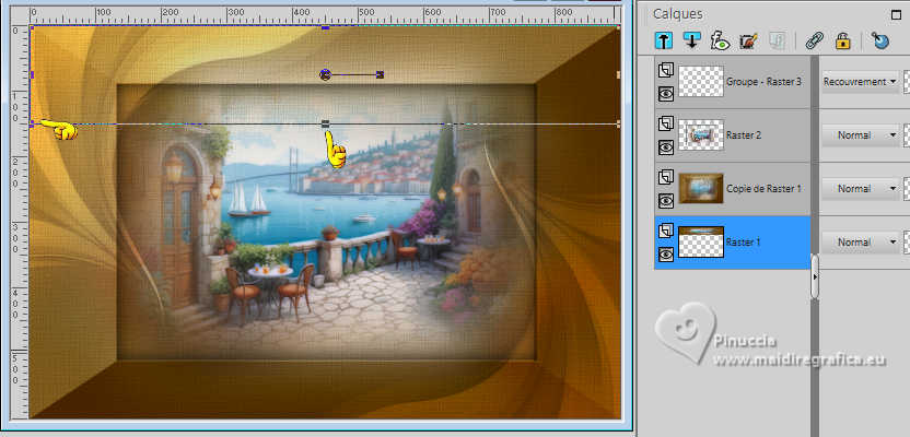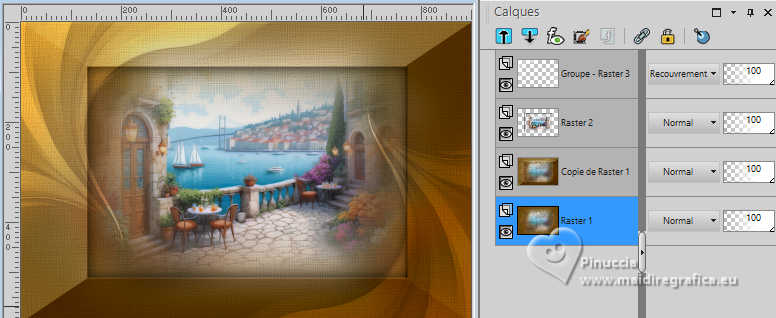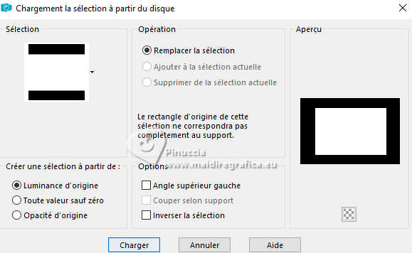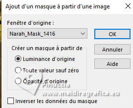 Pour traduire ce tutoriel, créé avec PSP2020, j'ai utilisé PSPX7, mais il peut également être exécuté avec les autres versions. Suivant la version utilisée, vous pouvez obtenir des résultats différents. Depuis la version X4, la fonction Image>Miroir a été remplacée par Image>Renverser horizontalement, et Image>Renverser avec Image>Renverser verticalement . Dans les versions X5 et X6, les fonctions ont été améliorées par la mise à disposition du menu Objets. Avec la nouvelle version X7, nous avons encore Image>Miroir et Image>Renverser/Retourner, mais avec nouvelles différences. Voir les détails à ce sujet ici Certaines dénominations ont changées entre les versions de PSP. Les plus frequentes dénominations utilisées: ![]() traduction italienne ici Vos versions iciNécessaire pour réaliser ce tutoriel: Deux tubes à choix Le reste du matériel: ![]() Pour mes tubes merci Nikita et Kamil (ici les liens vers les sites des créateurs de tubes) ![]() consulter, si nécessaire, ma section des filtres ici Filters Unlimited 2.0 ici Toadies - Sucking Toad Bevel I ici Xero - Porcelain ici Filtres Toadies peuvent être utilisés seuls ou importés dans Unlimited. voir comment le faire ici). Si un filtre est fourni avec cette icône, ![]() en fonction des couleurs utilisées, vous pouvez changer le mode mélange et l'opacité des calques. Dans les plus récentes versions de PSP, vous ne trouvez pas le dégradé d'avant plan/arrière plan ou Corel_06_029. Vous pouvez utiliser le dégradé des versions antérieures. Ici le dossier Dégradés de CorelX. ![]() Placer le preset Emboss 3 dans le dossier Paramètres par défaut. Placer la sélection dans le dossier sélections. Ouvrir le masque dans PSP et le minimiser avec le reste du matériel. 1. Ouvrir une nouvelle image transparente 900 x 600 pixels. Placer en avant plan la couleur #694507, et en arrière plan la couleur #f6c774. ![]() Remplir l'image transparente avec la couleur d'avant plan #694507.2. Sélections>Sélectionner tout. Ouvrir votre misted et Édition>Copier. Revenir sur votre travail et Édition>Coller dans la sélection. Sélections>Désélectionner tout. 3. Réglage>Flou>Flou gaussien - rayon 30. ![]() 4. Effets>Effets de textures>Texture - sélectionner une texture à choix ![]() 5. Effets>Filtre personnalisé - Sélectionner le preset Emboss 3 et ok. ![]() 6. Réglage>Netteté>Netteté. 7. Calques>Dupliquer. Effets>Modules Externes>Toadies - Sucking Toad Bevel I. ![]() 8. Sélections>Charger/Enregistrer une sélection>Charger à partir du disque. Chercher et charger la sélection edith_1 ![]() 9. Calques>Nouveau calque raster. Édition>Coller dans la sélection - votre misted est toujours en mémoire. 10. Effets>Modules Externes>Xero - Porcelain, par défaut. ![]() 11. Sélections>Inverser. Effets>Effets 3D>Ombre portée, couleur noire #000000. ![]() Sélections>Désélectionner tout. 12. Placer en avant plan la couleur #ffffff. Calques>Nouveau calque raster. Remplir le calque avec la couleur #ffffff.13. Calques>Nouveau calque de masque>A partir d'une image. Ouvrir le menu deroulant sous la fenêtre d'origine et vous verrez la liste des images ouvertes. Sélectionner le masque Narah_Mask_1416 . ![]() Calques>Fusionner>Fusionner le groupe. 14. Placer le calque en mode Recouvrement. Réglage>Netteté>Davantage de netteté. 15. Vous positionner sur le calque du bas de la pile, Raster 1. ![]() 16. Activer l'outil Sélecteur ![]() en mode Échelle ![]() Si vous ne visualiser pas les règles: Affichage>Règles tirer le noeud central inférieur vers le haut, jusqu'à 150 pixels. ![]() 17. Effets>Effets de distorsion>Miroir déformant. ![]() 18. Réglage>Traitement rapide des photos. 19. Effets>Effets 3D>Ombre portée, couleur noire #000000. ![]() Sélections>Désélectionner tout. Calques>Agencer>Placer en haut de la pile. ![]() 20. Ouvrir le déco gen_accents_pointyflowers ![]() Choisir une couleur et vous positionner sur le calque de cette couleur. Édition>Copier. Revenir sur votre travail et Édition>Coller comme nouveau calque. Déplacer le tube en haut à droite.21. Ouvrir le texte Texto_1pspimage ![]() Édition>Copier. Revenir sur votre travail et Édition>Coller comme nouveau calque. Déplacer le texte en bas à droite, ou à votre goût.22. Ouvrir le tube principal. Édition>Copier. Revenir sur votre travail et Édition>Coller comme nouveau calque. Image>Redimensionner, si nécessaire, redimensionner tous les calques décoché. Déplacer le tube à gauche.Réglage>Netteté>Netteté. Effets>Effets 3D>Ombre portée, à choix. Si vous voulez, Effets>Modules Externes>Xero - Porcelain, comme précédemment. 23. Placer à nouveau en avant plan la couleur #694507 ![]() Préparer en avant plan un dégradé de premier plan/arrière plan, style Linéaire. ![]() 24. Image>Ajouter des bordures, 2 pixels, symétrique, couleur d'avant plan #694507. Image>Ajouter des bordures, 30 pixels, symétrique, couleur #ffffff. 25. Activer l'outil Baguette magique et cliquer dans le bord blanc pour le sélectionner. Remplir la sélection du dégradé.26. Réglage>Ajouter/Supprimer du bruit>Ajouter du bruit. ![]() 27. Effets>Filtre personnalisé - Sélectionner le preset Emboss 3 et ok. ![]() Réglage>Netteté>Netteté. 28. Sélections>Inverser. Effets>Effets 3D>Ombre portée, couleur noire #000000. ![]() Sélections>Désélectionner tout. 29. Image>Ajouter des bordures, 2 pixels, symétrique, couleur d'arrière plan #f6c774. 30. Image>Redimensionner, 950 pixels de largeur, redimensionner tous les calques coché. Enregistrer en jpg. ![]() Si vous avez des problèmes, ou des doutes, ou vous trouvez un link modifié, ou dancewithmement pour me dire que ce tutoriel vous a plu, vous pouvez m'écrire. |