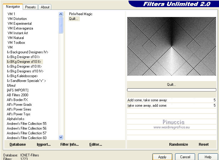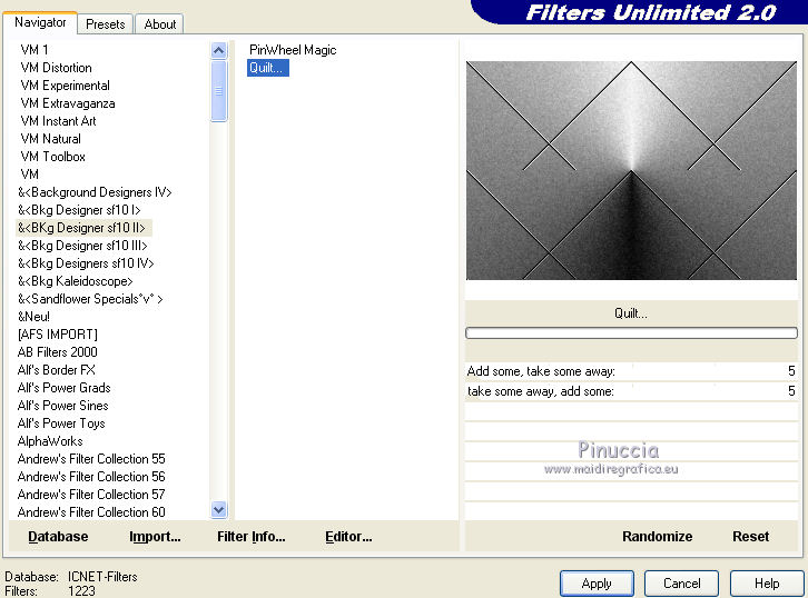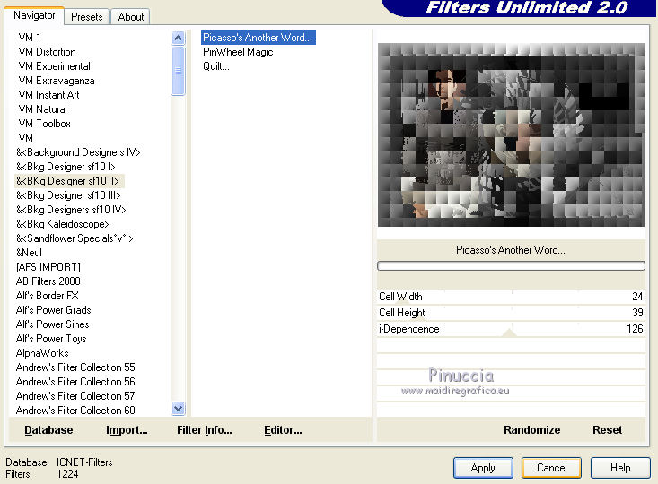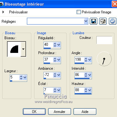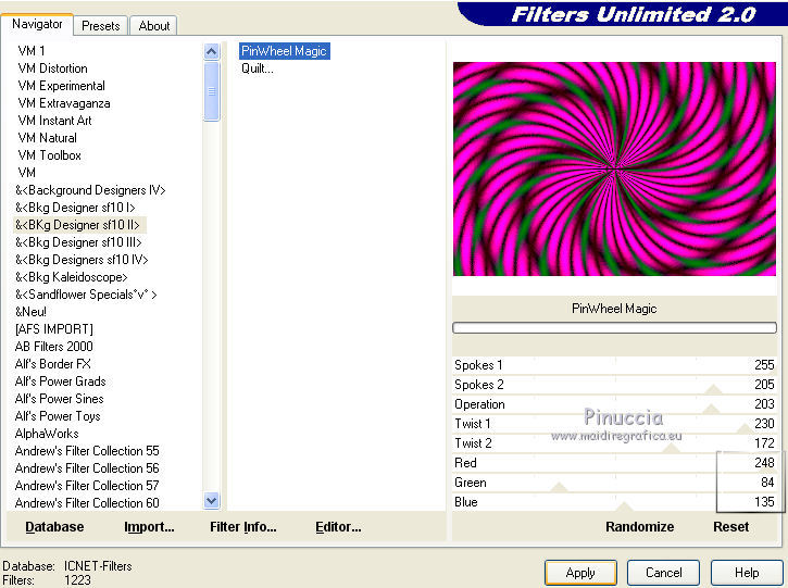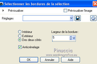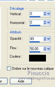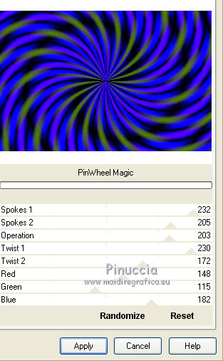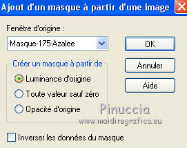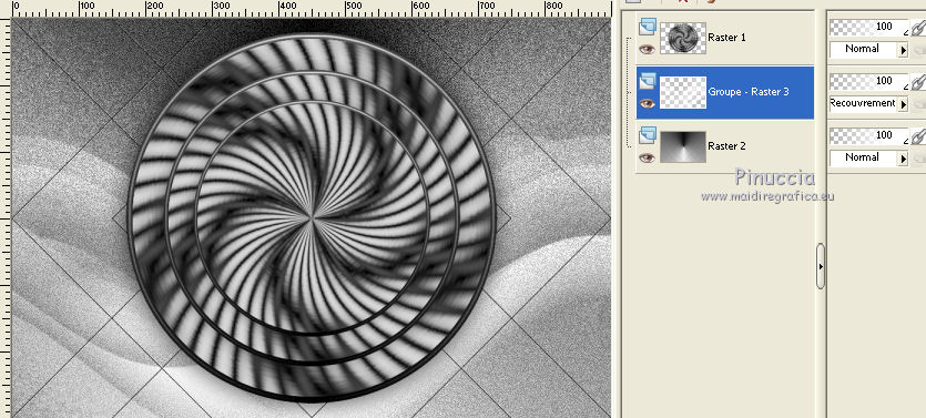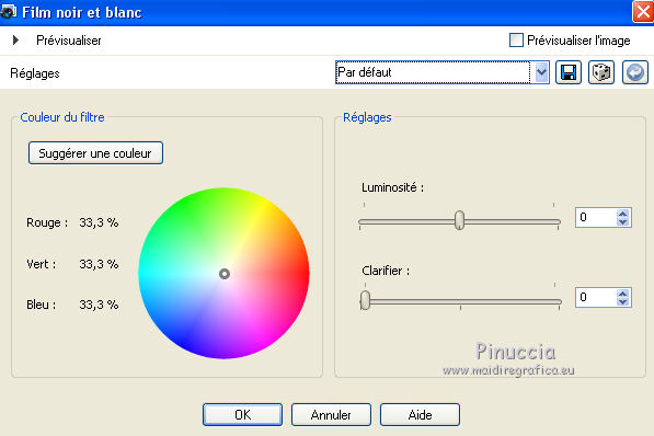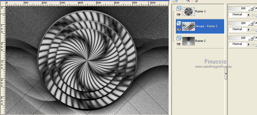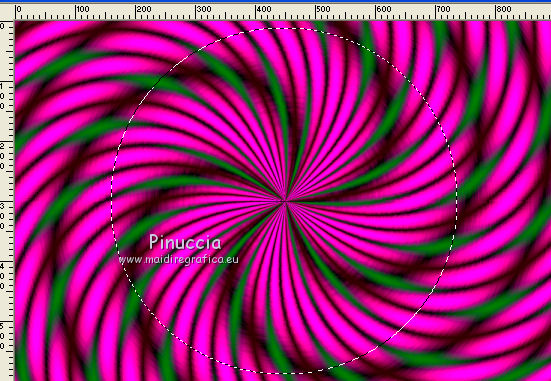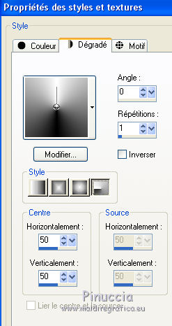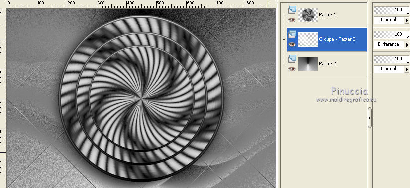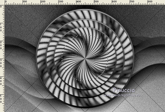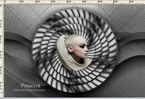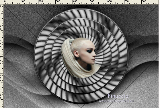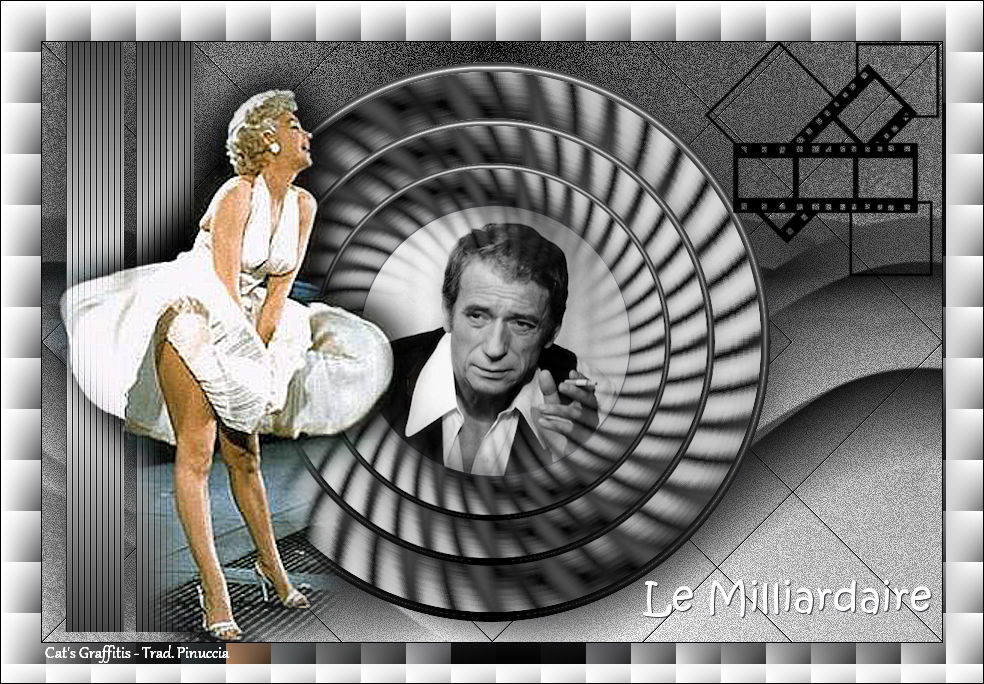Pour traduire ce tutoriel j'ai utilisé CorelX12, mais il peut également être exécuté avec les autres versions. Suivant la version utilisée, vous pouvez obtenir des résultats différents. Depuis la version X4, la fonction Image>Miroir a été remplacée par Image>Renverser horizontalement, et Image>Renverser avec Image>Renverser verticalement . Dans les versions X5 et X6, les fonctions ont été améliorées par la mise à disposition du menu Objets. Avec la nouvelle version X7, nous avons encore Image>Miroir et Image>Renverser/Retourner, mais avec nouvelles différences. Voir les détails à ce sujet ici Certaines dénominations ont changées entre les versions de PSP. Les plus frequentes dénominations utilisées: ![]() Vos versions Nécessaire pour réaliser ce tutoriel: Tubes à choix Le reste du matériel ici Les tubes de ma version sont de Luz Cristina, Mina et Yoka (ici les liens vers les sites des créateurs de tubes) Modules Externes: consulter, si nécessaire, ma section des filtres ici Filters Unlimited 2.0 ici &<Bkg Designer sf10II> - Pinwheel Magic, Quilt- à importer dans Unlimited ici ![]() en fonction des couleurs utilisées, vous pouvez changer le mode mélange et l'opacité des calques. 1. Ouvrir une nouvelle image transparente 900 x 600 pixels. 2. Placer en avant plan une couleur claire, et en arrière plan un couleur foncée. Mes couleurs. ![]() Préparer en avant plan un dégradé de premier plan/arrière plan, style Radial. ![]() Remplir l'image transparente du dégradé.2. Effets>Modules Externes>Filters Unlimited 2.0 - &<Bkg Designer sf10II> - Pinwheel Magic. ![]() vous pouvez jouer avec les réglages red green et blue pour changer les couleurs ![]() 3. Activer l'outil Sélection , cercle![]() et, à partir du centre de l'image, tracer un cercle comme ci-dessous ![]() 4. Sélections>Inverser. Presser CANC sur le clavier ![]() Sélections>Désélectionner tout. 5. Image>Redimensionner, 95%, redimensionner tous les calques décoché. Effets>Effets 3D>Ombre portée. ![]() 6. (Optionnel) Effets>Effets Phots>Film noir et blanc, par défaut ![]() 7. Activer à nouveau l'outil Sélection , cercleet tracer une sélection du cercle ![]() Sélections>Modifier>Sélectionner les bordures de la sélection. ![]() Calques>Nouveau calque raster. Remplir le calque du dégradé.8. Effets>Effets 3D>Biseautage intérieur. ![]() Sélections>Désélectionner tout. Calques>Fusionner>Fusionner le calque de dessous. 9. Calques>Dupliquer. Image>Redimensionner, fois à 80%, redimensionner tous les calques décoché. Répéter Calques>Dupliquer. Image>Redimensionner, fois à 80%, redimensionner tous les calques décoché. Calques>Fusionner>Fusionner le calque de dessous - 2 fois. 10. Effets>Effets 3D>Ombre portée. ![]() 11. Calques>Nouveau calque raster. Calques>Agencer>Déplacer vers le bas. Remplir le calque du dégradé.12. Réglage>Ajouter/supprimer du bruit>Ajouter du bruit. ![]() Réglage>Netteté>Netteté. 13. Effets>Modules Externes>Filters Unlimited 2.0 - &<Bkg Designer sf10II> - Quilt. ![]() 14. Image>Renverser. Répéter Effets>Modules Externes>Filters Unlimited 2.0 - &<Bkg Designer sf10II> - Quilt. ![]() 15. Placer en avant plan la couleur blanche #ffffff. Calques>Nouveau calque raster. Remplir le calque avec la couleur blanche.Calques>Nouveau calque de masque>A partir d'une image. Ouvrir le menu deroulant sous la fenêtre d'origine et vous verrez la liste des images ouvertes. Sélectionner le masque Masque-175-Azalée . ![]() Calques>Fusionner>Fusionner le groupe. Placer le calque en mode Différence. ![]() Probablement, cause les couleurs, le résultat ne semble pas bon. J'ai essayé avec Recouvrement ![]() Et enfin j'ai décidé de remplir le calque avec la couleur noire avant d'appliquer le masque et j'ai gardé le calque en mode Normal ![]() À vous décider. 16. Vous positionner sur le calque des cercles. Activer l'outil Sélection , cercleet, à partir du centre de l'image, tracer un petit cercle, comme ci-dessous ![]() pour mon exemple, j'ai appliqué un Effet Ombre Portée 17. Calques>Nouveau calque raster. Ouvrir votre tube et Édition>Copier. Revenir sur votre travail et Édition>Coller dans la sélection. Effets>Effets 3D>Ombre portée. ![]() Répéter Ombre portée, vertical et horizontal -1. Sélections>Désélectionner tout. ![]() si votre arrière plan vous semble trop foncée, vous positionner sur le calque d'arrière plan et Image>Renverser ![]() 18. vous positionner sur le calque du haut de la pile. Ouvrir le tube deco_filme_2 - Édition>Copier. Revenir sur votre travail et Édition>Coller comme nouveau calque. Spostalo a sinistra.19. Apri il tube filmstrip 5 - Édition>Copier. Revenir sur votre travail et Édition>Coller comme nouveau calque. Image>Redimensionner, à 65%, redimensionner, tous les calques décoché. Déplacer le tube en haut à droite.20. Ouvrir le tube principal et Édition>Copier. Revenir sur votre travail et Édition>Coller comme nouveau calque. Image>Redimensionner, à votre convenance, redimensionner tous les calques décoché. Réglage>Netteté>Netteté. Effets>Effets 3D>Ombre portée, à choix. Déplacer le tube à gauche.21. Image>Ajouter des bordures, 1 pixel, symétrique, couleur noire. Image>Ajouter des bordures, 40 pixels, symétrique, couleur blanche. 21. Activer l'outil Baguette magique ![]() e cliquer sur le bord blanc pour le sélectionner. 22. Effets>Modules Externes>Filters Unlimited 2.0 - &<Bkg Designer sf10II> - Picasso's Another Word. ![]() 23. Sélections>Inverser. Effets>Effets 3D>Ombre portée ![]() Édition>Répéter Ombre portée. Sélections>Désélectionner tout. 24. Ajouter un texte ou un déco à votre goût. 25. Signer votre travail sur un nouveau calque. 26. Image>Ajouter des bordures, 2 pixels, symétrique, couleur noire. Enregistrer en jpg. ![]() Vos versions Merci ![]() Olimpia ![]() Cat's Graffitis ![]() Si vous avez des problèmes, ou des doutes, ou vous trouvez un link modifié, ou filmstripment pour