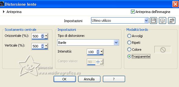 qui puoi trovare qualche risposta ai tuoi dubbi. Se l'argomento che ti interessa non è presente, ti prego di segnalarmelo. Questo tutorial è stato creato con PSP2020 e tradotto con CorelX7, ma può essere eseguito anche con le altre versioni di PSP. Dalla versione X4, il comando Immagine>Rifletti è stato sostituito con Immagine>Capovolgi in orizzontale, e il comando Immagine>Capovolgi con Immagine>Capovolgi in verticale. Nelle versioni X5 e X6, le funzioni sono state migliorate rendendo disponibile il menu Oggetti. Con la nuova versione X7, sono tornati Rifletti>Capovolgi, ma con nuove varianti. Vedi la scheda sull'argomento qui traduzione in francese/traduction en français qui/ici Versioni/Versions quiOccorrente: Un deco a scelta. Materiale qui Per i tubes forniti grazie Edith, Silke e Luz Cristina. (in questa pagina trovi i links ai siti dei creatori di tubes) Filtri: se hai problemi con i filtri, consulta la mia sezione filtri qui Filters Unlimited 2.0 qui Mura's Meister - Copies qui FM Tile Tools - Saturation Emboss qui Toadies - Weaver qui VM Toolbox - Rotatile qui AAA Filters - Custom / AAA Frames - Foto Frame qui I filtri Toadies e VM Toolbox si possono usare da soli o importati in Filters Unlimited (come fare vedi qui) Se un filtro fornito appare con questa icona ![]() non esitare a cambiare modalità di miscelatura e opacità secondo i colori utilizzati. Nelle ultime versioni di PSP non c'è il gradiente di primo piano/sfondo (Corel_06_029) Puoi usare i gradienti delle versioni precedenti. Trovi qui i gradienti Corel X. ![]() 1. Apri una nuova immagine trasparente 900 x 600 pixels. Imposta il colore di primo piano con #35291b, e il colore di sfondo con #e9e0d5. ![]() Passa il colore di primo piano a Gradiente di primo piano/sfondo, stile Lineare. ![]() Riempi l'immagine trasparente con il gradiente.2. Selezione>Seleziona tutto. Apri il tuo deco, per me ![]() Modifica>Copia. Torna al tuo lavoro e vai a Modifica>Incolla nella selezione. Selezione>Deseleziona. Note: dopo l'applicazione degli effetti, i colori del gradiente possono cambiare secondo il tube utilizzato 3. Effetti>Effetti di immagine>Motivo unico, con i settaggi standard. ![]() 4. Regola>Sfocatura>Sfocatura gaussiana - raggio 30. ![]() 5. Livelli>Duplica Effetti>Effetti di distorsione>Distorsione dell'obiettivo. ![]() 6. Immagine>Ridimensiona, al 68%, tutti i livelli non selezionato. 7. Effetti>Plugins>Mura's Meister - Copies. ![]() come notato al punto 2, con gli stessi colori iniziali, i colori dell'immagine cambiano secondo il tube scelto. ![]() 8. Effetti>Plugins>FM Tile Tools - Blend Emboss, con i settaggi standard. ![]() Ripeti l'Effetto una seconda volta. Regola>Messa a fuoco>Accentua messa a fuoco - 2 volte. 9. Oggetti>Allinea>Destra e poi Oggetti>Allinea>Superiore, o attiva lo strumento Puntatore ![]() ![]() 10. Effetti>Effetti 3D>Sfalsa ombra ![]() facoltativo, se vuoi vedere meglio, chiudi questo livello 11. Attiva il livello inferiore, Raster 1. Effetti>Plugins>Toadies - Weaver, con i settaggi standard. ![]() 12. Effetti>Plugins>VM Toolbox - Rotatile, con i settaggi standard. ![]() 13- Effetti>Plugins>FM Tile Tools - Blend Emboss, con i settaggi standard - 2 volte. Regola>Messa a fuoco>Accentua Messa a fuoco. 14. Riapri e attiva il livello superiore. Apri il tuo misted o il tube da posizionare al centro dell'effetto Mura. Per l'esempio, ho usato il tube iniziale Modifica>Copia. Torna al tuo lavoro e vai a Modifica>Incolla come nuovo livello. Posiziona correttamente il tube.Regola>Messa a fuoco>Metti a fuoco. 15. Apri il tube principale, per me Tube Edith Spigai ![]() Modifica>Copia. Torna al tuo lavoro e vai a Modifica>Incolla come nuovo livello. Sposta il tube a sinistra.Regola>Messa a fuoco>Metti a fuoco. Effetti>Effetti 3D>Sfalsa ombra, a scelta. 16. Livelli>Unisci>Unisci visibile. Modifica>Copia 17. Immagine>Aggiungi bordatura, 2 pixels, symmetriche, colore di sfondo. 18. Selezione>Seleziona tutto. Immagine>Aggiungi bordatura, 50 pixels, simmetriche, con un colore qualsiasi. Selezione>Inverti. Modifica>Incolla nella selezione. 19. Regola>Sfocatura>sfocatura gaussiana - raggio 30. ![]() Selezione>Deseleziona. 20. Effetti>Plugins>AAA Frames - Foto Frame. ![]() 21. Apri il tube Deco 68-Luz Cristina ![]() Modifica>Copia. Torna al tuo lavoro e vai a Modifica>Incolla come nuovo livello. Immagine>Ridimensiona, al 50%, tutti i livelli non selezionato. Immagine>Ruota per gradi - 90 gradi a destra. ![]() Sposta il tube in basso a destra.Regola>Messa a fuoco>Metti a fuoco. Effetti>Effetti 3D>Sfalsa ombra, a scelta. 22. Livelli>Unisci>Unisci visibile. 23. Effetti>Plugins>AAA Filters - Custom - clicca su Sharp o Laplace e ok. ![]() 24. Firma il tuo lavoro su un nuovo livello. Livelli>Unisci>Unisci tutto e salva in formato jpg. Per i tubes di questo esempio grazie ![]() ![]() Puoi scrivermi se hai problemi o dubbi, o trovi un link che non funziona, o soltanto per un saluto. |