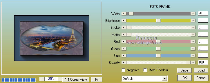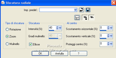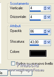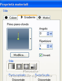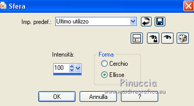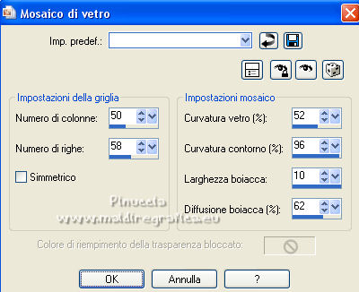 qui puoi trovare qualche risposta ai tuoi dubbi. Se l'argomento che ti interessa non è presente, ti prego di segnalarmelo. Questo tutorial è stato realizzato con Corel19 e tradotto con CorelX7, CorelX2 e CorelX3, ma può essere eseguito anche con le altre versioni di PSP. Dalla versione X4, il comando Immagine>Rifletti è stato sostituito con Immagine>Capovolgi in orizzontale, e il comando Immagine>Capovolgi con Immagine>Capovolgi in verticale. Nelle versioni X5 e X6, le funzioni sono state migliorate rendendo disponibile il menu Oggetti. Con la nuova versione X7, sono tornati Rifletti>Capovolgi, ma con nuove varianti. Vedi la scheda sull'argomento qui traduzione in francese/traduction en français qui/ici Versioni/Versions quiOccorrente: Un tube e un misted a scelta. Il resto del materiale qui Per il tube usato grazie Querida; il misted è mio. (in questa pagina trovi i links ai siti dei creatori di tubes) Filtri: se hai problemi con i filtri, consulta la mia sezione filtri qui Cybia - Screenworks qui Mura's Meister - Copies qui AAA Frames - Foto Frame qui ![]() non esitare a cambiare modalità di miscelatura e opacità secondo i colori utilizzati. Nelle ultime versioni di PSP non c'è il gradiente di primo piano/sfondo (Corel_06_029) Puoi usare i gradienti delle versioni precedenti. Trovi qui i gradienti Corel X. Apri il font e minimizzalo. Lo troverai nella lista dei font disponibili quando ti servirà. Con i nuovi sistemi operativi, questo non è più possibile: per usare un font occorre copiarlo nella cartella Font di Windows. ![]() 1. Apri una nuova immagine trasparente 900 x 500 pixels. Imposta il colore di primo piano con #48657f, e il colore di sfondo con #7c90a6. ![]() Passa il colore di primo piano a Gradiente di primo piano/sfondo, stile Lineare. ![]() Riempi l'immagine trasparente con il gradiente.2. Selezione>Seleziona tutto. Apri il tuo misted e vai a Modifica>Copia. Torna al tuo lavoro e vai a Modifica>Incolla nella selezione. Selezione>Deseleziona. 3. Effetti>Effetti di immagine>Motivo unico, con i settaggi standard. ![]() 4. Livelli>Duplica e chiudi il livello per il momento. Attiva il livello sottostante dell'originale, Raster 1. Regola>Sfocatura>Sfocatura gaussiana - raggio 25. ![]() 5. Effetti>Effetti di trama>Mosaico di vetro. ![]() 6. Riapri e attiva il livello superiore. Regola>Sfocatura>Sfocatura radiale. ![]() Effetti>Effetti di bordo>Aumenta di più. 7. Effetti>Effetti di trama>Veneziana. ![]() 8. Attiva lo strumento Puntatore ,in modalità Scala ![]() spingi il nodo inferiore centrale verso l'alto fino a 250 pixels. ![]() 9. Effetti>Plugins>Mura's Meister - Copies. ![]() 10. Effets>Effets de réflexion>Miroir rotatif. ![]() 11. Attiva nuovamente lo strumento Puntatore ![]() e spingi il nodo centrale inferiore fino a 250 pixels. ![]() 12. Effetti>Effetti di distorsione>Allarga (nelle versioni più recenti Espansione) ![]() 13. Effetti>Effetti geometrici>Sfera. ![]() 14. Effetti>Effetti 3D>Sfalsa ombra. ![]() 15. Livelli>Duplica. Immagine>Capovolgi. Livelli>Unisci>Unisci giù. Regola>Messa a fuoco>Metti a fuoco. 16. Attiva il livello Raster 1. Livelli>Nuovo livello raster. Selezione>Seleziona tutto. Modifica>Incolla nella selezione (il tuo misted è sempre in memoria). Selezione>Deseleziona. 16. Regola>Luminosità e contrasto>Luminosità e contrasto. ![]() 17. Livelli>Unisci>Unisci tutto. 18. Immagine>Aggiungi bordatura, 3 pixels, simmetriche, colore di sfondo #7c90a6. Immagine>Aggiungi bordatura, 60 pixels, simmetriche, colore #fffffff. 19. Attiva lo strumento Bacchetta magica ![]() e clicca nel bordo bianco per selezionarlo. Passa il colore di primo piano a Colore. Riempi la selezione con il colore di primo piano #48657f.20. Effetti>Plugins>Cybia - Screenworks, preset Aged Mosaic ![]() 21. Selezione>Inverti. Effetti>Effetti 3D>Sfalsa ombra, con i settaggi precedenti. ![]() Selezione>Deseleziona. 22. Immagine>Aggiungi bordatura, 3 pixels, simmetriche, colore di primo piano #48657f. 23. Effetti>Plugins>AAA Frames - Foto Frame. ![]() 24. Aggiungi il tuo tube, posizionalo e applica un'Effetto Sfalsa ombra a tua scelta. 25. Attiva lo strumento Testo , font SMG_Lawang Sewcon i seguenti settaggi (da regolare in base al testo e alla versione di PSP) io ho impostato la Crenatura a 100, per aumentare la distanza tra le lettere ![]() Scrivi il testo e posizionalo. Livelli>Converti in livello raster. 26. Effetti>Plugins>Alien Skin Eye Candy Impact - Glass. Seleziona il preset Clear e ok. ![]() scegli l'effetto secondo i tuoi colori: per la versione in fondo al tutorial ho usato l'Effetto Glass di Eye Candy 4000 27. Firma il tuo lavoro su un nuovo livello. Livelli>Unisci>Unisci tutto e salva in formato jpg. 28. Immagine>Ridimensiona, 900 pixels di larghezza, o come preferisci, tutti i livelli selezionato. Salva in formato jpg. Per il tube di questo esempio grazie Tocha; il misted è mio. ![]() ![]() Puoi scrivermi se hai problemi o dubbi, o trovi un link che non funziona, o soltanto per un saluto. |