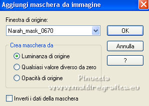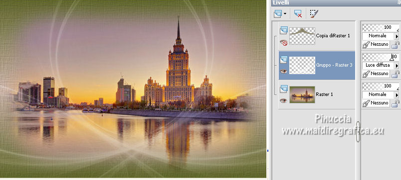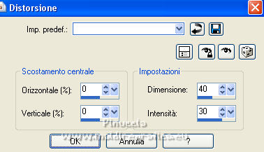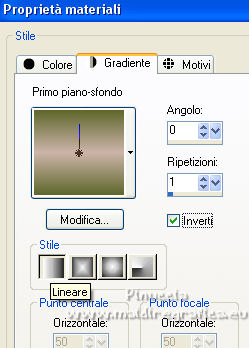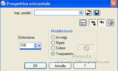 qui puoi trovare qualche risposta ai tuoi dubbi. Se l'argomento che ti interessa non è presente, ti prego di segnalarmelo. Questo tutorial è stato realizzato con Corel19 e tradotto con CorelX7, CorelX2 e CorelX3, ma può essere eseguito anche con le altre versioni di PSP. Dalla versione X4, il comando Immagine>Rifletti è stato sostituito con Immagine>Capovolgi in orizzontale, e il comando Immagine>Capovolgi con Immagine>Capovolgi in verticale. Nelle versioni X5 e X6, le funzioni sono state migliorate rendendo disponibile il menu Oggetti. Con la nuova versione X7, sono tornati Rifletti>Capovolgi, ma con nuove varianti. Vedi la scheda sull'argomento qui traduzione in francese/traduction en français qui/ici Versioni/Versions quiOccorrente: Un misted a scelta. Il resto del materiale qui Per la maschera grazie Narah Per il misted grazie Jeanne. Il resto del materiale è di Edith. (in questa pagina trovi i links ai siti dei creatori di tubes) Filtri: se hai problemi con i filtri, consulta la mia sezione filtri qui Filters Unlimited 2.0 qui Mura's Meister - Copies qui AAA Frames - Foto Frame qui ![]() non esitare a cambiare modalità di miscelatura e opacità secondo i colori utilizzati. Nelle ultime versioni di PSP non c'è il gradiente di primo piano/sfondo (Corel_06_029) Puoi usare i gradienti delle versioni precedenti. Trovi qui i gradienti Corel X. ![]() Apri la maschera in PSP e minimizzala con il resto del materiale. 1. Imposta il colore di primo piano con #ccb4a9, e il colore di sfondo con #5f672c. ![]() Passa il colore di primo piano a Gradiente di primo piano/sfondo, stile Lineare. ![]() 2. Apri una nuova immagine trasparente 900 x 600 pixels. Riempi l'immagine trasparente con il gradiente.3. Livelli>Duplica. Chiudi per il momento questo livello, e attiva il livello sottostante, Raster 1. Effetti>Effetti di trama>Trama - Seleziona la trama Tratteggio fine o Corel_15_021. ![]() Regola>Messa a fuoco>Accentua messa a fuoco. 4. Livelli>Nuovo livello raster. Selezione>Seleziona tutto. Apri il tuo misted e vai a Modifica>Copia. Torna al tuo lavoro e vai a Modifica>Incolla nella selezione. Selezione>Deseleziona. Regola>Messa a fuoco>Metti a fuoco. 5. Livelli>Unisci>Unisci giù. 6. Riapri e attiva il livello superiore, Copia di Raster 1. Effetti>Effetti geometrici>Prospettiva orizzontale. ![]() 7. Immagine>Rifletti. Effetti>Effetti geometrici>Prospettiva orizzontale, con i settaggi precedenti. ![]() 8. Effetti>PluginS>Mura's Meister - Copies. ![]() 9. Effetti>Effetti di riflesso>Specchio rotante, con i settaggi standard. ![]() 10. Oggetti>Allinea>Superiore, o tasto K per attivare lo strumento Puntatore ![]() e imposta posizione Y 0,00 (Posizione X è già 0,00) ![]() 11. Effetti>Effetti 3D>Sfalsa ombra. ![]() 12. Effetti>Effetti di distorsione>Distorsione. ![]() 13. Livelli>Duplica. Livelli>Unisci>Unisci giù. Regola>Messa a fuoco>Accentua messa a fuoco. 14. Imposta il colore di primo piano con il colore bianco #ffffff. Attiva il livello inferiore, Raster 1. Livelli>Nuovo livello raster. Riempi il livello con il colore bianco.15. Livelli>Nuovo livello maschera>Da immagine. Apri il menu sotto la finestra di origine e vedrai la lista dei files aperti. Seleziona la maschera Narah_Mask_0670. ![]() Livelli>Unisci>Unisci gruppo. 16. Livelli>Duplica. Immagine>Rifletti. Livelli>Unisci>Unisci giù. 17. Cambia la modalità di miscelatura di questo livello in Luce diffusa, e abbassa l'opacità all'80%. 18. Chiudi il livello Copia di Raster 1. ![]() Livelli>Unisci>Unisci visibile. 19. Effetti>Plugins>AAA Frames - Foto Frame. ![]() Ripeti l'Effetto una seconda volta. 20. Riapri e attiva il livello superiore. Apri il tube principale e vai a Modifica>Copia. Torna al tuo lavoro e vai a Modifica>Incolla come nuovo livello. Immagine>Ridimensiona, al 55%, tutti i livelli non selezionato. Regola>Messa a fuoco>Metti a fuoco. Sposta il tube a sinistra.21. Effetti>Effetti 3D>Sfalsa ombra. ![]() 22. Apri il file di testo e vai a Modifica>Copia. Torna al tuo lavoro e vai a Modifica>Incolla come nuovo livello. Spostalo a destra o come preferisci.Cambia la modalità di miscelatura di in Luminanza (esistente). 23. Apri il tube déco e vai a Modifica>Copia. Torna al tuo lavoro e vai a Modifica>Incolla come nuovo livello. Spostalo in basso a sinistra, o come preferisci.Livelli>Duplica. 24. Immagine>Aggiungi bordatura, 1 pixel, simmetriche, colore bianco #ffffff. 25. Regola>Luminosità e Contrasto>Luminosità e Contrasto ![]() 25. Livelli>Unisci>Unisci tutto. 26. Firma il tuo lavoro e salva in formato jpg. Per il tube di questo esempio grazie Luz Cristina; il misted di Eilat è mio ![]() ![]() Puoi scrivermi se hai problemi o dubbi, o trovi un link che non funziona, o soltanto per un saluto. |
