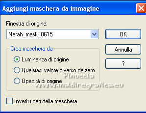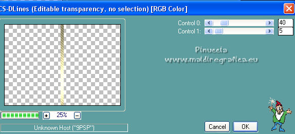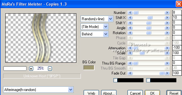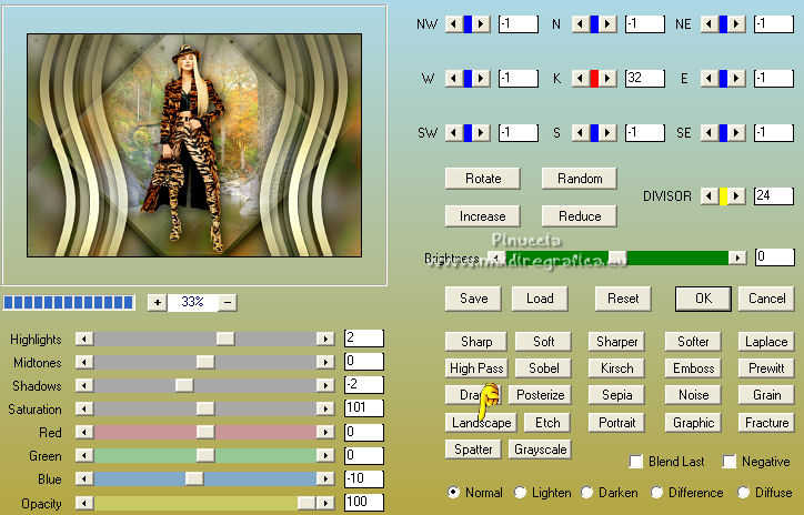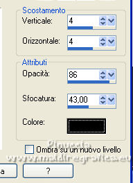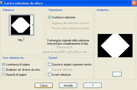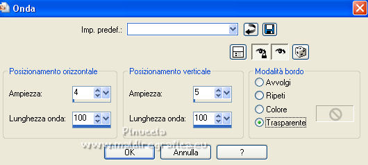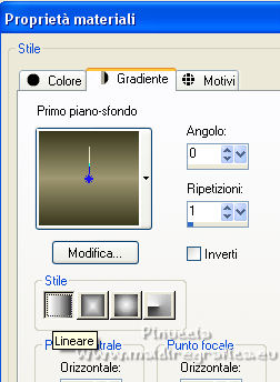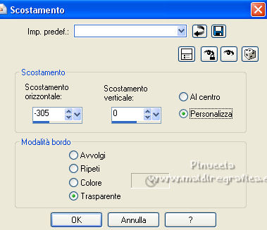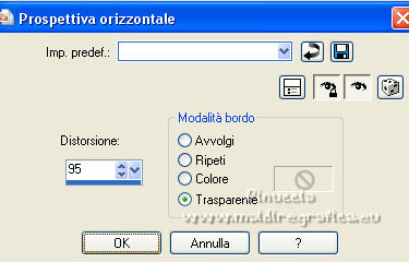 qui puoi trovare qualche risposta ai tuoi dubbi. Se l'argomento che ti interessa non è presente, ti prego di segnalarmelo. Questo tutorial è stato realizzato con Corel19 e tradotto con CorelX7, CorelX2 e CorelX3, ma può essere eseguito anche con le altre versioni di PSP. Dalla versione X4, il comando Immagine>Rifletti è stato sostituito con Immagine>Capovolgi in orizzontale, e il comando Immagine>Capovolgi con Immagine>Capovolgi in verticale. Nelle versioni X5 e X6, le funzioni sono state migliorate rendendo disponibile il menu Oggetti. Con la nuova versione X7, sono tornati Rifletti>Capovolgi, ma con nuove varianti. Vedi la scheda sull'argomento qui traduzione in francese/traduction en français qui/ici Versioni/Versions quiOccorrente: Un tube e un misted a scelta. Il resto del materiale qui Per il tube grazie Luz Cristina; il misted è mio. (in questa pagina trovi i links ai siti dei creatori di tubes) Filtri: se hai problemi con i filtri, consulta la mia sezione filtri qui Mura's Seamless - Emboss at Alpha qui Simple - Diamonds qui Greg's Factory Output vol. II - Pool Shadow qui Carolaine and Sensibility - CS-DLines qui FM Tile Tools - Blend Emboss qui Mura's Meister - Copies qui AAA Filters - Custom qui Filters Unlimited 2.0 qui I filtri Simple, Greg's Factory e Mura's Seamless si possono usare da soli o importati in Filters Unlimited (come fare vedi qui) Se un filtro fornito appare con questa icona ![]() non esitare a cambiare modalità di miscelatura e opacità secondo i colori utilizzati. Nelle ultime versioni di PSP non c'è il gradiente di primo piano/sfondo (Corel_06_029) Puoi usare i gradienti delle versioni precedenti. Trovi qui i gradienti Corel X. ![]() Metti la selezione nella cartella Selezioni. Metti il preset Emboss e nella cartella Impostazioni predefinite. Apri la maschera in PSP e minimizzala con il resto del materiale. 1. Apri una nuova immagine trasparente 900 x 600 pixels. Imposta il colore di primo piano con #3a391e, e il colore di sfondo con #9f9871. ![]() Passa il colore di primo piano a Gradiente di primo piano/sfondo, stile Lineare. ![]() Riempi l'immagine trasparente con il gradiente.2. Selezione>Seleziona tutto. Apri il tuo misted e vai a Modifica>Copia. Torna al tuo lavoro e vai a Modifica>Incolla nella selezione. Selezione>Deseleziona. 3. Effetti>Effetti di immagine>Motivo unico, con i settaggi standard. ![]() 4. Regola>Sfocatura>Sfocatura gaussiana - raggio 30. ![]() 5. Effetti>Plugins>Simple - Diamonds. 6. Effetti>Filtro definito dall'utente, seleziona il preset Emboss 3 e ok. ![]() 7. Livelli>Nuovo livello raster. Riempi il livello con il colore di sfondo #9f9871.8. Effetti>Effetti geometrici>Prospettiva orizzontale. ![]() 9. Immagine>Rifletti. 10. Effetti>Effetti geometrici>Prospettiva Orizzontale, con i settaggi precedenti. Risultato: ![]() 11. Immagine>Ridimensiona, al 70%, tutti i livelli non selezionato. 12. Immagine>Ruota per gradi - 90 gradi a sinistra. ![]() 13. Effetti>Plugins>Greg's Factory Output vol.II - Pool Shadow, con i settaggi standard. ![]() 14. Effetti>Plugins>Caroline And Sensibility - CS-DLines. ![]() 15. Effetti>Plugins>FM Tile Tools - Blend Emboss, con i settaggi standard. ![]() 16. Effetti>Effetti di distorsione>Onda. ![]() 17. Effetti>Effetti 3D>Sfalsa ombra, colore nero. ![]() 18. Effetti>Plugins>Mura's Meister - Copies. ![]() 19. Effetti>Effetti di immagine>Scostamento. ![]() 20. Livelli>Duplica. Immagine>Rifletti. Livelli>Unisci>Unisci giù. 21. Attiva il livello Raster 1. Selezione>Carica/Salva selezione>Carica selezione da disco. Cerca e carica la selezione tag_1. ![]() Selezione>Innalza selezione a livello. 22. Livelli>Nuovo livello raster. Modifica>Incolla nella selezione (il tuo misted è sempre in memoria). Selezione>Deseleziona. Cambia la modalità di miscelatura di questo livello in Filtra. Attiva il livello Selezione innalzata. ![]() 23. Selezione>Modifica>Seleziona bordature selezione. ![]() Riempi la selezione con il gradiente.Selezione>Deseleziona. 24. Effetti>Effetti 3D>Sfalsa ombra, con i settaggi precedenti. ![]() Ripeti l'Effetto Sfalsa ombra, verticale e orizzontale -4. 25. Livelli>Nuovo livello raster. Imposta il colore di primo piano con #f6f6f6. Riempi il livello con il colore di primo piano.26. Livelli>Nuovo livello maschera>Da immagine. Apri il menu sotto la finestra di origine e vedrai la lista dei files aperti. Seleziona la maschera Narah_0615. ![]() Livelli>Unisci>Unisci gruppo. Abbassa l'opacità di questo livello al 50%. Effetti>Effetti di bordo>Aumenta di più. 27. Attiva il livello superiore. Copia e incolla come nuovo livello il tuo tube, e posizionalo al centro.Effetti>Effetti 3D>Sfalsa ombra, a scelta. 28. Livelli>Unisci>Unisci visibile. 29. Effetti>Plugins>AAA Filters - Custom - seleziona Landscape e ok. ![]() 30. Immagine>Aggiungi bordatura, 2 pixels, simmetriche, colore #3a391e. Immagine>Aggiungi bordatura, 2 pixels, simmetriche, colore #9f9871. Immagine>Aggiungi bordatura, 2 pixels, simmetriche, colore #3a391e. Immagine>Aggiungi bordatura, 40 pixels, simmetriche, colore bianco #ffffff. 31. Immagine>Aggiungi bordatura, 2 pixels, simmetriche, colore #3a391e. Immagine>Aggiungi bordatura, 2 pixels, simmetriche, colore #9f9871. Immagine>Aggiungi bordatura, 2 pixels, simmetriche, colore #3a391e. 32. Apri il tube pixelcorners_03 e vai a Modifica>Copia. Torna al tuo lavoro e vai a Modifica>Incolla come nuovo livello. Spostalo nell'angolo in alto a sinistra.33. Effetti>Effetti 3D>Sfalsa ombra. ![]() 34. Livelli>Duplica. Immagine>Rifletti. Immagine>Capovolgi. 35. Livelli>Unisci>Unisci tutto. Firma il tuo lavoro e salva in formato jpg. Per il tube di questo esempio grazie Beatriz; il misted è mio. ![]() ![]() Puoi scrivermi se hai problemi o dubbi, o trovi un link che non funziona, o soltanto per un saluto. |