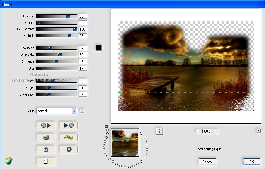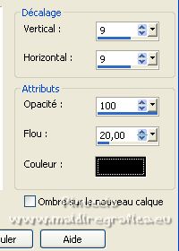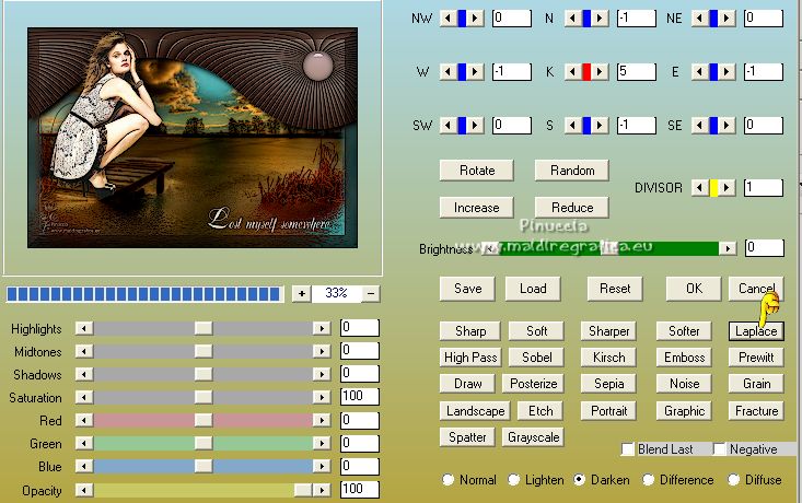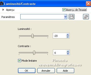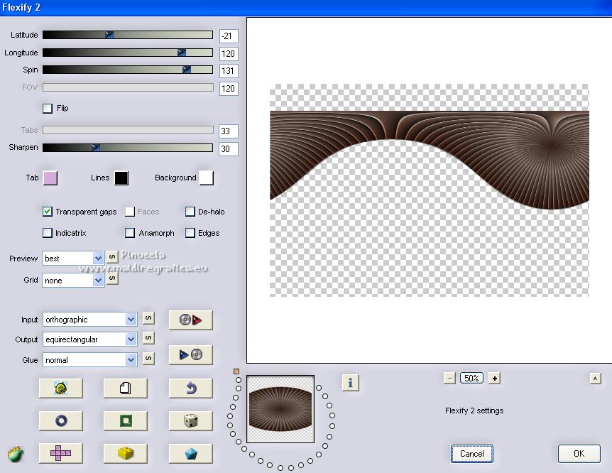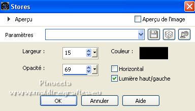 Pour traduire ce tutoriel, créé avec PSPX8, j'ai utilisé CorelX12, mais il peut également être exécuté avec les autres versions. Suivant la version utilisée, vous pouvez obtenir des résultats différents. Depuis la version X4, la fonction Image>Miroir a été remplacée par Image>Renverser horizontalement, et Image>Renverser avec Image>Renverser verticalement . Dans les versions X5 et X6, les fonctions ont été améliorées par la mise à disposition du menu Objets. Avec la nouvelle version X7, nous avons encore Image>Miroir et Image>Renverser/Retourner, mais avec nouvelles différences. Voir les détails à ce sujet ici Certaines dénominations ont changées entre les versions de PSP. Les plus frequentes dénominations utilisées: ![]() traduction italienne ici Vos versions iciNécessaire pour réaliser ce tutoriel: Matériel ici Pour les tubes merci AnaRidzi et Manfred. (ici les liens vers les sites des créateurs de tubes) Modules Externes: consulter, si nécessaire, ma section des filtres ici Flaming Pear - Flexify ici Flaming Pear - Flood ici Mura's Meister - Cloud ici AAA Filters - Custom ici ![]() en fonction des couleurs utilisées, vous pouvez changer le mode mélange et l'opacité des calques. Dans les plus récentes versions de PSP, vous ne trouvez pas le dégradé d'avant plan/arrière plan ou Corel_06_029. Vous pouvez utiliser le dégradé des versions antérieures. Ici le dossier Dégradés de CorelX. 1. Ouvrir une nouvelle image transparente 900 x 600 pixels. 2. Placer en avant plan la couleur foncée #45281d, et en arrière plan la couleur claire #a88b7c. ![]() Préparer en avant plan un dégradé de premier plan/arrière plan, style Linéaire. ![]() Remplir l'image transparente du dégradé.3. Effets>Effets de textures>Stores - couleur noire. ![]() 4. Effets>Effets de bords>Accentuer davantage. 5. Effets>Effets de distorsion>Coordonnées polaires. ![]() 6. Image>Redimensionner, à 95%, redimensionner tous les calques décoché. 7. Effets>Modules Externes>Flaming Pear - Flexify 2. ![]() 8. Objets>Aligner>Haut Si vous travaillez avec une version précédente qui ne rend pas disponible le menu Objets, activer l'outil Sélecteur ![]() et placer Position vert. 0,00. ![]() ![]() 9. Effets>Effets 3D>Ombre portée. ![]() 10. Calques>Nouveau calque raster. Calques>Agencer>Placer en bas de la pile. 11. Effets>Modules Externes>Mura's Meister - Cloud. Ce filtre travaille avec les couleurs de votre palette; pour le tutorial les couleurs ont été changées, mais c'est facultatif couleurs: #7dcbca - #178b8a ![]() 12. Calques>Nouveau calque raster. Sélections>Sélectionner tout. Ouvrir le misted et Édition>Copier. Revenir sur votre travail et Édition>Coller dans la sélection. Sélections>Désélectionner tout. 13. Réglage>Luminosité et Contraste>Luminosité et Contraste. ![]() 14. Effets>Modules Externes>Flaming Pear - Flood. ![]() 15. Calques>Fusionner>Calques visibles. 16. Effets>Effets 3D>Bouton, avec une couleur foncée de l'image: #43271c. ![]() 17. Ouvrir le tube de la femme et Édition>Copier. Revenir sur votre travail et Édition>Coller comme nouveau calque. Image>Miroir. Image>Redimensionner, à votre convenance: pour moi 1 fois à 50% et 1 fois à 80%, redimensionner tous les calques décoché. Déplacer le tube à gauche.Effets>Effets 3D>Ombre portée, à choix. 18. Ouvrir le tube Deco_ESpigai et Édition>Copier. Revenir sur votre travail et Édition>Coller comme nouveau calque. Déplacer le tube en haut à droite.Coloriser, si nécessaire. Réglage>Netteté>Netteté. 19. Ouvrir le texte et Édition>Copier. Revenir sur votre travail et Édition>Coller comme nouveau calque. Déplacer le texte en bas à droite, ou à votre goût.20. Effets>Effets 3D>Ombre portée. ![]() 21. Calques>Fusionner>Tous. 22. Effets>Modules Externes>AAA Filters - Custom - cliquer sur Laplace (ou à votre goût), et ok. ![]() 23. Signer votre travail et enregistrer en jpg. Pour les tubes de cette version merci Aclis et Claudia Viza ![]() ![]() Si vous avez des problèmes, ou des doutes, ou vous trouvez un link modifié, ou somewherement pour me dire que ce tutoriel vous a plu, vous pouvez m'écrire. 25 Novembre 2021 |