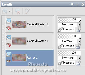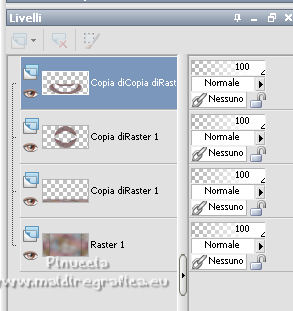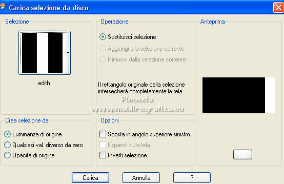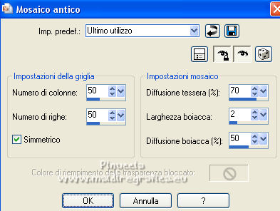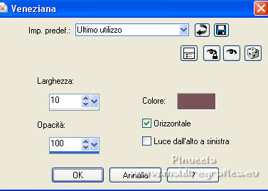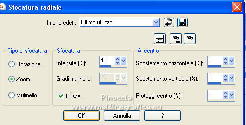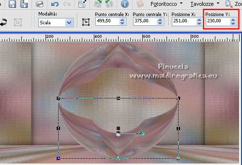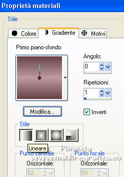 qui puoi trovare qualche risposta ai tuoi dubbi. Se l'argomento che ti interessa non è presente, ti prego di segnalarmelo. Questo tutorial è stato realizzato con Corel19 e tradotto con CorelX7, CorelX2 e CorelX3, ma può essere eseguito anche con le altre versioni di PSP. Dalla versione X4, il comando Immagine>Rifletti è stato sostituito con Immagine>Capovolgi in orizzontale, e il comando Immagine>Capovolgi con Immagine>Capovolgi in verticale. Nelle versioni X5 e X6, le funzioni sono state migliorate rendendo disponibile il menu Oggetti. Con la nuova versione X7, sono tornati Rifletti>Capovolgi, ma con nuove varianti. Vedi la scheda sull'argomento qui traduzione in francese/traduction en français qui/ici Versioni/Versions quiOccorrente: Un misted a scelta. Il resto del materiale qui Per i tube grazie Cal e Nena Silva. (in questa pagina trovi i links ai siti dei creatori di tubes) Filtri: se hai problemi con i filtri, consulta la mia sezione filtri qui Filters Unlimited 2.0 qui VM Natural - Sparkle qui Mura's Meister - Perspective Tiling qui Graphics Plus - Cross Shadow qui I filtri Graphics Plus e VM Natural si possono usare da soli o importati in Filters Unlimited (come fare vedi qui) Se un filtro fornito appare con questa icona ![]() non esitare a cambiare modalità di miscelatura e opacità secondo i colori utilizzati. Nelle ultime versioni di PSP non c'è il gradiente di primo piano/sfondo (Corel_06_029) Puoi usare i gradienti delle versioni precedenti. Trovi qui i gradienti Corel X. ![]() Metti la selezione nella cartella Selezioni. 1. Scegli due colori dal tuo materiale. Imposta il colore di primo piano con il colore chiaro #c09aa1 e il colore di sfondo con il colore scuro #674148 ![]() Passa il colore di primo piano a Gradiente di primo piano/sfondo, stile Lineare. ![]() 2. Apri una nuova immagine trasparente 1000 x 500 pixels, e riempila con il gradiente.3. Selezione>Seleziona tutto. Apri il tuo misted e vai a Modifica>Copia. Torna al tuo lavoro e vai a Modifica>Incolla nella selezione. Selezione>Deseleziona. 4. Effetti>Effetti di immagine>Motivo unico, con i settaggi standard. ![]() 5. Livelli>Duplica. Chiudi questo livello e attiva il livello inferiore, Raster 1. Regola>Sfocatura>Sfocatura gaussiana - raggio 25. ![]() 6. Effetti>Effetti di trama>Mosaico antico. ![]() Regola>Messa a fuoco>Accentua messa a fuoco. 7. Livelli>Duplica. Chiudi questo livello e attiva nuovamente il livello inferiore, Raster 1. ![]() 8. Selezione>Carica/Salva selezione>Carica selezione da disco. Cerca e carica la selezione edith. ![]() Selezione>Innalza selezione a livello. 9. Effetti>Effetti 3D>Sfalsa ombra. ![]() Selezione>Deseleziona. 10. Livelli>Duplica. Immagine>Rifletti Livelli>Unisci>Unisci giù - 2 volte. 11. Apri e attiva il livello Copia di Raster 1. ![]() Effetti>Plugins>Mura's Meister - Perspective Tiling. ![]() Regola>Messa a fuoco>Metti a fuoco. 12. Effetti>Effetti 3D>Sfalsa ombra. ![]() 13. Apri e attiva il livello superiore. ![]() Regola>Sfocatura>Sfocatura radiale. ![]() Effetti>Effetti di bordo>Aumenta di più. 14. Effetti>Effetti di trama>Veneziana, colore scuro. ![]() Regola>Messa a fuoco>Metti a fuoco. 15. Attiva lo strumento Puntatore ![]() in modalità Scala ![]() spingi il nodo inferiore centrale verso l'alto, fino a 150 pixels. ![]() 16. Effetti>Effetti di distorsione>Sfera. ![]() 17. Effetti>Effetti geometrici>Cerchio. ![]() 18. Livelli>Duplica. Immagine>Capovolgi. 19. Per unire il cerchio: Strumento Puntatore ![]() mantieni Posizione X: 251,00 e imposta Posizione Y: 230,00. ![]() 20. Livelli>Unisci>Unisci giù. 21. Livelli>Duplica. Effetti>Effetti di distorsione>Coordinate polari. ![]() 22. Attiva il livello del cerchio. Attiva lo strumento Bacchetta magica ![]() e clicca nel cerchio per selezionarlo. ![]() 23. Attiva il livello delle Coordinate polari. ![]() Premi sulla tastiera il tasto CANC ![]() Selezione>Deseleziona. 24. Livelli>Unisci>Unisci giù. Regola>Messa a fuoco>Metti a fuoco. 25. Effetti>Effetti 3D>Sfalsa ombra. ![]() 26. Attiva il livello Raster 1. Modifica>Incolla come nuovo livello (il tuo misted è sempre in memoria). Immagine>Ridimensiona, se necessario, tutti i livelli non selezionato. Posiziona correttamente il tube al centro del cerchio.Regola>Messa a fuoco>Metti a fuoco. 27. Attiva nuovamente il livello Raster Effetti>Plugins>VM Natural - Sparkle ![]() 28. Attiva il livello superiore. Apri il tube della donna e vai a Modifica>Copia. Torna al tuo lavoro e vai a Modifica>Incolla come nuovo livello. Immagine>Ridimensiona, se necessario, tutti i livelli non selezionato. Regola>Messa a fuoco>Metti a fuoco. Sposta il tube a sinistra.Effetti>Effetti 3D>Sfalsa ombra, a scelta. 29. Apri il tube deco e vai a Modifica>Copia. Torna al tuo lavoro e vai a Modifica>Incolla come nuovo livello. Immagine>Ridimensiona, se necessario, tutti i livelli non selezionato. Regola>Messa a fuoco>Metti a fuoco. Sposta il tube a destra.Effetti>Effetti 3D>Sfalsa ombra, a scelta. ![]() 30. Immagine>Aggiungi bordatura, 2 pixels, simmetriche, colore scuro #674148. Immagine>Aggiungi bordatura, 2 pixels, simmetriche, colore chiaro #c09aa1. Immagine>Aggiungi bordatura, 2 pixels, simmetriche, colore scuro #674148. Selezione>Seleziona tutto. Immagine>Aggiungi bordatura, 40 pixels, simmetriche, colore bianco #ffffff. Selezione>Inverti. Passa il colore di primo piano a Colore. Riempi la selezione con il colore chiaro di primo piano #c09aa1.31. Effetti>Plugins>Graphics Plus - Cross Shadow, con i settaggi standard. ![]() 32. Selezione>Inverti. Effetti>Effetti 3D>Sfalsa ombra. ![]() Selezione>Deseleziona. 33. Immagine>Aggiungi bordatura, 2 pixels, simmetriche, colore scuro #674148. 34. Immagine>Ridimensiona, come preferisci, tutti i livelli selezionato. 35. Firma il tuo lavoro su un nuovo livello. Livelli>Unisci>Tutto e salva in formato jpg. Versione con tubes di Beatriz, Jewel e Nena Silva. ![]() Versione con tubes di Jewel ![]() ![]() Puoi scrivermi se hai problemi o dubbi, o trovi un link c