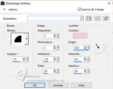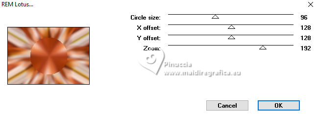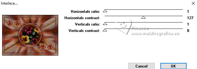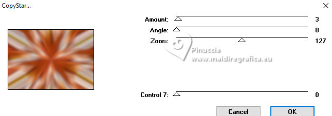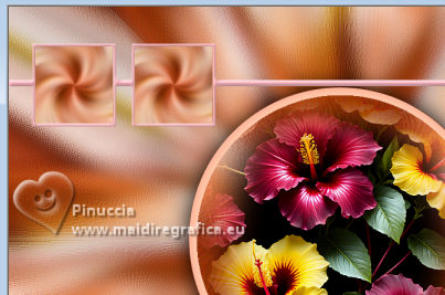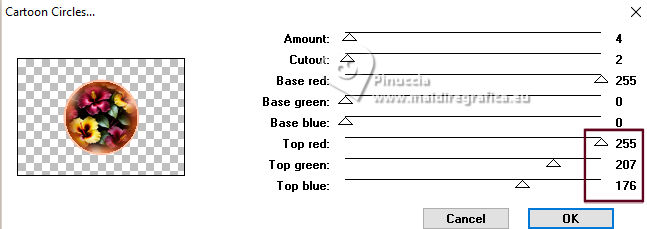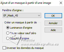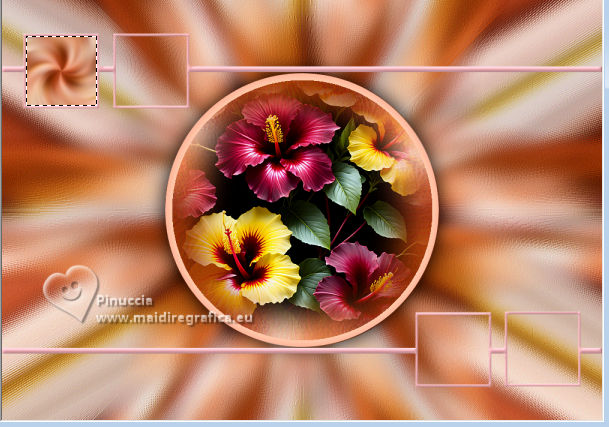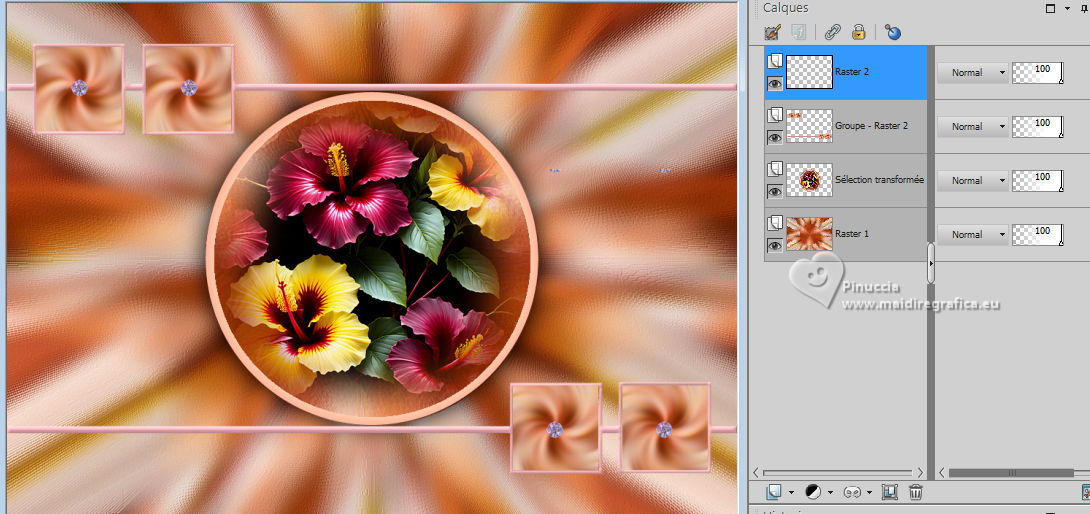 Pour traduire ce tutoriel, créé avec PSP2020, j'ai utilisé PSPX7, mais il peut également être exécuté avec les autres versions. Suivant la version utilisée, vous pouvez obtenir des résultats différents. Depuis la version X4, la fonction Image>Miroir a été remplacée par Image>Renverser horizontalement, et Image>Renverser avec Image>Renverser verticalement . Dans les versions X5 et X6, les fonctions ont été améliorées par la mise à disposition du menu Objets. Avec la nouvelle version X7, nous avons encore Image>Miroir et Image>Renverser/Retourner, mais avec nouvelles différences. Voir les détails à ce sujet ici Certaines dénominations ont changées entre les versions de PSP. Les plus frequentes dénominations utilisées: ![]() traduction italienne ici Vos versions iciNécessaire pour réaliser ce tutoriel: À choix un tube principale et un mist floral Le reste du matériel: ![]() Pour les tubes de ma version merci Kamil et Mentali. (ici les liens vers les sites des créateurs de tubes) ![]() consulter, si nécessaire, ma section des filtres ici Filters Unlimited 2.0 ici Unplugged Tools ici Filtres Unplugged peuvent être utilisés seuls ou importés dans Filters Unlimited. voir comment le faire ici). Si un filtre est fourni avec cette icône, ![]() en fonction des couleurs utilisées, vous pouvez changer le mode mélange et l'opacité des calques. Dans les plus récentes versions de PSP, vous ne trouvez pas le dégradé d'avant plan/arrière plan ou Corel_06_029. Vous pouvez utiliser le dégradé des versions antérieures. Ici le dossier Dégradés de CorelX. ![]() Placer le preset dans le dossier Paramètres par défaut. Placer les sélections dans le dossier Sélections. Ouvrir le masque dans PSP et le minimiser avec le reste du matériel. 1. Ouvrir une nouvelle image transparente 1000 x 700 pixels. Choisir deux couleurs de vos tubes. Mes couleurs. ![]() Préparer en avant plan un dégradé de premier plan/arrière plan, style Linéaire. ![]() Remplir l'image transparente du dégradé.2. Sélections>Sélectionner tout. Ouvrir le tube principal et Édition>Copier. Minimiser le tube. Revenir sur votre travail et Édition>Coller dans la sélection. Sélections>Désélectionner tout. 3. Effets>Effets d'image>Mosaïque sans jointures. ![]() 4. Réglage>Flou>Flou gaussien - rayon 30. ![]() 5. Effets>Modules Externes>Filters Unlimited 2.0 - Unplugged Tools - Copy Star, par défaut. ![]() 6. Réglage>Traitement rapide des photos. 7. Effets>Filtre personnalisé - Emboss 3 ![]() Réglage>Netteté>Davantage de netteté. 8. Vous positionner sur le calque Raster 1. Édition>Copier. Édition>Coller comme nouvelle image. Minimiser cette image, elle sera utilisé à l'étape 17. 9. Effets>Modules Externes>Filters Unlimited 2.0 - Unplugged Tools - Rem Lotus, par défaut. ![]() 10. Sélections>Charger/Enregistrer une sélection>Charger à partir du disque. Chercher et sélectionner la sélection Edith_22 ![]() Sélections>Transformer la sélection en calque. 11. Ouvrir le misted florale et Édition>Copier. Revenir sur votre travail et Édition>Coller dans la sélection. Sélections>Désélectionner tout. Réglage>Netteté>Netteté. 12. Effets>Modules Externes>Filters Unlimited 2.0 - Unplugged Tools - Cartoon Circles. ![]() règler Top red, Top green et Top blue selon vos couleurs 13. Effets>Effets 3D>Ombre portée, couleur noire. ![]() 14. Calques>Nouveau calque raster. Placer en avant plan la couleur claire #f2ced3. Remplir le calque avec la couleur d'avant plan #f2ced3.15. Calques>Nouveau calque de masque>A partir d'une image. Ouvrir le menu deroulant sous la fenêtre d'origine et vous verrez la liste des images ouvertes. Sélectionner le masque EF_Mask_45 ![]() Calques>Fusionner>Fusionner le groupe. 16. Effets>Effets 3D>Biseautage intérieur, couleur claire d'avant plan. ![]() 17. Activer l'image copiée à l'étape 8 et nous allons préparer le déco pour le masque. Réglage>Flou>Flou radial. ![]() Réglage>Traitement rapide des photos. 18. Effets>Filtre personnalisé - Emboss 3. Réglage>Netteté>Netteté. 19. Image>Redimensionner, à 20%, redimensionner tous les calques coché Édition>Copier. 20. Revenir sur votre travail. Sélections>Charger/Enregistrer une sélection>Charger à partir du disque. Chercher et sélectionner la sélection edit_23 ![]() 21. Calques>Nouveau calque raster. Édition>Coller dans la sélection. ![]() Sélections>Désélectionner tout. 22. Calques>Dupliquer. Positionner l'image sur l'autre cadre.![]() 23. Calques>Fusionner>Fusionner le calque de dessous. Calques>Dupliquer. Image>Miroir>Miroir Vertical (Image>Renverser). Image>Miroir>Miroir horizontal (Image>Miroir). Calques>Fusionner>Fusionner le calque de dessous - 2 fois. ![]() 24. Effets>Effets 3D>Ombre portée, comme précédemment ![]() 25. Ouvrir diamond ![]() Édition>Copier. Revenir sur votre travail et Édition>Coller comme nouveau calque. Image>Redimensionner, à votre convenance - j'ai redimensionné 2 fois à 50%, tous les calques décoché. Positionner le déco au centre du premier cadre en haut.Calques>Dupliquer, et positionner le déco au centre de l'autre cadre.26. Calques>Fusionner>Fusionner le calque de dessous. Calques>Dupliquer. Image>Miroir>Miroir Vertical (Image>Renverser). Image>Miroir>Miroir horizontal (Image>Miroir). Calques>Fusionner>Fusionner le calque de dessous. ![]() 27. Édition>Copie Spéciale>Copier avec fusion. 28. Image>Ajouter des bordures, 2 pixels, symétrique, couleur foncée. Image>Ajouter des bordures, 2 pixels, symétrique, couleur claire. Image>Ajouter des bordures, 2 pixels, symétrique, couleur foncée. 29. Sélections>Sélectionner tout. Image>Ajouter des bordures, 40 pixels, symétrique, couleur blanche #ffffff. Sélections>Inverser. Édition>Coller dans la sélection. 30. Réglage>Flou>Flou gaussien - rayon 30. ![]() 31. Effets>Modules Externes>Unplugged Tools - Interlace, par défaut. ![]() 32. Sélections>Inverser. Effets>Effets 3D>Ombre portée, comme 