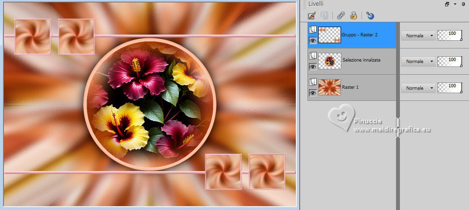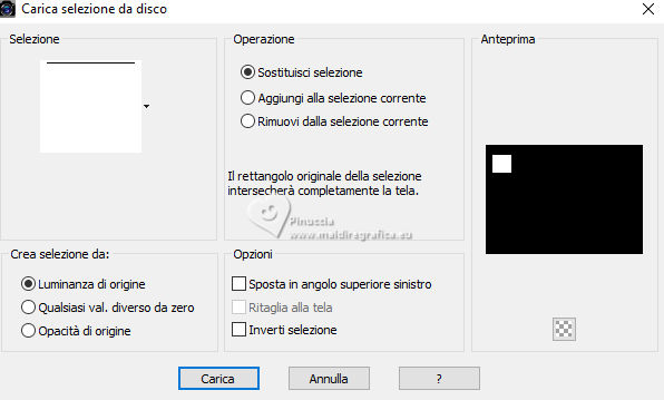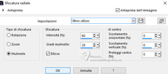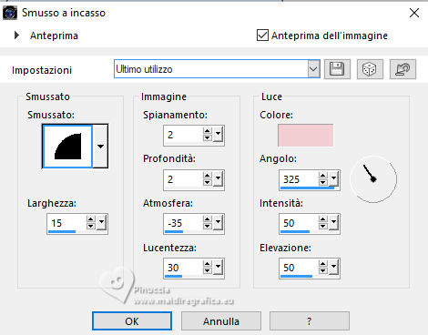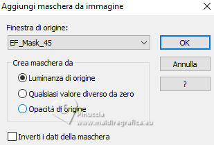 qui puoi trovare qualche risposta ai tuoi dubbi. Se l'argomento che ti interessa non è presente, ti prego di segnalarmelo. Questo tutorial è stato creato e tradotto con PSP2020, ma può essere eseguito anche con le altre versioni di PSP. Dalla versione X4, il comando Immagine>Rifletti è stato sostituito con Immagine>Capovolgi in orizzontale, e il comando Immagine>Capovolgi con Immagine>Capovolgi in verticale. Nelle versioni X5 e X6, le funzioni sono state migliorate rendendo disponibile il menu Oggetti. Con la nuova versione X7, sono tornati Rifletti>Capovolgi, ma con nuove varianti. Vedi la scheda sull'argomento qui traduzione in francese/traduction en français qui/ici Versioni/Versions quiOccorrente: A scelta un tube principale e un tube floreale. Il resto del materiale ![]() Per i tubes del mio esempio grazie Kamil e Mentali. (in questa pagina trovi i links ai siti dei creatori di tubes) ![]() se hai problemi con i filtri, consulta la mia sezione filtri qui Filters Unlimited 2.0 qui Unplugged Tools - Copy Star, Rem Lotus, Cartoon Circles, Interlace qui I filtri Unplugged Tools si possono usare da soli o importati in Filters Unlimited (come fare vedi qui) Se un filtro fornito appare con questa icona ![]() non esitare a cambiare modalità di miscelatura e opacità secondo i colori utilizzati. Nelle ultime versioni di PSP non c'è il gradiente di primo piano/sfondo (Corel_06_029) Puoi usare i gradienti delle versioni precedenti. Trovi qui i gradienti Corel X. ![]() Metti il preset nella cartella Impostazioni predefinite. Metti le selezioni nella cartella Selezioni. Apri la maschera in PSP e minimizzala con il resto del materiale. 1. Apri una nuova immagine trasparente 1000 x 700 pixels. Scegli due colori dal tuo materiale. I miei colori: ![]() Passa il colore di primo piano a Gradiente di primo piano/sfondo, stile Lineare ![]() Riempi l'immagine trasparente con il gradiente.2. Selezione>Seleziona tutto. Apri il tube principale e vai a Modifica>Copia. Minimizza il tube. Torna al tuo lavoro e vai a Modifica>Incolla nella selezione. Selezione>Deseleziona. 3. Effetti>Effetti di immagine>Motivo unico. ![]() 4. Regola>Sfocatura>Sfocatura gaussiana - raggio 30. ![]() 5. Effetti>Plugins>Filters Unlimited 2.0 - Unplugged Tools - Copy Star, con i settaggi standard. ![]() 6. Regola>Correzione fotografica in un passaggio. 7. Effetti>Filtro definito dall'utente - Emboss 3. ![]() Regola>Messa a fuoco>Accentua Messa a fuoco. 8. Attiva il livello Raster 1. Modifica>Copia. Modifica>Incolla come nuova immagine. Minimizza l'immagine, la useremo al punto 17. 9. Effetti>Plugins>Filters Unlimited 2.0 - Unplugged Tools - Rem Lotus, con i settaggi standard. ![]() 10. Selezione>Carica/Salva selezione>Carica selezione da disco. Cerca e carica la selezione Edith_22 ![]() Selezione>Innalza selezione a livello. 11. Apri il tuo misted florale e vai a Modifica>Copia. Torna al tuo lavoro e vai a Modifica>Incolla nella selezione. Selezione>Deseleziona. Regola>Messa a fuoco>Metti a fuoco. 12. Effetti>Plugins>Filters Unlimited 2.0 - Unplugged Tools - Cartoon Circles. ![]() regola Top red, Top green e Top blue secondo i tuoi colori 13. Effetti>Effetti 3D>Sfalsa ombra, colore nero. ![]() 14. Livelli>Nuovo livello raster. Imposta il colore di primo piano con il colore chiaro #f2ced3. Riempi il livello con il colore di primo piano #f2ced3.15.Livelli>Nuovo livello maschera>Da immagine. Apri il menu sotto la finestra di origine e vedrai la lista dei files aperti. Seleziona la maschera EF_Mask_45 ![]() Livelli>Unisci>Unisci gruppo. 16. Effetti>Effetti 3D>Smusso a incasso, colore chiaro di primo piano. ![]() 17. Attiva l'immagine copiata al punto 8 e prepariamo il decoro da applicare nella maschera. Regola>Sfocatura>Sfocatura radiale. ![]() Regola>Correzione fotografica in un passaggio. 18. Effetti>Filtro definito dall'utente - Emboss 3. Regola>Messa a fuoco>Metti a fuoco. 19. Immagine>Ridimensiona, al 20%, tutti i livelli non selezionato. Modifica>Copia. 20. Torna al tuo lavoro. Selezione>Carica/Salva selezione>Carica selezione da disco. Cerca e carica la selezione edit_23 ![]() 21. Livelli>Nuovo livello raster. Modifica>Incolla nella selezione. ![]() Selezione>Deseleziona. 22. Livelli>Duplica. Posiziona l'immagine nell'altro quadro.![]() 23. Livelli>Unisci>Unisci giù. Livelli>Duplica. Immagine>Rifletti>Rifletti verticalmente (Immagine>Capovolgi). Immagine>Rifletti>Rifletti orizzontalmente (Immagine>Rifletti). Livelli>Unisci>Unisci giù - 2 volte. ![]() 24. Effetti>Effetti 3D>Sfalsa ombra, con i settaggi precedenti ![]() 25. Apri diamond ![]() Modifica>Copia. Torna al tuo lavoro e vai a Modifica>Incolla come nuovo livello. Immagine>Ridimensiona, a tuo piacimento, io ho ridimensionato 2 volte al 50%, tutti i livelli non selezionato. Posiziona il tube al centro del primo quadro in alto.Livelli>Duplica, e posiziona il tube al centro dell'altro quadro.26. Livelli>Unisci>Unisci giù. Livelli>Duplica. Immagine>Rifletti>Rifletti verticalmente (Immagine>Capovolgi). Immagine>Rifletti>Rifletti orizzontalmente (Immagine>Rifletti). Livelli>Unisci>Unisci giù. ![]() 27. Modifica>Copia Speciale>Copia Unione. 28. Immagine>Aggiungi bordatura, 2 pixels, simmetriche, colore scuro. Immagine>Aggiungi bordatura, 2 pixels, simmetriche, colore chiaro. Immagine>Aggiungi bordatura, 2 pixels, simmetriche, colore scuro. 29 Selezione>Seleziona tutto. Immagine>Aggiungi bordatura, 40 pixels, simmetriche, colore bianco #ffffff. Selezione>Inverti. Modifica>Incolla nella selezione. 30. Regola>Sfocatura>Sfocatura gaussiana - raggio 30. ![]() 31. Effetti>Plugins>Unplugged Tools - Interlace, con i settaggi standard. ![]() 32. Selezione>Inverti. Effetti>Effetti 3D>Sfalsa ombra, con i settaggi precedenti. ![]() Selezione>Deseleziona. 33. Attiva nuovamente il tube principale e vi a Modifica>Copia. Torna al tuo lavoro e vai a Modifica>Incolla come nuovo livello. Immagine>Ridimensiona, se necessario, tutti i livelli non selezionato. Regola>Messa a fuoco>Metti a fu