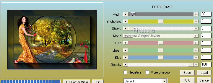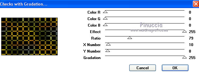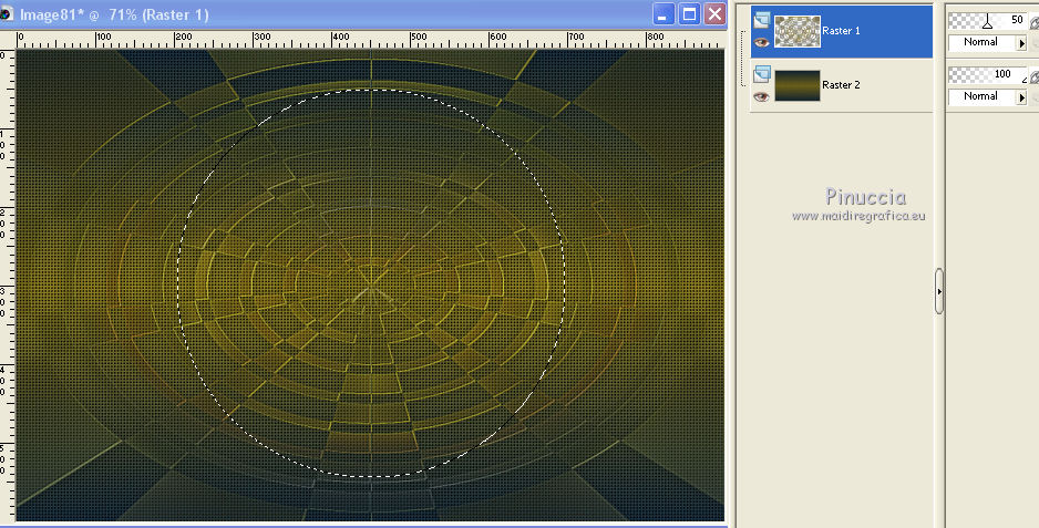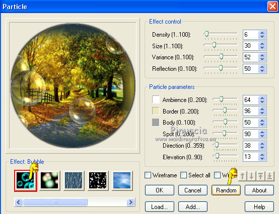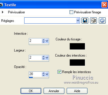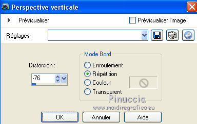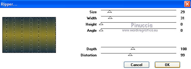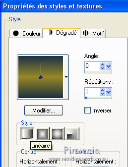 Pour traduire ce tutoriel j'ai utilisé CorelX12, mais il peut également être exécuté avec les autres versions. Suivant la version utilisée, vous pouvez obtenir des résultats différents. Depuis la version X4, la fonction Image>Miroir a été remplacée par Image>Renverser horizontalement, et Image>Renverser avec Image>Renverser verticalement . Dans les versions X5 et X6, les fonctions ont été améliorées par la mise à disposition du menu Objets. Avec la nouvelle version X7, nous avons encore Image>Miroir et Image>Renverser/Retourner, mais avec nouvelles différences. Voir les détails à ce sujet ici Certaines dénominations ont changées entre les versions de PSP. Les plus frequentes dénominations utilisées: ![]() Vos versions iciNécessaire pour réaliser ce tutoriel: Tubes à choix Le reste du matériel (preset Emboss 3) ici Les tubes de ma version sont de Luz Cristina, Sonia et Azalée (ici les liens vers les sites des créateurs de tubes) Modules Externes: consulter, si nécessaire, ma section des filtres ici Filters Unlimited 2.0 ici AAA Frames - Foto Frame / AAA Filters - Custom ici Transparency - Eliminate Black ici Mura's Seamless - Check with Gradation ici Filter Factory Gallery A - Ripper ici Ulead - Particle ici Filtres Transparency, Mura's Seamless et Factory Gallery peuvent être utilisés seuls ou importés dans Filters Unlimited. voir comment le faire ici). Si un filtre est fourni avec cette icône, ![]() en fonction des couleurs utilisées, vous pouvez changer le mode mélange et l'opacité des calques. 1. Ouvrir une nouvelle image transparente 900 x 600 pixels. 2. Placer en avant plan la couleur #1c3344, et en arrière plan la couleur #978726. Préparer en avant plan un dégradé de premier plan/arrière plan. ![]() Remplir l'image transparente du dégradé.3. Sélections>Sélectionner tout. Ouvrir votre misted - Édition>Copier. Revenir sur votre travail et Édition>Coller dans la sélection. Sélections>Désélectionner tout. 4. Effets>Effets d'image>Mosaïque sans jointures, par défaut. ![]() 5. Réglage>Flou>Flou gaussien - rayon 20. ![]() 6. Effets>Modules Externes>Mura's Seamless - Checks with Gradation. ![]() 7. Effets>Modules Externes>Transparency - Eliminate Black. 8. Effets>Effets de distorsion>Coordonnées polaires. ![]() 9. Effets>Effets de réflexion>Miroir rotatif. ![]() 10. Effets>Filtre personnalisé - sélectionner le preset Emboss 3 et ok. ![]() 11. Réglage>Netteté>Davantage de netteté - 2 fois. 12. Effets>Effets 3D>Ombre portée. ![]() 13. Calques>Nouveau calque raster. Calques>Agencer>Placer en bas de la pile. Remplir le calque du dégradé.14. Effets>Effets de textures>Textile ![]() 15. Vous positionner sur le calque Raster 1. Activer l'outil Sélection , cercleet tracer un cercle au centre. ![]() pour avoir un résultat un peu plus semblable du tutoriel original ![]() avant de tracer la sélection j'ai réduit l'opacité de ce calque à 50% ![]() 16. Calques>Nouveau calque raster. Remplir la sélection du dégradé.Édition>Coller dans la sélection (votre misted est toujours en mémoire). 17. Effets>Effets 3D>Ciselage, couleur noire ![]() Sélections>Désélectionner tout. Réglage>Netteté>Netteté. 18. Vous positionner sur le calque Raster 2. Calques>Nouveau calque raster. Remplir la sélection du dégradé.19. Effets>Modules Externes>Filter Factory Gallery A - Ripper. ![]() 20. Effets>Effets géométriques>Perspective Verticale. ![]() 21. Activer l'outil Sélecteur ![]() (si vous ne visualisez pas les règles: Affichage>Règles) Pousser le noeud central supérieur vers le bas, jusqu'à 350 pixels. ![]() 22. Effets>Effets 3D>Ombre portée. ![]() 23. Vous positionner sur le calque du haut de la pile. Effets>Modules Externes>Ulead - Particle - sélectionner le preset Bubble avec ces réglages; pour changer la position e la dimension des boules, cliquer sur Random, jusqu'à voir le résultat que vous préférez ![]() Les calques et la tag, sans la variante de l'étape 15. ![]() Les calques et la tag, avec la variante de l'étape 15. ![]() 24. Copier/Coller comme nouveau calque vos tubes et les positionner à votre goût.Effets>Effets 3D>Ombre portée, à choix. 25. Calques>Fusionner>Calques visibles. 26. Effets>Modules Externes>AAA Frames - Foto Frame. ![]() 27. Effets>Modules Externs>AAA Filters - Custom - cliquer sur Laplace et ok. ![]() 28. Signer votre travail sur un nouveau calque. Calques>Fusionner>Tous et enregistrer en jpg. Version avec tubes de Luz Cristina et Azalée ![]() ![]() Vos versions ici![]() Si vous avez des problèmes, ou des doutes, ou vous trouvez un link modifié, ou stylement pour me dire que ce tutoriel vous a plu, vous pouvez m'écrire. 29 Juin 2020 |