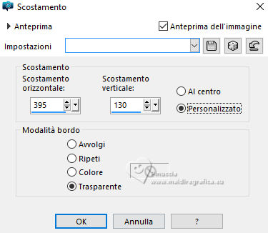 qui puoi trovare qualche risposta ai tuoi dubbi. Se l'argomento che ti interessa non è presente, ti prego di segnalarmelo. Questo tutorial è stato creato e tradotto con PSP2020, ma può essere eseguito anche con le altre versioni di PSP. Dalla versione X4, il comando Immagine>Rifletti è stato sostituito con Immagine>Capovolgi in orizzontale, e il comando Immagine>Capovolgi con Immagine>Capovolgi in verticale. Nelle versioni X5 e X6, le funzioni sono state migliorate rendendo disponibile il menu Oggetti. Con la nuova versione X7, sono tornati Rifletti>Capovolgi, ma con nuove varianti. Vedi la scheda sull'argomento qui traduzione in francese/traduction en français qui/ici Versioni/Versions quiOccorrente: Due tube a scelta. Il resto del materiale ![]() Per i miei tubes grazie Beatriz e Krys. (in questa pagina trovi i links ai siti dei creatori di tubes) ![]() se hai problemi con i filtri, consulta la mia sezione filtri qui Mehdi - Sorting Tiles qui AP Lines - Lines SilverLining qui DSB Flux - Gears qui Mura's Meister - Perspective Tiling qui AAA Filters - Custom /AAA Frames - Foto Frame qui ![]() non esitare a cambiare modalità di miscelatura e opacità secondo i colori utilizzati. ![]() Metti il preset Emboss 3 nella cartella Impostazioni predefinite. 1. Apri una nuova immagine trasparente 950 x 650 pixels. 2. Selezione>Seleziona tutto. Apri il tuo misted e vai a Modifica>Copia. Torna al tuo lavoro e vai a Modifica>Incolla nella selezione. Selezione>Deseleziona. 3. Effetti>Effetti di immagine>Motivo unico. ![]() 4. Livelli>Unisci>Unisci tutto. 5. Livelli>Innalza livello di sfondo. 6. Regola>Sfocatura>Sfocatura gaussiana - raggio 30. ![]() 7. Effetti>Plugins>Mehdi - Sorting Tiles. ![]() 8. Effetti>Effetti di bordo>Aumenta di più. 9. Livelli>Duplica. Effetti>Plugins>DSB Flux - Gears. ![]() 10. Effetti>Effetti di riflesso>Specchio rotante, con i settaggi standard. ![]() 11. Effetti>Filtro definito dall'utente - seleziona il preset Emboss 3 e ok. ![]() 12. Livelli>Duplica. Effetti>Effetti di distorsione>Coordinate polari. ![]() 13. Immagine>Ridimensiona, al 70%, tutti i livelli non selezionato. Regola>Messa a fuoco>Metti a fuoco o Aumenta messa a fuoco. 14. Effetti>Effetti 3D>Sfalsa ombra, colore nero #000000. ![]() 15. Attiva il livello Copia di Raster 1. Effetti>Plugins>Mura's Meister - Perspective Tiling. ![]() 16. Regola>Messa a fuoco>Accentua messa a fuoco. 17. Effetti>Effetti 3D>Sfalsa ombra, colore nero #000000. ![]() 18. Attiva il livello Raster 1. Effetti>Plugins>AP [Lines] - Lines SilverLining., ![]() 19. Attiva il livello superiore. Apri il tuo tube floreale o altro, e vai a Modifica>Copia. Torna al tuo lavoro e vai a Modifica>Incolla come nuovo livello. Immagine>Ridimensiona, se necessario. Regola>Messa a fuoco>Metti a fuoco. Posiziona il tube al centro.Effetti>Effetti 3D>Sfalsa ombra, a scelta. 20. Apri il tube principale e vai a Modifica>Copia. Torna al tuo lavoro e vai a Modifica>Incolla come nuovo livello. Immagine>Ridimensiona, se necessario. Regola>Messa a fuoco>Metti a fuoco. Posiziona il tube a tuo piacimento.Effetti>Effetti 3D>Sfalsa ombra, a scelta. 21. Apri il testo ![]() Modifica>Copia. Torna al tuo lavoro e vai a Modifica>Incolla come nuovo livello. Colorizza, se necessario. 22. Effetti>Effetti di immagine>Scostamento. ![]() 23. Livelli>Unisci>Unisci visibile. 24. Effetti>Plugins>AAA Frames - Foto Frame. ![]() 25. Effetti>Plugins>AAA Filters - Custom - Laplace o Sharp a scelta. ![]() 26. Firma il tuo lavoro e salva in formato jpg. Per i tubes di questo esempio grazie Renée ![]() ![]() Puoi scrivermi se hai problemi o dubbi, o trovi un link che non funziona, o soltanto per un saluto. |