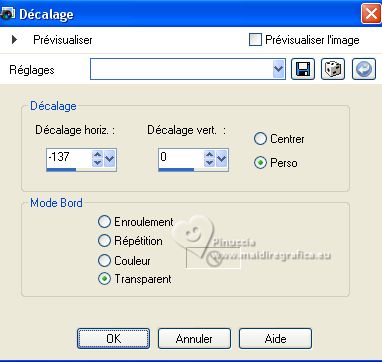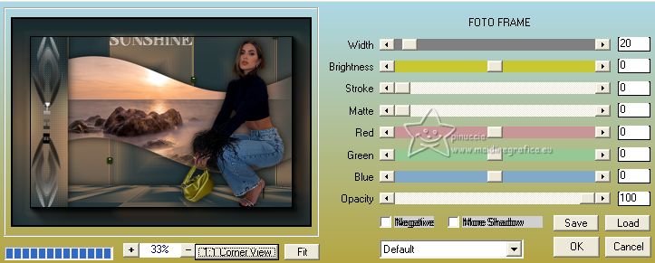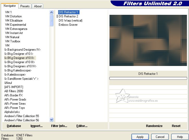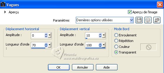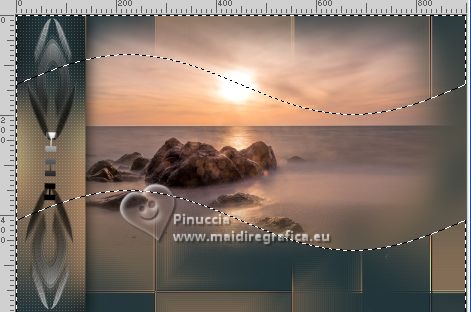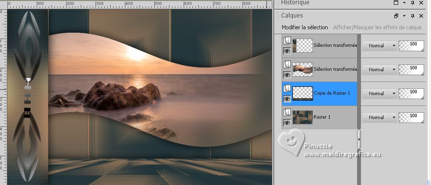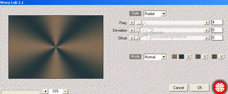 Pour traduire ce tutoriel, créé avec PSP2020, j'ai utilisé PSPX7, mais il peut également être exécuté avec les autres versions. Suivant la version utilisée, vous pouvez obtenir des résultats différents. Depuis la version X4, la fonction Image>Miroir a été remplacée par Image>Renverser horizontalement, et Image>Renverser avec Image>Renverser verticalement . Dans les versions X5 et X6, les fonctions ont été améliorées par la mise à disposition du menu Objets. Avec la nouvelle version X7, nous avons encore Image>Miroir et Image>Renverser/Retourner, mais avec nouvelles différences. Voir les détails à ce sujet ici Certaines dénominations ont changées entre les versions de PSP. Les plus frequentes dénominations utilisées: ![]() traduction italienne ici Vos versions iciNécessaire pour réaliser ce tutoriel: Déco à choix Matériel ici Pour les tubes fournis merci Beatriz, NaiseM et Lana. Le reste du matériel est de Edith. (ici les liens vers les sites des créateurs de tubes) Modules Externes: consulter, si nécessaire, ma section des filtres ici Filters Unlimited 2.0 ici Mehdi - Wavy Lab 1.1 ici Mehdi - Sorting Tiles ici Mura's Meister - Perspective Tiling ici Carolaine and Sensibility - CS_Ldots ici AAA Frames - Foto Frame ici ![]() en fonction des couleurs utilisées, vous pouvez changer le mode mélange et l'opacité des calques. Dans les plus récentes versions de PSP, vous ne trouvez pas le dégradé d'avant plan/arrière plan ou Corel_06_029. Vous pouvez utiliser le dégradé des versions antérieures. Ici le dossier Dégradés de CorelX. ![]() Placer les sélections dans le dossier Sélections Placer le preset Emboss 3 dans le dossier Paramètres par défaut. 1. Ouvrir une nouvelle image transparente 900 x 600 pixels. Placer en avant plan la couleur #23363b, et en arrière plan la couleur #846d56. ![]() Préparer en avant plan un dégradé de premier plan/arrière plan, style Linéaire. ![]() Remplir l'image transparente du dégradé.2. Effets>Modules Externes>Mehdi - Wavy Lab 1.1. Ce filtre crée des dégradés avec les couleurs de votre palette: la premiére est la couleur d'arriére plan, la deuxiéme est la couleur d'avant plan. Garder les autres deux couleurs créées par le filtre ![]() 3. Effets>Modules Externes>Mehdi - Sorting Tiles. ![]() 4. Effets>Modules Externes>Filters Unlimited 2.0 - &<Bkg Designer sf10II> - DIS Refractor 1. ![]() 5. Effets>Filtre personnalisé - sélectionner le preset Emboss 3 et ok. ![]() Effets>Effets de bords>Accentuer. 6. Sélections>Charger/Enregistrer une sélection>Charger à partir du disque. Chercher et charger la sélection edith_1 ![]() Sélections>Transformer la sélection en calque. 7. Réglage>Flou>Flou gaussien - rayon 30. ![]() 8. Effets>Modules Externes>Carolaine and Sensibility - CS_LDots. ![]() Régalge>Netteté>Netteté. 9. Effets>Effets 3D>Ombre portée. ![]() Sélections>Désélectionner tout. 10. Ouvrir le tube Decor_nmcriacoes_39 ![]() Édition>Copier. Revenir sur votre travail et Édition>Coller comme nouveau calque. Déplacer le tube sur la forme.Réglage>Netteté>Netteté. Calques>Fusionner>Fusionner le calque de dessous. 11. Effets>Effets d'image>Décalage. ![]() Fermer ce calque pour le moment. 12. Vous positionner sur le calque Raster 1. Sélections>Charger/Enregistrer une sélection>Charger à partir du disque. Chercher et charger la sélection edith_2 ![]() Sélections>Transformer la sélection en calque. 13. Réglage>Flou>Flou gaussien - rayon 30. ![]() Sélections>Désélectionner tout. 14. Effets>Effets de distorsion>Vagues. ![]() 15. Re-ouvrir le calque fermé et rester positionner sur le calque Sélection transformée. Activer l'outil Baguette magique ![]() e cliquer dans la partie transparente pour la sélectionner. ![]() 16. Ouvrir le misted LD-misted landscape-206 ![]() Effacer le watermark et Édition>Copier. Revenir sur votre travail et Édition>Coller comme nouveau calque. Positionner le tube sur la forme.![]() Presser CANC sur le clavier ![]() Sélections>Désélectionner tout. Réglage>Netteté>Netteté. Calques>Fusionner>Fusionner le calque de dessous. 17. Effets>Effets 3D>Ombre portée. ![]() 18. Vous positionner à nouveau sur le calque Raster 1. Calques>Dupliquer. 19. Effets>Modules Externes>Mura's Meister - Perspective Tiling. ![]() Réglage>Netteté>Netteté. 20. Effets>Effets 3D>Ombre portée. ![]() 21. Vous devriez avoir ceci ![]() 22. Vous positionner sur le calque du haut de la pile. Ouvrir le tube de la femme 3811-woman-LB TUBES ![]() Édition>Copier. Revenir sur votre travail et Édition>Coller comme nouveau calque. Image>Miroir. Image>Redimensionner, à 90%, redimensionner tous les calques décoché. Déplacer le tube à droite.Réglage>Netteté>Netteté. Effets>Effets 3D>Ombre portée, à choix. 23. Ouvrir le texte texto ![]() Édition>Copier. Revenir sur votre travail et Édition>Coller comme nouveau calque. Déplacer le texte en haut au centre, voir mon exemple.24. Ouvrir le tube deco edith ![]() Édition>Copier. Revenir sur votre travail et Édition>Coller comme nouveau calque. 25. Effets>Effets d'image>Décalage. ![]() Réglage>Netteté>Netteté. 26. Image>Ajouter des bordures, 2 pixels, symétrique, couleur d'arrière plan. Image>Ajouter des bordures, 2 pixels, symétrique, couleur d'avant plan. Image>Ajouter des bordures, 2 pixels, symétrique, couleur d'arrière plan. 27. Sélections>Sélectionner tout. Image>Ajouter des bordures, 40 pixels, symétrique, couleur blanche. Sélections>Inverser. Remplir la sélection du dégradé.28. Sélections>Inverser. Effets>Effets 3D>Ombre portée. ![]() Sélections>Désélectionner tout. 29. Effets>Modules Externes>AAA Frames - Foto Frame. ![]() 30. Image>Ajouter des bordures, 2 pixels, symétrique, couleur d'arrière plan. Signer votre travail et enregistrer en jpg. Pour le tube de cette version merci Lady Valella, le misted est à moi. ![]() ![]() Si vous avez des problèmes, ou des doutes, ou vous trouvez un link modifié,