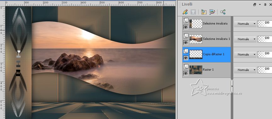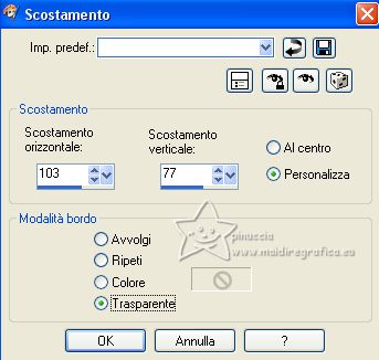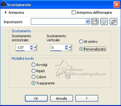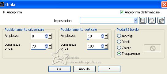 qui puoi trovare qualche risposta ai tuoi dubbi. Se l'argomento che ti interessa non è presente, ti prego di segnalarmelo. Questo tutorial è stato creato con PSP2020 e tradotto con CorelX7, ma può essere eseguito anche con le altre versioni di PSP. Dalla versione X4, il comando Immagine>Rifletti è stato sostituito con Immagine>Capovolgi in orizzontale, e il comando Immagine>Capovolgi con Immagine>Capovolgi in verticale. Nelle versioni X5 e X6, le funzioni sono state migliorate rendendo disponibile il menu Oggetti. Con la nuova versione X7, sono tornati Rifletti>Capovolgi, ma con nuove varianti. Vedi la scheda sull'argomento qui traduzione in francese/traduction en français qui/ici Versioni/Versions quiOccorrente: Un deco a scelta. Materiale qui Per i tubes forniti grazie Beatriz, NaiseM e Lana. Il resto del materiale è di Edith. (in questa pagina trovi i links ai siti dei creatori di tubes) Filtri: se hai problemi con i filtri, consulta la mia sezione filtri qui Filters Unlimited 2.0 qui &<Bkg Designer sf10II> - DIS Refractor 1 (da importare in Unlimited) qui Mehdi - Wavy Lab 1.1 qui Mehdi - Sorting Tiles qui Mura's Meister - Perspective Tiling qui Carolaine and Sensibility - CS_Ldots qui AAA Frames - Foto Frame qui ![]() non esitare a cambiare modalità di miscelatura e opacità secondo i colori utilizzati. Nelle ultime versioni di PSP non c'è il gradiente di primo piano/sfondo (Corel_06_029) Puoi usare i gradienti delle versioni precedenti. Trovi qui i gradienti Corel X. ![]() Metti le selezioni nella cartella Selezioni. Metti il preset Emboss 3 nella cartella Impostazioni predefinie. 1. Apri una nuova immagine trasparente 900 x 600 pixels. Imposta il colore di primo piano con #23363b, e il colore di sfondo con #846d56. ![]() Passa il colore di primo piano a Gradiente di primo piano/sfondo, stile Lineare. ![]() Riempi l'immagine trasparente con il gradiente.2. Effetti>Plugins>Mehdi - Wavy Lab 1.1. Questo filtro crea gradienti con i colori della paletta; il primo è il colore di sfondo, il secondo quello di primo piano. Mantieni gli ultimi due colori creati dal filtro ![]() 3. Effetti>Plugins>Mehdi - Sorting Tiles. ![]() 4. Effetti>Plugins>Filters Unlimited 2.0 - &<Bkg Designer sf10II> - DIS Refractor 1. ![]() 5. Effetti>Filtro Definito dall'utente, seleziona il preset Emboss 3 e ok. ![]() Effetti>Effetti di bordo>Aumenta. 6. Selezione>Carica/Salva selezione>Carica selezione da disco. Cerca e carica la selezione edith_1 ![]() Selezione>Innalza selezione a livello. 7. Regola>Sfocatura>Sfocatura gaussiana - raggio 30. ![]() 8. Effetti>Plugins>Carolaine and Sensibility - CS_LDots. ![]() Regola>Messa a fuoco>Metti a fuoco. 9. Effetti>Effetti 3D>Sfalsa ombra. ![]() Selezione>Deseleziona. 10. Apri il tube Decor_nmcriacoes_39 ![]() Modifica>Copia. Torna al tuo lavoro e vai a Modifica>Incolla come nuovo livello. Posiziona il tube nella forma.Regola>Messa a fuoco>Metti a fuoco. Livelli>Unisci>Unisci giù. 11. Effetti>Effetti di immagine>Scostamento. ![]() Chiudi questo livello per il momento. 12. Attiva il livello Raster 1. Selezione>Carica/Salva selezione>Carica selezione da disco. Cerca e carica la selezione edith_2 ![]() Selezione>Innalza selezione a livello. 13. Regola>Sfocatura>Sfocatura gaussiana - raggio 30. ![]() Selezione>Deseleziona. 14. Effetti>Effetti di distorsione>Onda. ![]() 15. Riapri il livello Raster 1, e resta posizionato sul livello Selezione innalzata. Attiva lo strumento Bacchetta magica ![]() e clicca nella parte trasparente per selezionarla. ![]() 16. Apri il misted LD-misted landscape-206 ![]() Cancella il watermark e vai a Modifica>Copia. Torna al tuo lavoro e vai a Modifica>Incolla come nuovo livello. Posiziona il tube nella figura.![]() Premi sulla tastiera il tasto CANC ![]() Selezione>Deseleziona. Regola>Messa a fuoco>Metti a fuoco. Livelli>Unisci>Unisci giù. 17. Effetti>Effetti 3D>Sfalsa ombra. ![]() 18. Attiva nuovamente il livello Raster 1. Livelli>Duplica. 19. Effetti>Plugins>Mura's Meister - Perspective Tiling. ![]() Regola>Messa a fuoco>Metti a fuoco. 20. Effetti>Effetti 3D>Sfalsa ombra. ![]() 21. Dovresti avere questo: ![]() 22. Attiva il livello superiore. Apri il tube della donna 3811-woman-LB TUBES ![]() Modifica>Copia. Torna al tuo lavoro e vai a Modifica>Incolla come nuovo livello. Immagine>Rifletti. Immagine>Ridimensiona, al 90%, tutti i livelli non selezionato. Sposta il tube a destra.Regola>Messa a fuoco>Metti a fuoco. Effetti>Effetti 3D>Sfalsa ombra, a scelta. 23. Apri il testo texto ![]() Modifica>Copia. Torna al tuo lavoro e vai a Modifica>Incolla come nuovo livello. Sposta il testo in alto al centro, come nel mio esempio.24. Apri il tube deco edith ![]() Modifica>Copia. Torna al tuo lavoro e vai a Modifica>Incolla come nuovo livello. 25. Effetti>Effetti di immagine>Scostamento. ![]() Regola>Messa a fuoco>Metti a fuoco. 26. Immagine>Aggiungi bordatura, 2 pixels, simmetriche, colore di sfondo. Immagine>Aggiungi bordatura, 2 pixels, simmetriche, colore di primo piano. Immagine>Aggiungi bordatura, 2 pixels, simmetriche, colore di sfondo. 27. Selezione>Seleziona tutto. Immagine>Aggiungi bordatura, 40 pixels, simmetriche, colore bianco. Selezione>Inverti. Riempi la selezione con il gradiente.28. Selezione>Inverti. Effetti>Effetti 3D>Sfalsa ombra. ![]() Selezione>Deseleziona. 29. Effetti>Plugins>AAA Frames - Foto Frame. ![]() 30. Immagine>Aggiungi bordatura, 2 pixels, simmetriche, colore di sfondo. Firma il tuo lavoro e salva in formato jpg. Per i tubes di questo esempio grazie Lady Valella, il misted è mio. ![]() ![]() Puoi scrivermi se hai problemi o dubbi, o trovi un link che non funziona, o soltanto per un saluto. |