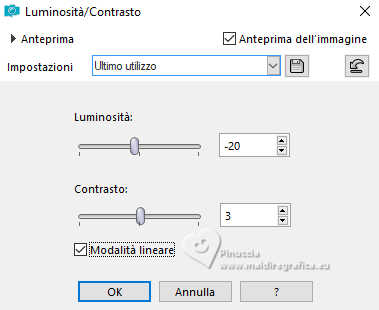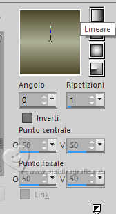 qui puoi trovare qualche risposta ai tuoi dubbi. Se l'argomento che ti interessa non è presente, ti prego di segnalarmelo. Questo tutorial è stato creato e tradotto con PSP2020, ma può essere eseguito anche con le altre versioni di PSP. Dalla versione X4, il comando Immagine>Rifletti è stato sostituito con Immagine>Capovolgi in orizzontale, e il comando Immagine>Capovolgi con Immagine>Capovolgi in verticale. Nelle versioni X5 e X6, le funzioni sono state migliorate rendendo disponibile il menu Oggetti. Con la nuova versione X7, sono tornati Rifletti>Capovolgi, ma con nuove varianti. Vedi la scheda sull'argomento qui traduzione in francese/traduction en français qui/ici Versioni/Versions quiOccorrente: Due tube a scelta. Il resto del materiale ![]() (in questa pagina trovi i links ai siti dei creatori di tubes) ![]() se hai problemi con i filtri, consulta la mia sezione filtri qui Filters Unlimited 2.0 qui Funhouse - Cirquelate qui I filtri Funhouse si possono usare da soli o importati in Filters Unlimited (come fare vedi qui) Se un filtro fornito appare con questa icona ![]() non esitare a cambiare modalità di miscelatura e opacità secondo i colori utilizzati. Nelle ultime versioni di PSP non c'è il gradiente di primo piano/sfondo (Corel_06_029) Puoi usare i gradienti delle versioni precedenti. Trovi qui i gradienti Corel X. ![]() Apri la maschera in PSP e minimizzala con il resto del materiale. 1. Apri una nuova immagine trasparente 950 x 650 pixels. Imposta il colore di primo piano con #4c4729, e il colore di sfondo con #aeb098. ![]() Passa il colore di primo piano a Gradiente di primo piano/sfondo, stile Lineare ![]() Riempi l'immagine trasparente con il gradiente.2. Selezione>Seleziona tutto. Apri il misted Misted_EdithS ![]() Modifica>Copia. Torna al tuo lavoro e vai a Modifica>Incolla nella selezione. Selezione>Deseleziona. 3. Effetti>Effetti di immagine>Motivo unico. ![]() 4. Regola>Sfocatura>Sfocatura gaussiana - raggio 30. ![]() 5. Effetti>Plugins>Filters Unlimited 2.0 - Funhouse - Cirquelate, con i settaggi standard. ![]() Regola>Messa a fuoco>Metti a fuoco. 6. Livelli>Nuovo livello raster. Riempi il livello con il colore chiaro di sfondo #aeb098.7. Livelli>Nuovo livello maschera>Da immagine. Apri il menu sotto la finestra di origine e vedrai la lista dei files aperti. Seleziona la maschera Narah_Abstract_132 ![]() Livelli>Unisci>Unisci gruppo. 8. Livelli>Duplica. Livelli>Unisci>Unisci giù. 9. Effetti>Effetti di bordo>Aumenta di più. 10. Effetti>Effetti 3D>Sfalsa ombra, colore nero #000000. ![]() 11. Apri il tuo misted e vai a Modifica>Copia. Torna al tuo lavoro e vai a Modifica>Incolla come nuovo livello. Posiziona il tube al centro della maschera.12. Livelli>Disponi>Sposta giù. Regola>Messa a fuoco>Metti a fuoco o Accentua messa a fuoco (come preferisci). 13. Apri il tube principale e vai a Modifica>copia. Torna al tuo lavoro e vai a Modifica>Incolla come nuovo livello. Immagine>Ridimensiona, se necessario. Regola>Messa a fuoco>Metti a fuoco. Sposta il tube a sinistra.Effetti>Effetti 3D>Sfalsa ombra, a scelta. 14. Livelli>Unisci>Unisci visibile. 15. Attiva lo strumento Selezione , rettangolo,e traccia un piccolo rettangolo del tuo tube ![]() 16. Modifica>Copia. Modifica>Incolla come nuova immagine. 17. Aggiungi dei bordi al quadretto come preferisci. O segui i punti da 21 a 25. Quando hai terminato: Modifica>Copia. 18. Torna al tuo lavoro. Selezione>Deselezione. Modifica>Incolla come nuovo livello. 19. Immagine>Ruota per gradi - 45 gradi a sinistra, tutti i livelli non selezionato. ![]() Sposta l'immagine in basso a destra, o come preferisci.Effetti>Effetti 3D>Sfalsa ombra, a scelta. 20. Apri il testo Texto_Edith ![]() Modifica>Copia. Torna al tuo lavoro e vai a Modifica>Incolla come nuovo livello. Sposta il testo in basso a sinistra, o come preferisci.21. Immagine>Aggiungi bordatura, 2 pixels, simmetriche, colore bianco #ffffff. Selezione>Seleziona tutto. Immagine>Aggiungi bordatura, 10 pixels, simmetriche, con un colore qualsiasi. 22. Effetti>Effetti di immagine>Motivo unico, con i settaggi standard. ![]() 23. Selezione>Inverti. Regola>Sfocatura>Sfocatura gaussiana - raggio 30. ![]() 24. Selezione>Inverti. Effetti>Effetti 3D>Sfalsa ombra, colore nero. ![]() Selezione>Deseleziona. 25. Immagine>Aggiungi bordatura, 2 pixels, simmetriche, colore nero. 26. Regola>Luminosità e contrasto>Luminosità e contrasto ![]() 27. Firma il tuo lavoro su un nuovo livello. Livelli>Unisci>Unisci tutto e salva in formato jpg. ![]() ![]() Puoi scrivermi se hai problemi o dubbi, o trovi un link che non funziona, o soltanto per un saluto. |