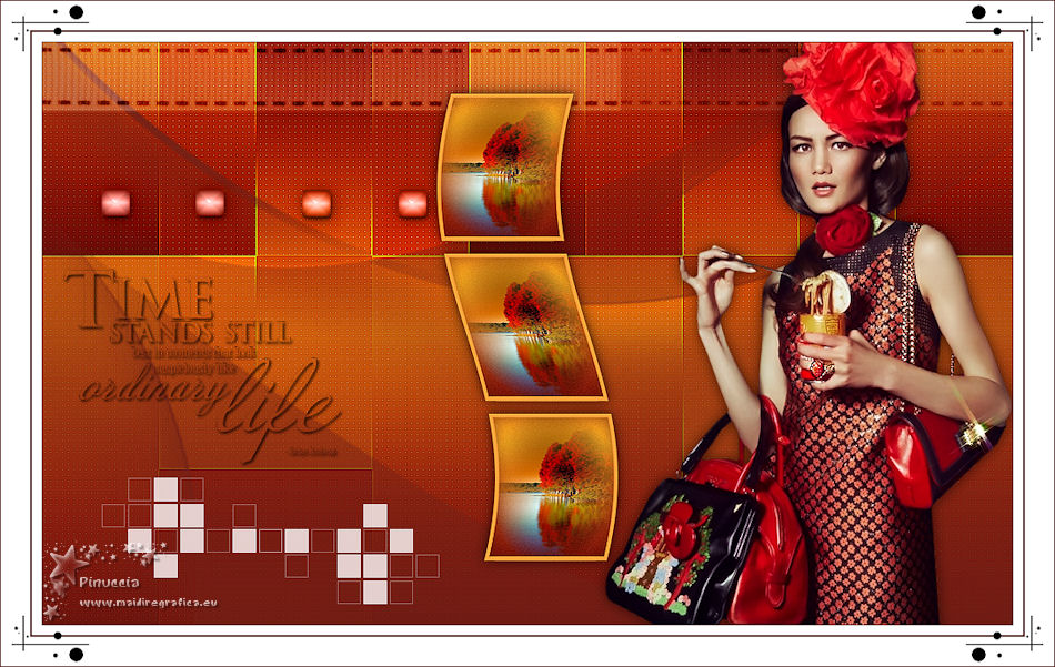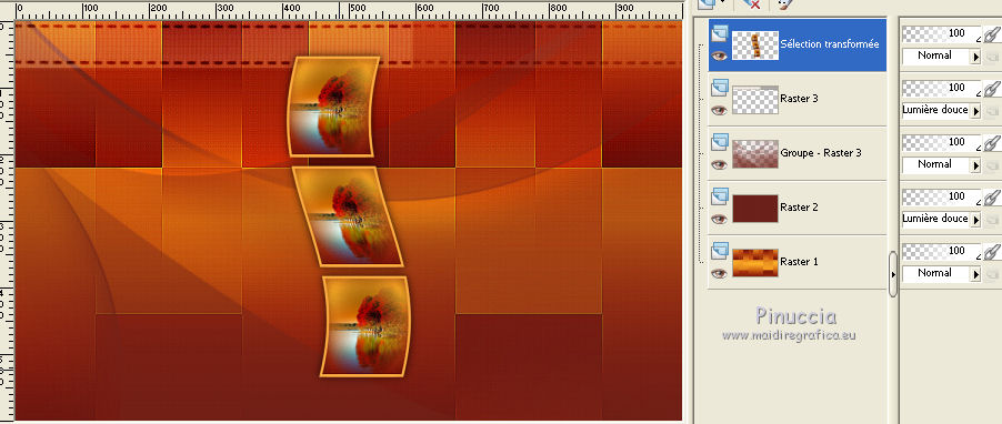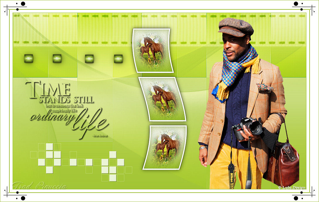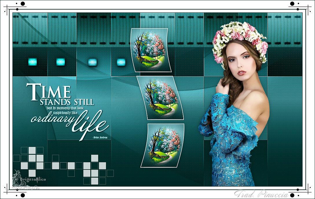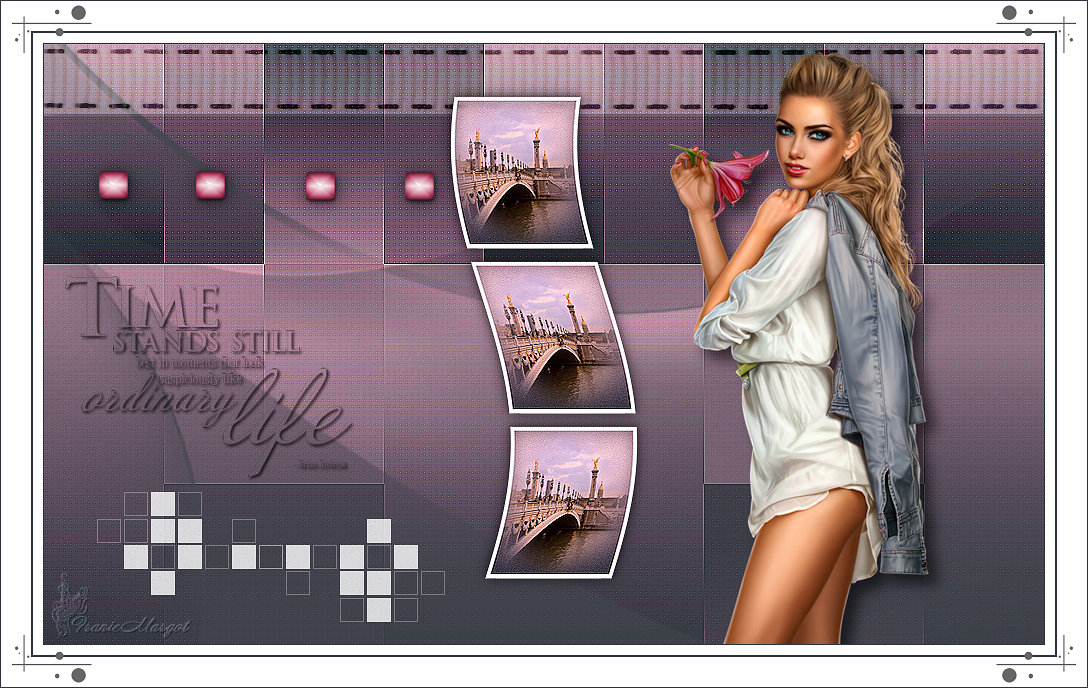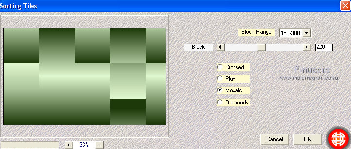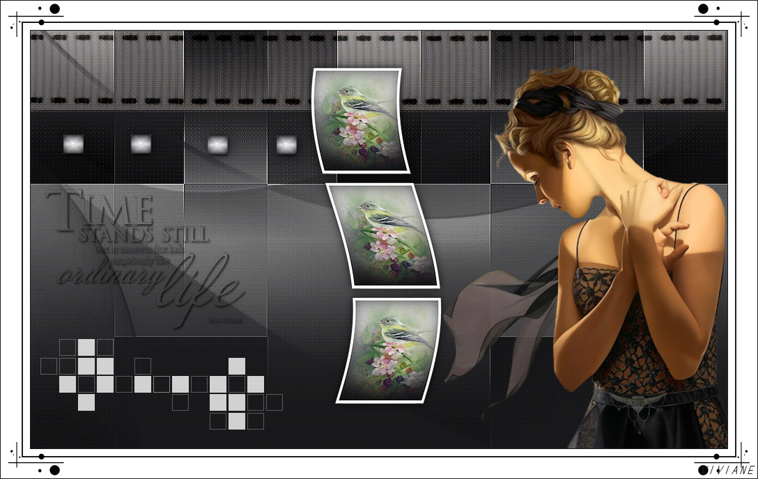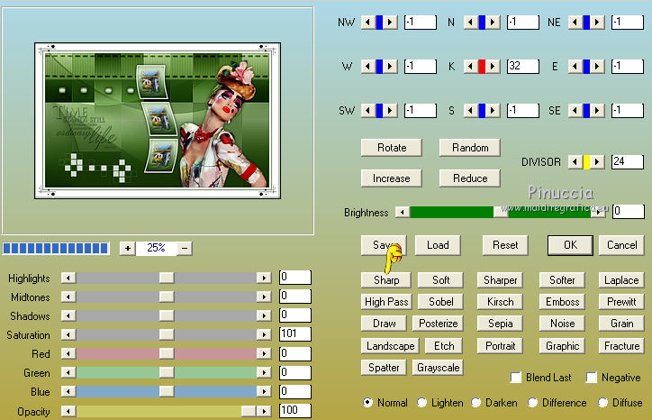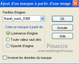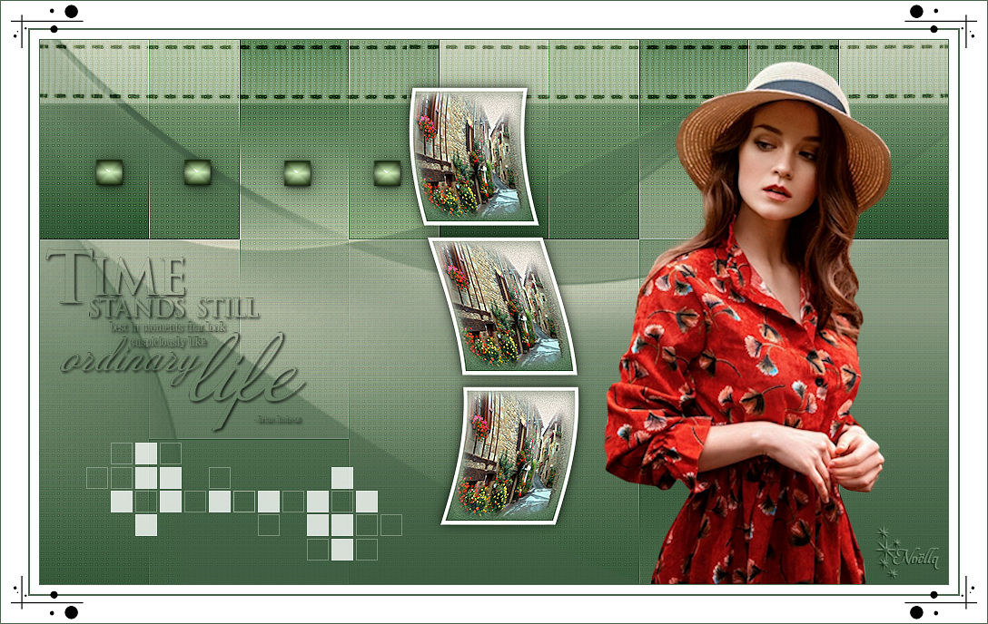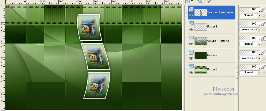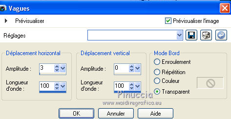 Pour traduire ce tutoriel j'ai utilisé CorelX12, mais il peut également être exécuté avec les autres versions. Suivant la version utilisée, vous pouvez obtenir des résultats différents. Depuis la version X4, la fonction Image>Miroir a été remplacée par Image>Renverser horizontalement, et Image>Renverser avec Image>Renverser verticalement . Dans les versions X5 et X6, les fonctions ont été améliorées par la mise à disposition du menu Objets. Avec la nouvelle version X7, nous avons encore Image>Miroir et Image>Renverser/Retourner, mais avec nouvelles différences. Voir les détails à ce sujet ici Certaines dénominations ont changées entre les versions de PSP. Les plus frequentes dénominations utilisées: ![]() Vos versions Nécessaire pour réaliser ce tutoriel: Tubes à choix Le reste du matériel ici Les tubes de ma version sont de Luz Cristina (ici les liens vers les sites des créateurs de tubes) Modules Externes: consulter, si nécessaire, ma section des filtres ici Mehdi - Sorting Tiles ici Carolaine and Sensibility - CS-LDots ici AAA Filters - Custom ici ![]() en fonction des couleurs utilisées, vous pouvez changer le mode mélange et l'opacité des calques. Dans les plus récentes versions de PSP, vous ne trouvez pas le dégradé d'avant plan/arrière plan ou Corel_06_029. Vous pouvez utiliser le dégradé des versions antérieures. Ici le dossier Dégradés de CorelX. Placer le preset dans le dossier Paramètres par défaut. Placer la sélection dans le dossier Sélections. Ouvrir le masque dans PSP et le minimiser avec le reste du matériel. 1. Ouvrir une nouvelle image transparente 1000 x 600 pixels. 2. Placer en avant plan la couleur #1d3909, et en arrière plan la couleur #e0fc7f. ![]() Préparer en avant plan un dégradé de premier plan/arrière plan, style Linéaire. ![]() Remplir l'image transparente du dégradé.3. Effets>Modules Externes>Sorting Tiles ![]() 4. Calques>Dupliquer. Image>Miroir. Placer le calque en mode Lumière douce. 5. Calques>Fusionner>Fusionner le calque de dessous. Effets>Effets de bords>Accentuer davantage. 6. Placer en avant plan la Couleur. Calques>Nouveau calque raster. Remplir le calque avec la couleur d'avant plan.7. Effets>Modules Externes>Carolaine and Sensibility - CS-LDots, par défaut. ![]() 8. Placer le calque en mode Lumière douce. Effets>Effets de bords>Accentuer davantage. 9. Calques>Nouveau calque raster. Remplir le calque avec la couleur d'avant plan.10. Calques>Nouveau calque de masque>A partir d'une image. Ouvrir le menu deroulant sous la fenêtre d'origine et vous verrez la liste des images ouvertes. Sélectionner le masque Narah_Mask_0388. ![]() Calques>Fusionner>Fusionner le groupe. 10. Effets>Filtre personnalisé - Sélectionner le preset Emboss 3 et ok. ![]() 11. Ouvrir Deco_1 - Édition>Copier. Revenir sur votre travail et Édition>Coller comme nouveau calque. Placer le calque en mode Lumière douce. Déplacer le tube en haut, voir mon exemple.pour ma deuxième version, j'ai redimensionner le tube à 60%, dupliquer et positionner ![]() 12. Vous positionner sur le calque Raster 1. Sélections>Charger/Enregistrer une sélection>Charger à partir du disque. Chercher et charger la sélection Time ![]() Sélections>Transformer la sélection en calque. Calques>Agencer>Placer en haut de la pile. 13. Réglage>Flou>Flou gaussien - rayon 20. ![]() 14. Réglage>Ajouter/Supprimer du bruit>Ajouter du bruit. ![]() Réglage>Netteté>Netteté Davantage. 15. Ouvrir le misted et Édition>Copier. Revenir sur votre travail et Édition>Coller dans la sélection. 16. Effets>Effets 3D>Ombre portée, couleur noire #000000. ![]() 17. Sélections>Modifier>Sélectionner les bordures de la sélection. ![]() 18. Placer en arrière plan la couleur #ffffff. Calques>Nouveau calque raster. Remplir le calque avec la couleur #ffffff.Sélections>Désélectionner tout. Calques>Fusionner>Fusionner le calque de dessous. 19. Image>Redimensionner, à 40%, redimensionner tous les calques décoché. Calques>Dupliquer. 20. Effets>Effets d'image>Décalage. ![]() 21. Vous positionner à nouveau sur le calque sélection transformée. Calques>Dupliquer. 22. Effets>Effets d'image>Décalage. ![]() 23. Vous positionner sur le calque du haut de la pile. Calques>Fusionner>Fusionner le calque de dessous - 2 fois. 24. Effets>Effets de distorsion>Vagues. ![]() Réglage>Netteté>Netteté. 25. Effets>Effets 3D>Ombre portée, comme précédemment. ![]() 26. Effets>Effets d'image>Décalage. ![]() ![]() si vous utilisez l'effet Décalage avant d'appliquer l'Effet Vagues, le résultat sera un peu différent ![]() 27. Ouvrir le texte - Édition>Copier. Revenir sur votre travail et Édition>Coller comme nouveau calque. Déplacer le texte à gauche.Placer le calque en mode Multiplier, ou autre. 28. Ouvrir Deco_2 - Édition>Copier. Revenir sur votre travail et Édition>Coller comme nouveau calque. Déplacer le tube en bas à gauche.Garder l'opacité de ce calque à 80. 29. Ouvrir le tube principal - Édition>Copier. Revenir sur votre travail et Édition>Coller comme nouveau calque. Image>Redimensionner et positionner à votre convenance. Effets>Effets 3D>Ombre portée, à choix. 30. Image>Ajouter des bordures, 1 pixel, symétrique, couleur d'avant plan #1d3909. Image>Ajouter des bordures, 10 pixels, symétrique, couleur #ffffff. Image>Ajouter des bordures, 2 pixels, symétrique, couleur #1d3909. Image>Ajouter des bordures, 30 pixels, symétrique, couleur #ffffff. Image>Ajouter des bordures, 1 pixel, symétrique, couleur #1d3909. 31. Ouvrir Deco_3 - Édition>Copier. Revenir sur votre travail et Édition>Coller comme nouveau calque. 32. Ouvrir Deco_4 - Édition>Copier. Revenir sur votre travail et &EacutE;dition>Coller comme nouveau calque. Déplacer le tube à gauche, voir mon exemple.33. Calques>Fusionner>Calques visibles. 34. Effets>Modules Externes>AAA Filters Custom - Cliquer sur Sharp et ok. ![]() 35. Signer votre travail sur un nouveau calque. Calques>Fusionner>Tou