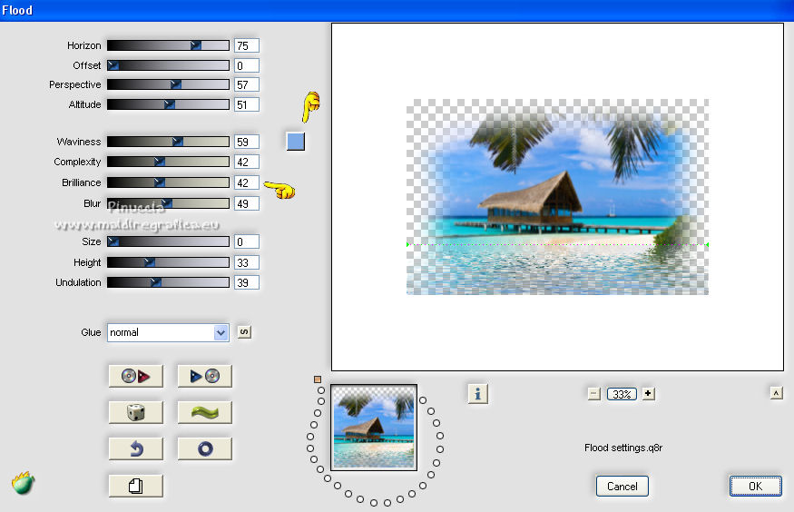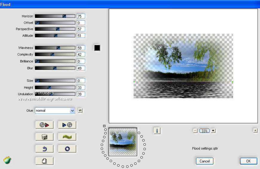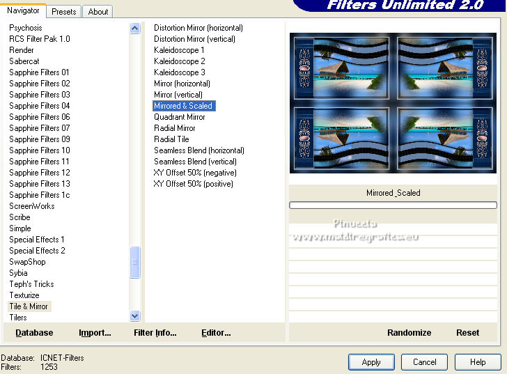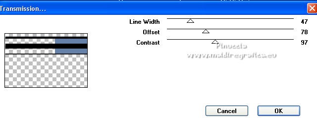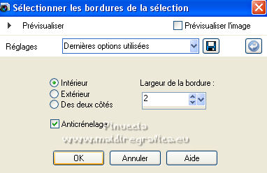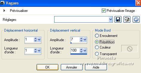 Pour traduire ce tutoriel j'ai utilisé CorelX12, mais il peut également être exécuté avec les autres versions. Suivant la version utilisée, vous pouvez obtenir des résultats différents. Depuis la version X4, la fonction Image>Miroir a été remplacée par Image>Renverser horizontalement, et Image>Renverser avec Image>Renverser verticalement . Dans les versions X5 et X6, les fonctions ont été améliorées par la mise à disposition du menu Objets. Avec la nouvelle version X7, nous avons encore Image>Miroir et Image>Renverser/Retourner, mais avec nouvelles différences. Voir les détails à ce sujet ici Certaines dénominations ont changées entre les versions de PSP. Les plus frequentes dénominations utilisées: ![]() traduction italienne ici Vos versions iciNécessaire pour réaliser ce tutoriel: Un tube et un misted à choix Le reste du matériel ici Pour les tubes merci Jewel. (ici les liens vers les sites des créateurs de tubes) Modules Externes: consulter, si nécessaire, ma section des filtres ici Filters Unlimited 2.0 ici Tramages - Wee Scratches ici VM Extravaganza - Transmission ici Carolaine and Sensibility - CS-LDots ici Flaming Pear - Flood ici AAA Filters - Foto Frame ici Filtres Tramages et VM Extravaganza peuvent être utilisés seuls ou importés dans Filters Unlimited. voir comment le faire ici). Si un filtre est fourni avec cette icône, ![]() en fonction des couleurs utilisées, vous pouvez changer le mode mélange et l'opacité des calques. ![]() Placer les sélections dans le dossier Sélections. 1. Placer en avant plan la couleur #042046, et en arrière plan la couleur #aec1d6. ![]() Ouvrir une nouvelle image transparente 1000 x 650 pixels. Remplir l'image transparente avec la couleur d'avant plan #042046.2. Sélections>Sélectionner tout. Ouvrez votre misted et Édition>Copier. Revenir sur votre travail et Édition>Coller dans la sélection. Sélections>Désélectionner tout. 3. Effets>Effets d'image>Mosaïque sans jointures, par défaut. ![]() 4. Réglage>Flou>Flou gaussien - rayon 30. ![]() 5. Effets>Modules Externes>Tramages - Wee Scratches. ![]() Réglage>Netteté>Netteté. Fermer le calque Raster 1. 6. Calques>Nouveau calque raster. Sélections>Charger/Enregistrer une sélection>Charger à partir du disque. Chercher et charger la sélection selwave_1. ![]() Remplir la sélection avec la couleur d'avant plan #042046.7. Effets>Effets de textures>Texture - Peu de serpent ou Corel_15_046. ![]() 8. Sélections>Modifier>Sélectionner les bordures de la sélection. ![]() Calques>Nouveau calque rasetr. Remplir avec la couleur d'arrière plan #aec1d6.9. Effets>Effets 3D>Biseautage intérieur. ![]() Calques>Fusionner>Fusionner le calque de dessous. Sélections>Désélectionner tout. 10. Effets>Effets 3D>Ombre portée. ![]() 11. Calques>Nouveau calque raster. Sélections>Charger/Enregistrer une sélection>Charger à partir du disque. Chercher et charger la sélection selwave_2. ![]() Remplir la sélection avec la couleur d'avant plan.12. Effets>Modules Externes>VM Extravaganza - Transmission. ![]() 13. Effets>Effets de distorsion>Vagues. ![]() 14. Effets>Modules Externes>Carolaine and Sensibility - CS_LDots. ![]() Réglage>Netteté>Netteté. 15. Effets>Effets 3D>Ombre portée. ![]() 16. Calques>Agencer>Déplacer vers le bas. ![]() 17. Vous positionner sur le calque du haut de la pile. Ouvrir le tube Deco Wave et Édition>Copier. Revenir sur votre travail et Édition>Coller comme nouveau calque. Effets>Effets d'image>Décalage. ![]() 18. Reouvrir et vous positionner sur le calque Raster 1. Calques>Nouveau calque raster. Sélections>Sélectionner tout. Activez à nouveau votre misted et Édition>Copier. Revenir sur votre travail et Édition>Coller dans la sélection. Sélections>Désélectionner tout. 19. Effets>Modules Externes>Flaming Pear - Flood ![]() Adapter les réglages à votre tube; pour mon exemple j'ai sélectionné une couleur de l'image et j'ai placé Brilliance à 42. ![]() Placer le calque en mode Luminance (héritée) ou selon votre tube et vos couleurs. 20. Vous positionner sur le calque du haut de la pile. Ouvrir le tube Thingyamauvethingy et Édition>Copier. Revenir sur votre travail et Édition>Coller comme nouveau calque. Effets>Effets d'image>Décalage, comme précédemment. ![]() 21. Effets>Effets 3D>Ombre portée. ![]() Réglage>Netteté>Netteté. 22. Calques>Fusionner>Calques visibles. 23. Effets>Modules Externes>AAA Frames - Foto Frame. ![]() 24. Édition>Copier. 25. Image>Ajouter des bordures, 1 pixel, symétrique, couleur foncée. Image>Ajouter des bordures, 10 pixels, symétrique, couleur claire. Image>Ajouter des bordures, 1 pixel, symétrique, couleur foncée. 26. Sélections>Sélectionner tout. Image>Ajouter des bordures, 40 pixels, symétrique, couleur blanche #ffffff. 27. Sélections>Inverser. Édition>Coller dans la sélection. 28. Réglage>Flou>Flou gaussien - rayon 30. ![]() 29. Effets>Modules Externes>Graphics Plus - Cross Shadow, par défaut. ![]() 30. Effets>Modules Externes>Filters Unlimited 2.0 - Tile & Mirror - Mirrore & Scaled. ![]() Sélections>Désélectionner tout. 31. Ouvrez votre tube et Édition>Copier. Revenir sur votre travail et Édition>Coller comme nouveau calque. Image>Redimensionner, à votre convenance, redimensionner tous les calques décoché. Positionner bien le tube.Effets>Effets 3D>Ombre portée, à choix. 32. Signer votre travail sur un nouveau calque. Calques>Fusionner>Tous. Image>Redimensionner, 1000 pixels de largeur, redimensionner tous les calques coché. Enregistrer en jpg. ![]() Si vous avez des problèmes, ou des doutes, ou vous trouvez un link modifié, ou wavement pour me dire que ce tutoriel vous a plu, vous pouvez m'écrire. 20 Février 2022 |